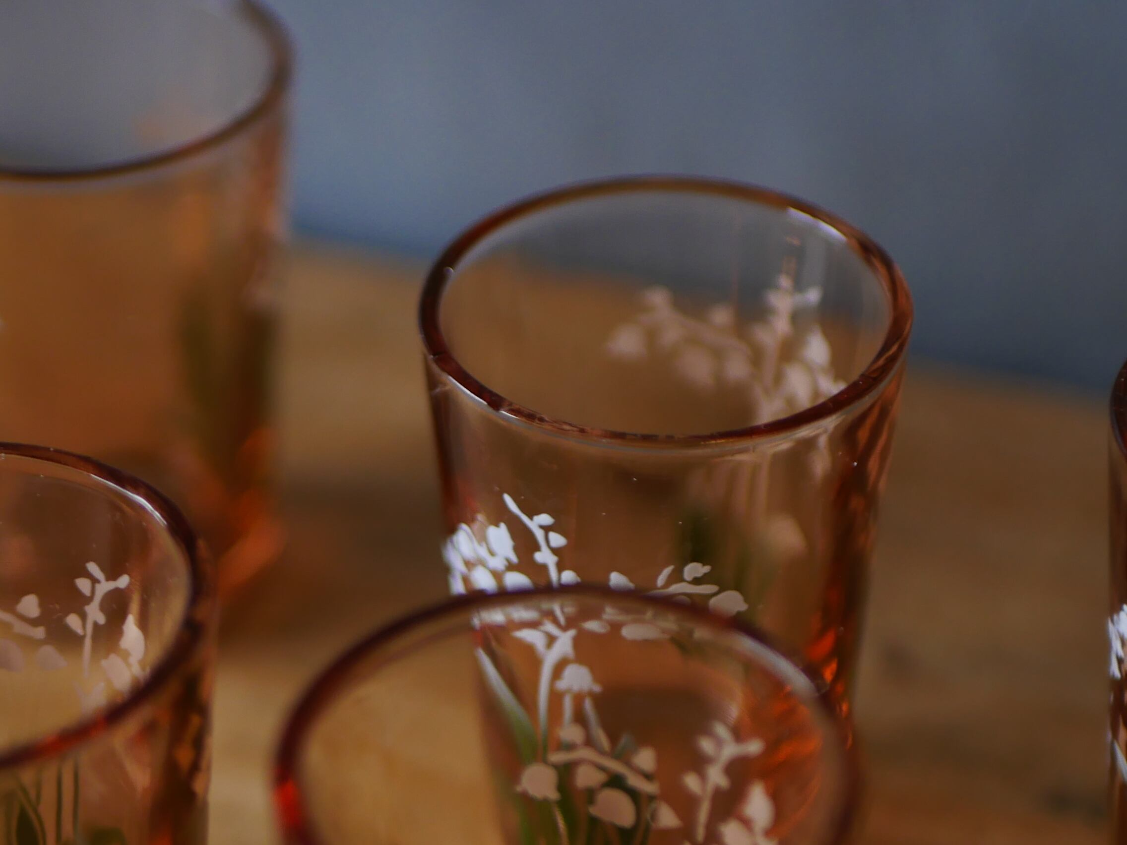 ピンクガラスの小さなリキュールグラス ミュゲ すずらん 鈴蘭 フランスヴィンテージ
