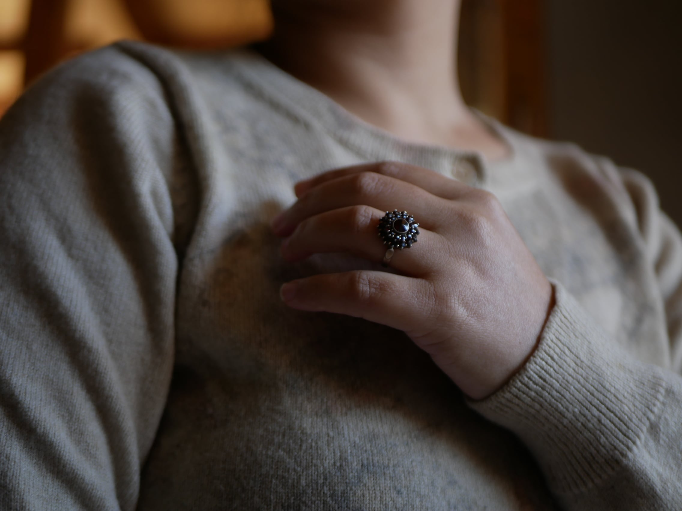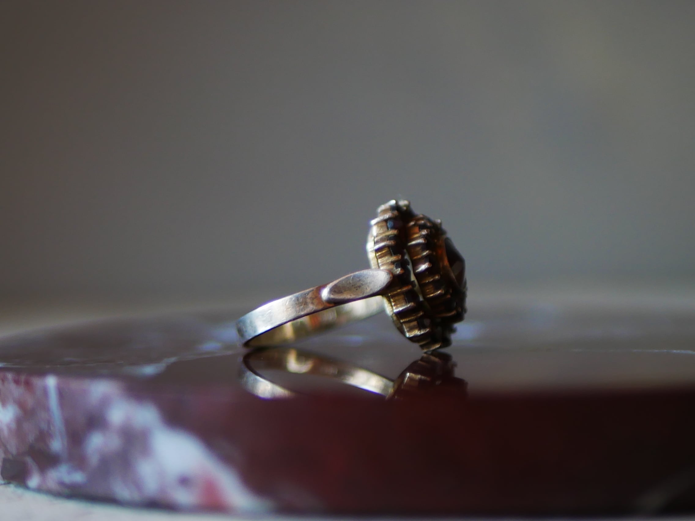 前に一度同じような雰囲気のガーネットリングをご紹介したことがありますが、こちらも上2段は指で触るとほんの少し動きます、そういうデザインだということです。