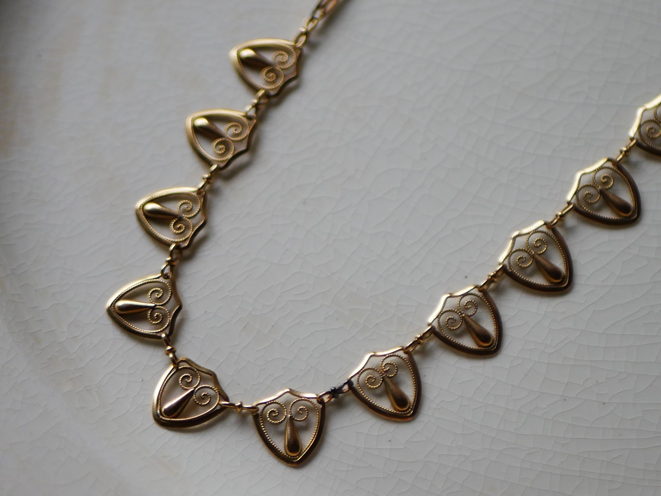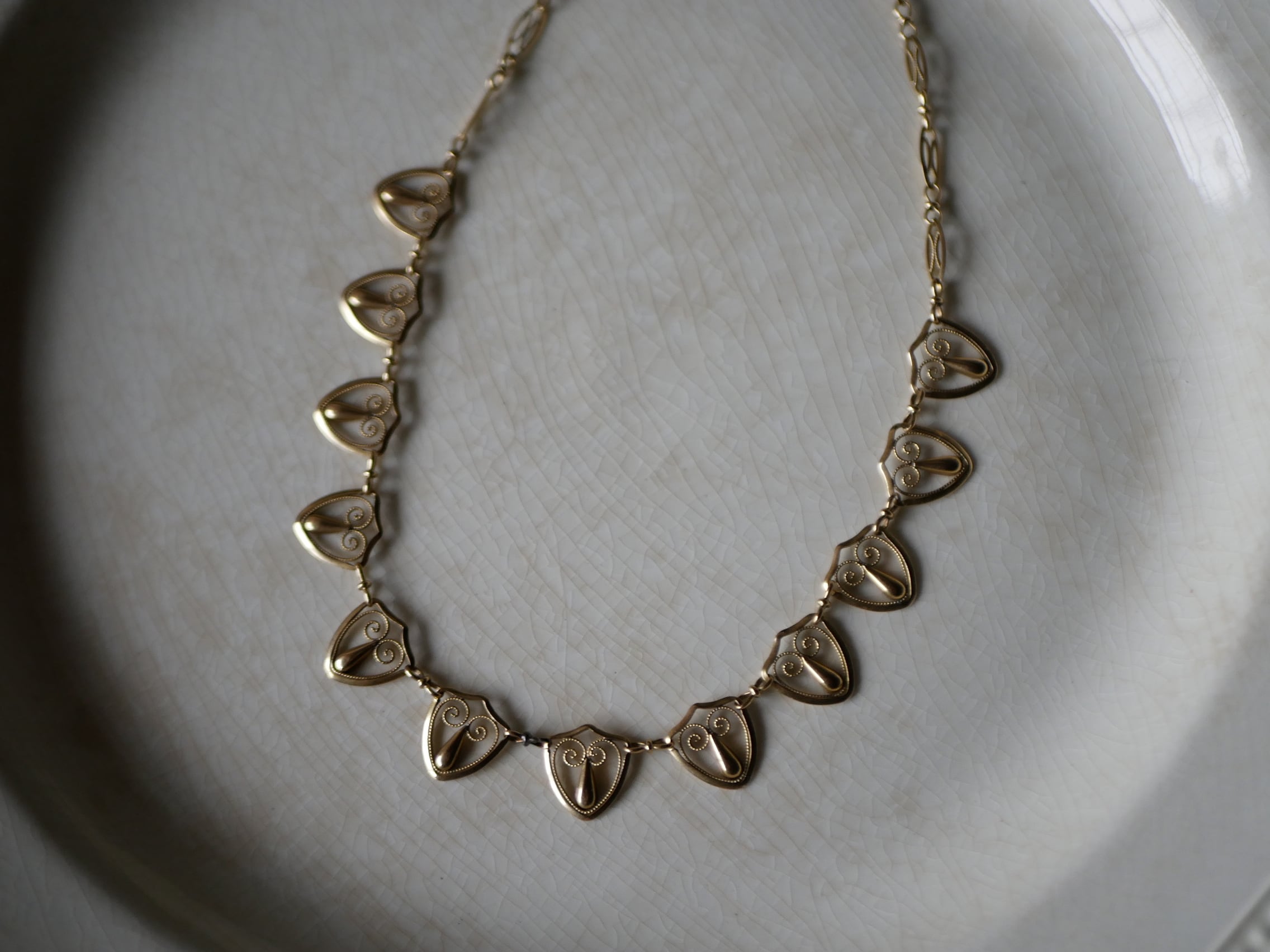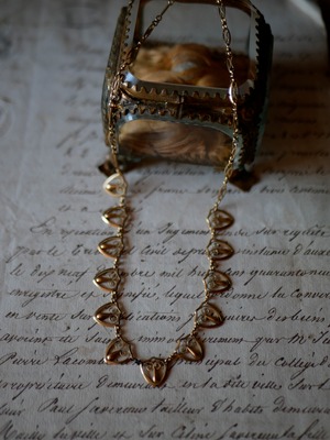 盾のような形をした透かし細工のモチーフが連なったネックレスは上品で華やかな気持ちにさせてくれます。