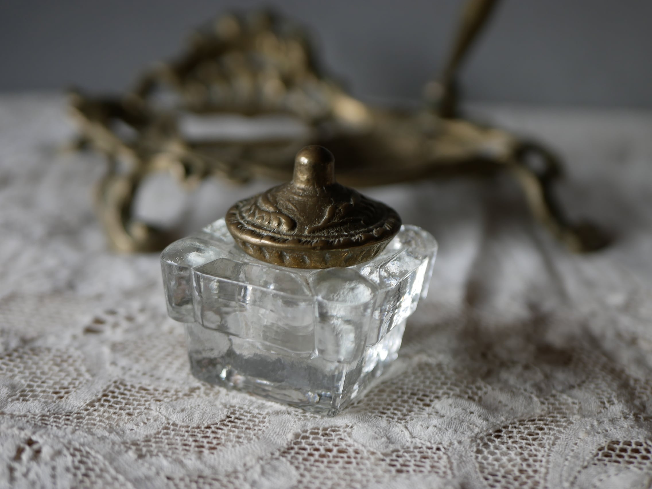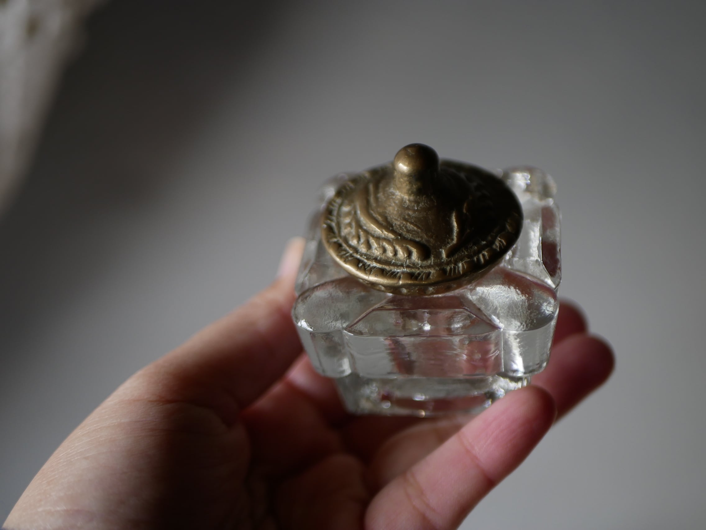 ぷっくりとしたガラスのインク瓶は取り外し可能で、欠けなどなく蓋も揃っています。