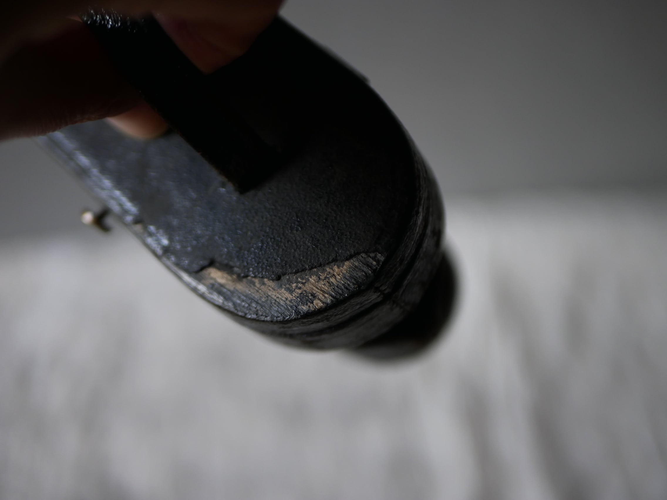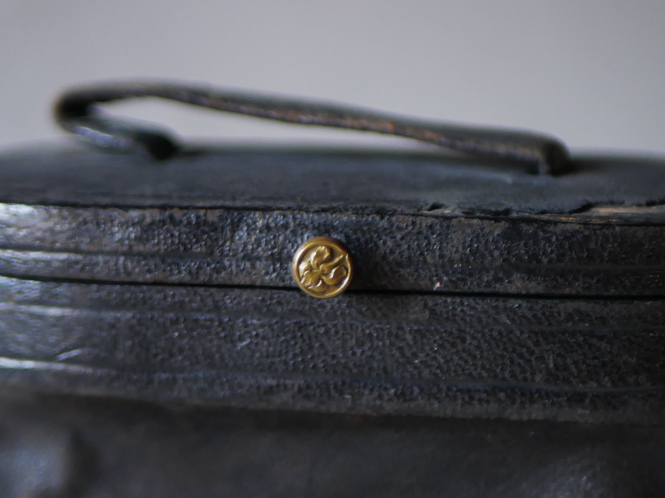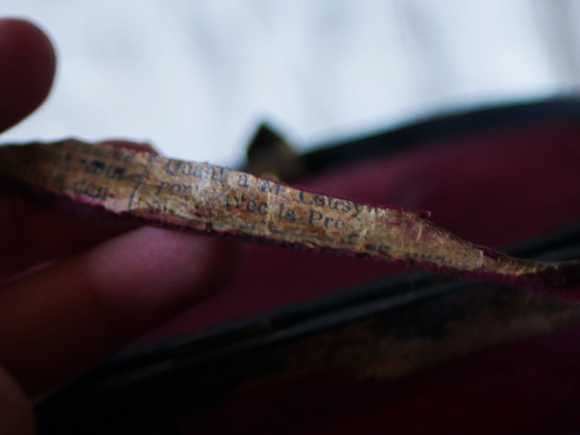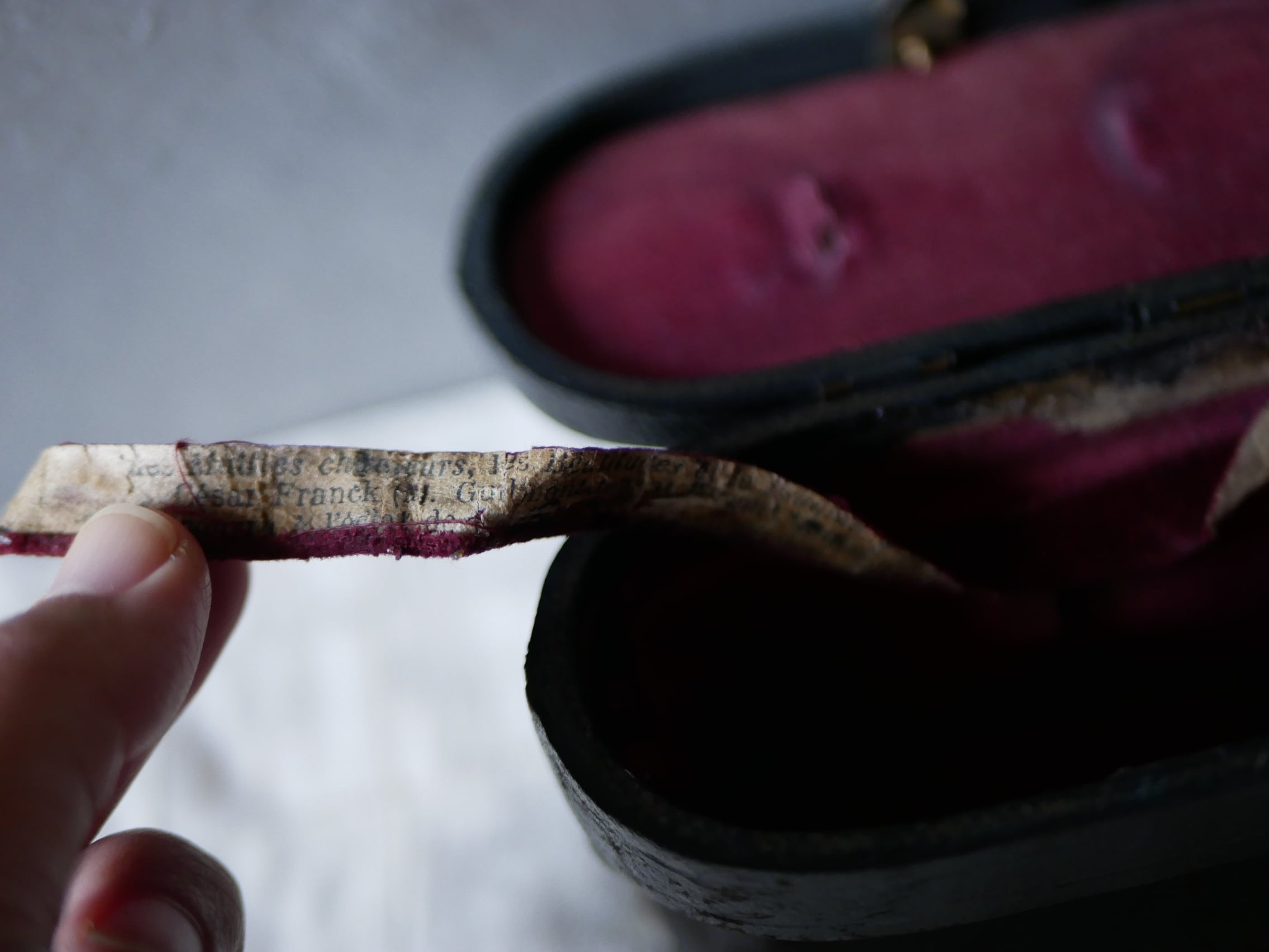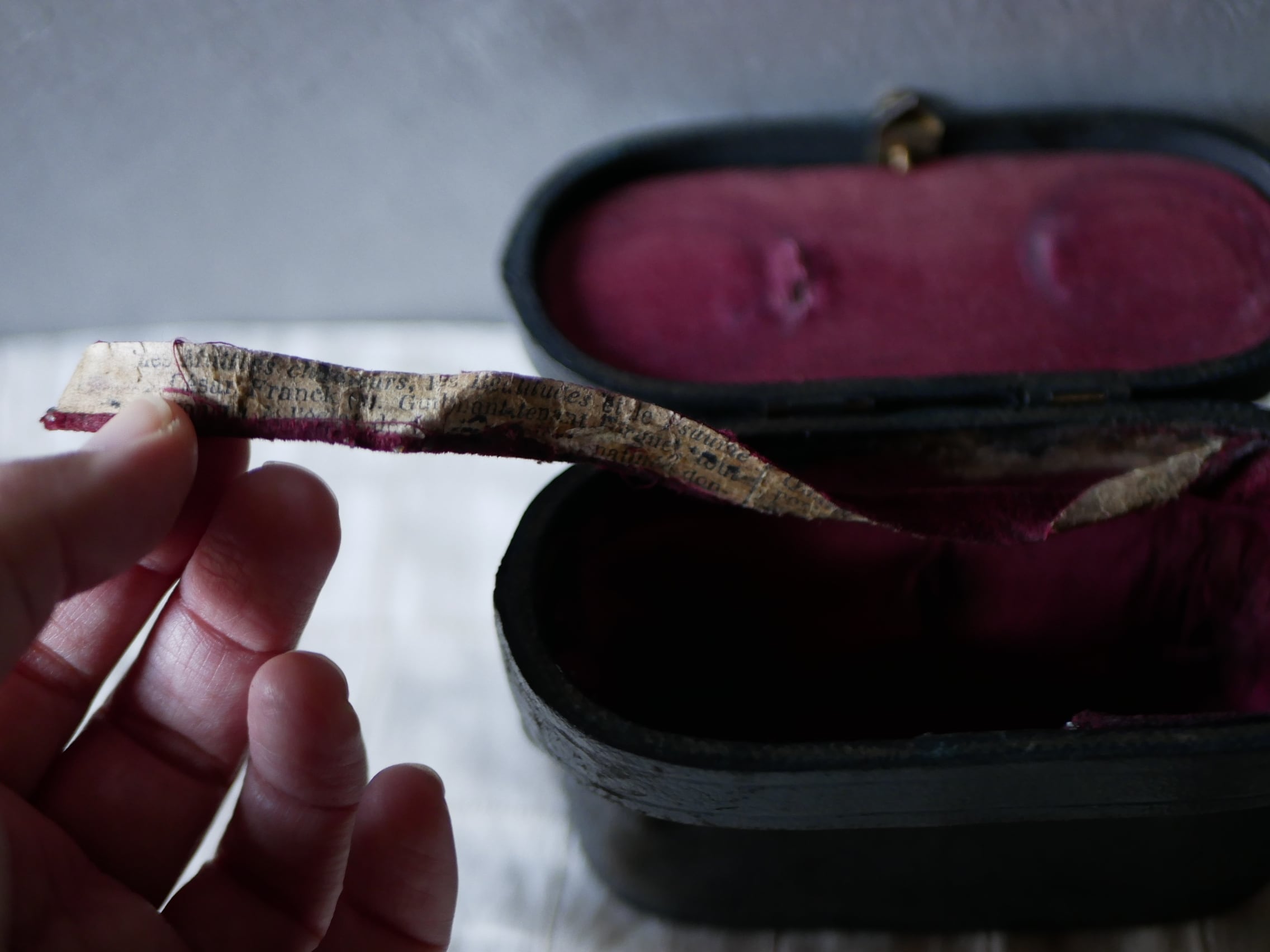 ケースの内布のリボンが剥がれて、裏にはフランス語の文字が見えます。