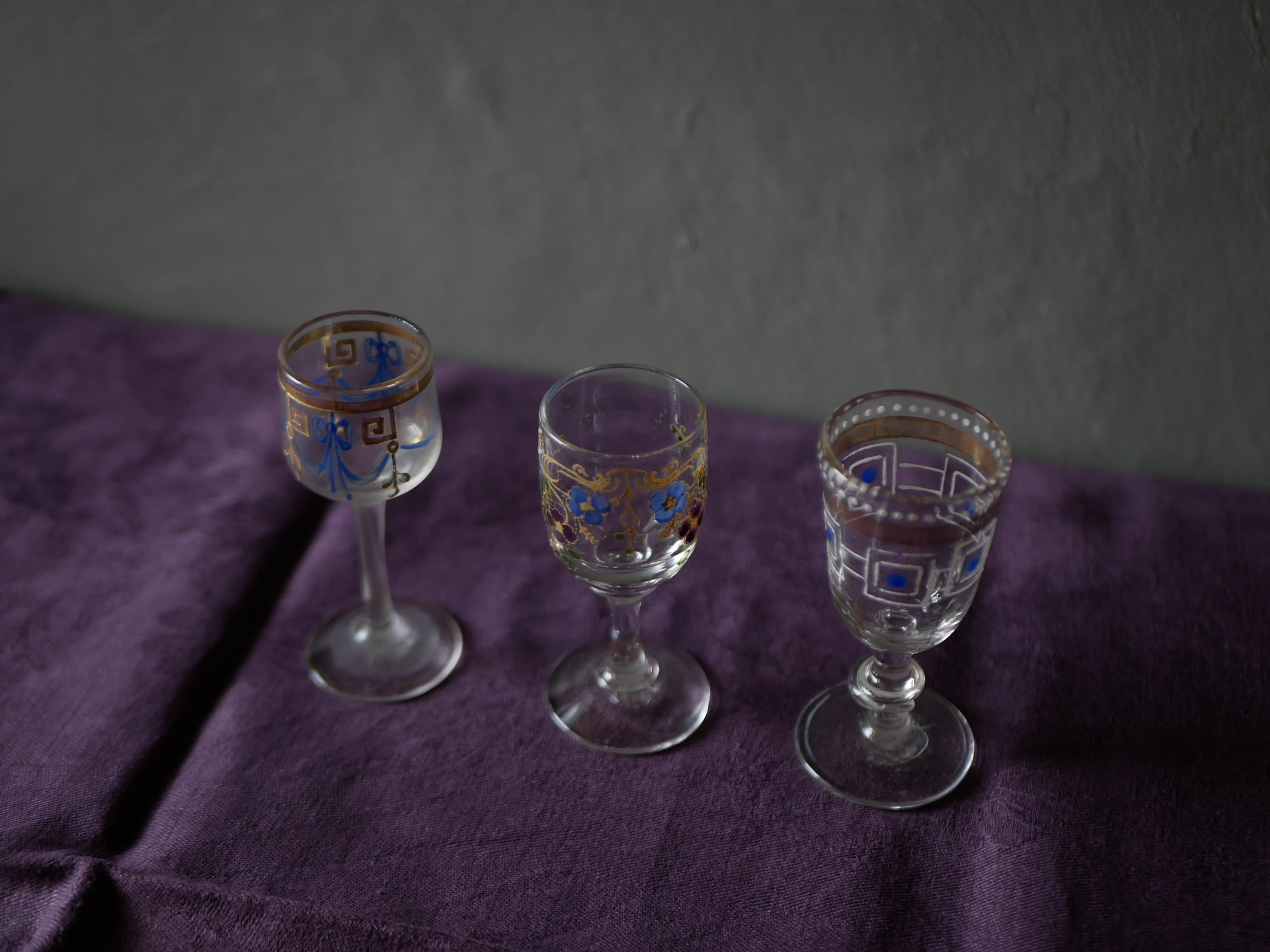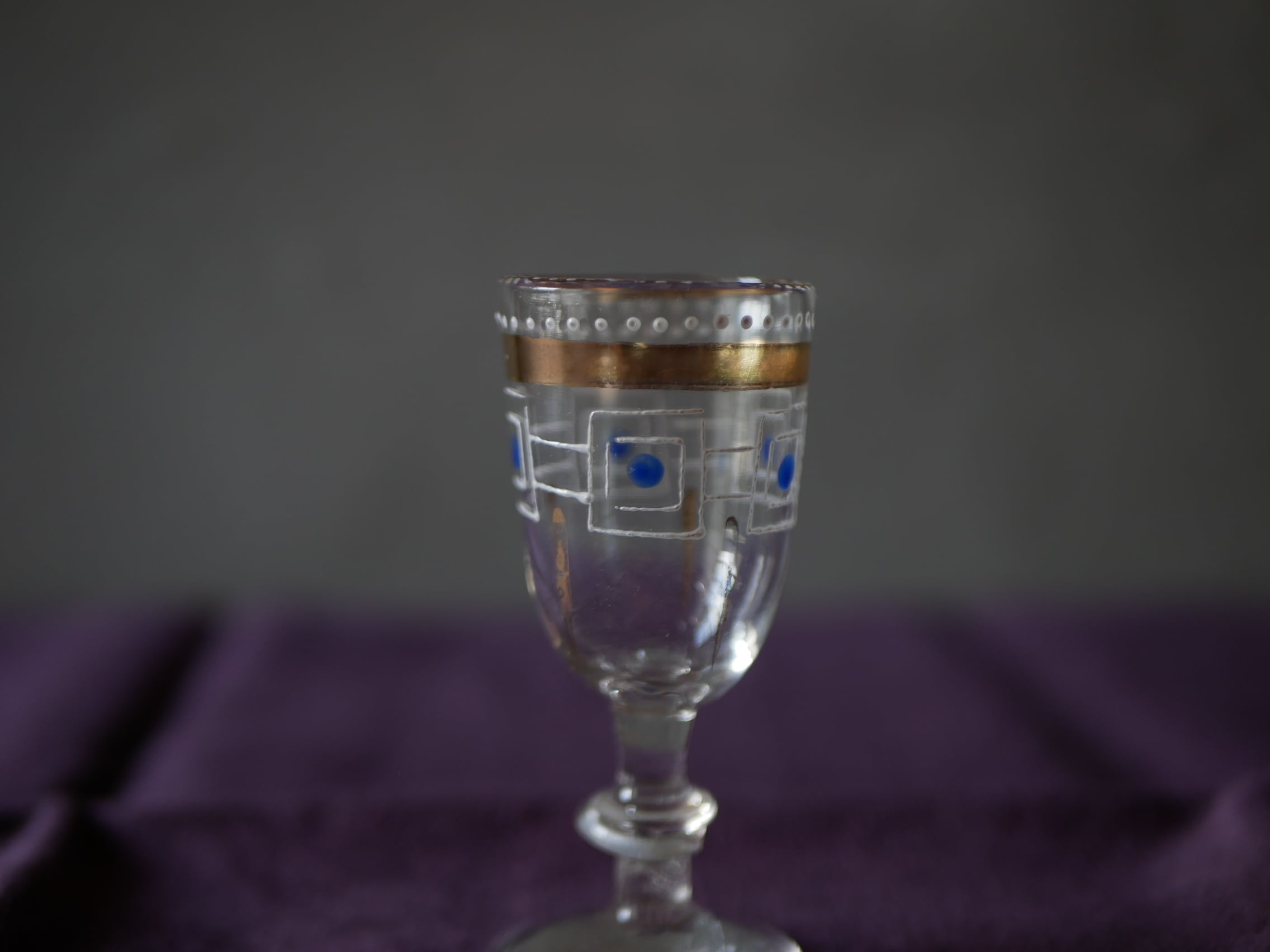 ゴールド、ブルー、ホワイトカラーのエナメル絵付けされた小さなリキュールグラスです。