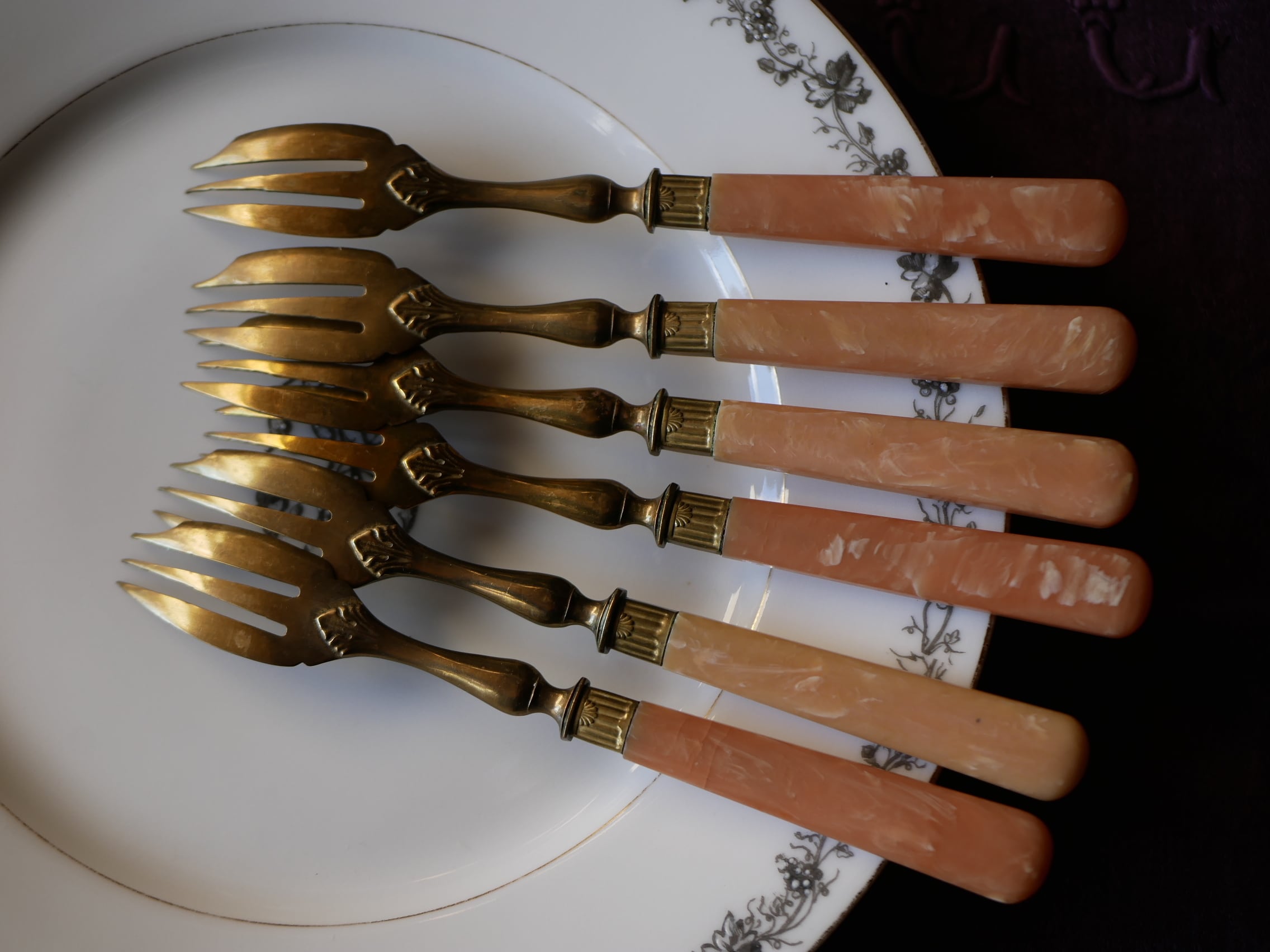 サーモンピンク色のハンドルが付いたデザートフォークです。