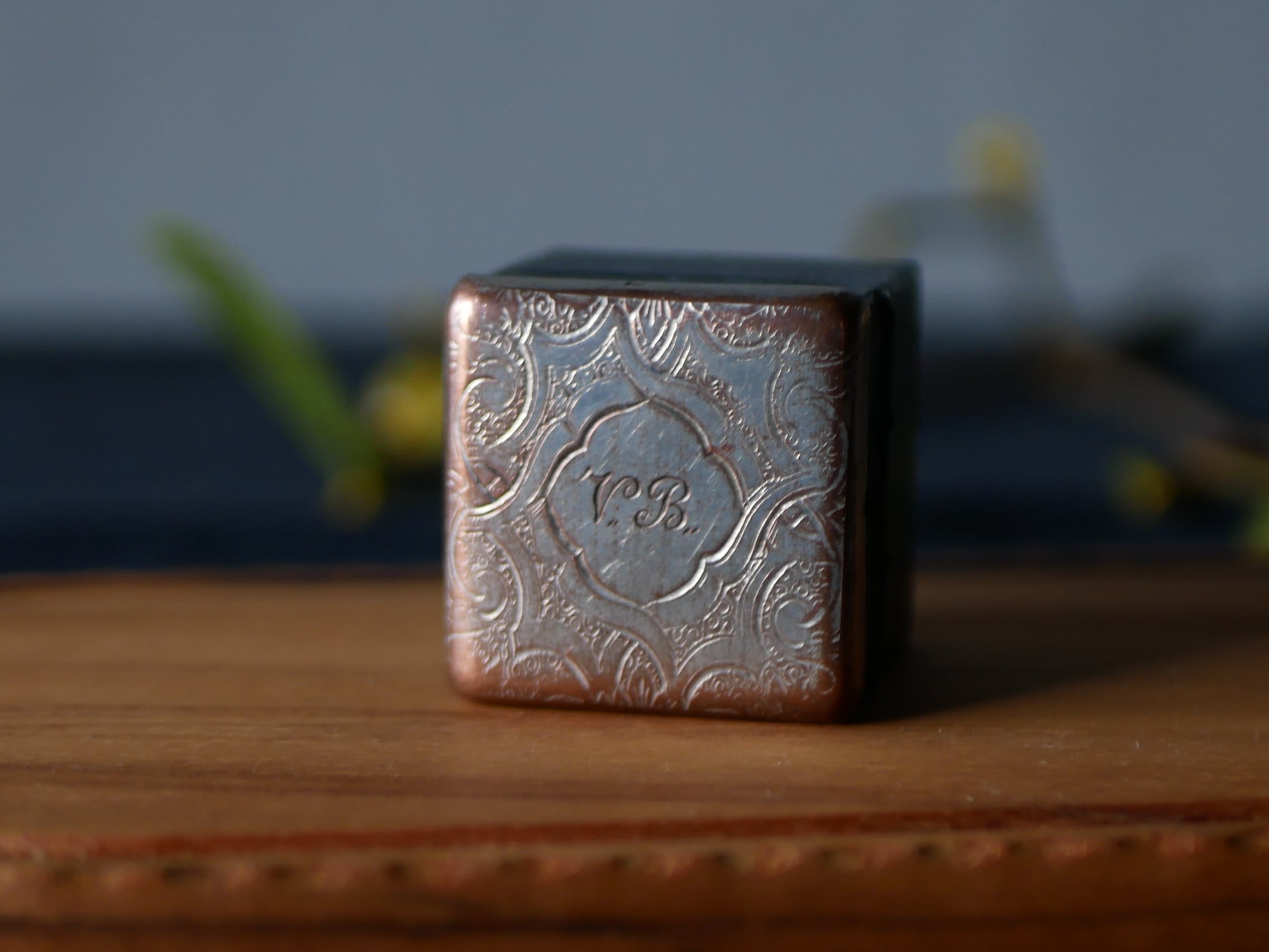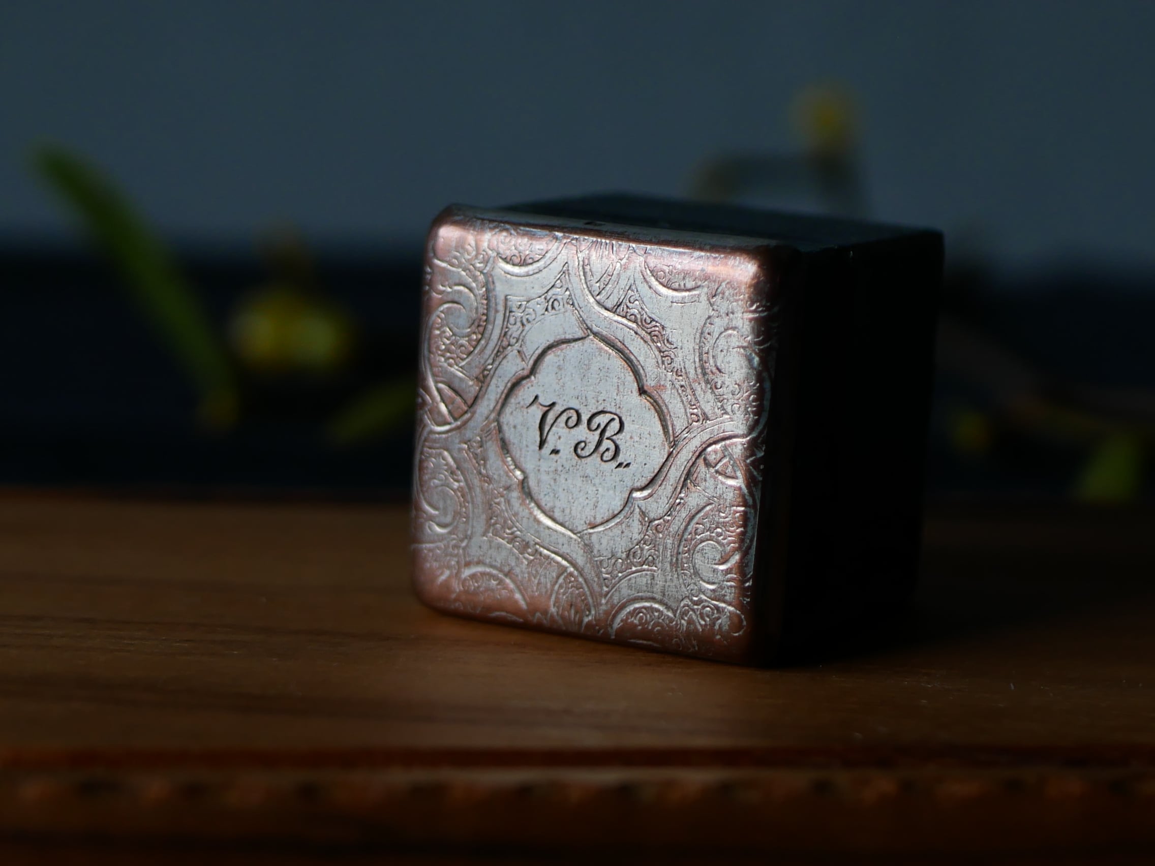 蓋にはV.B もしくは V.R のモノグラムとボタニカルなデザインが刻まれています。
