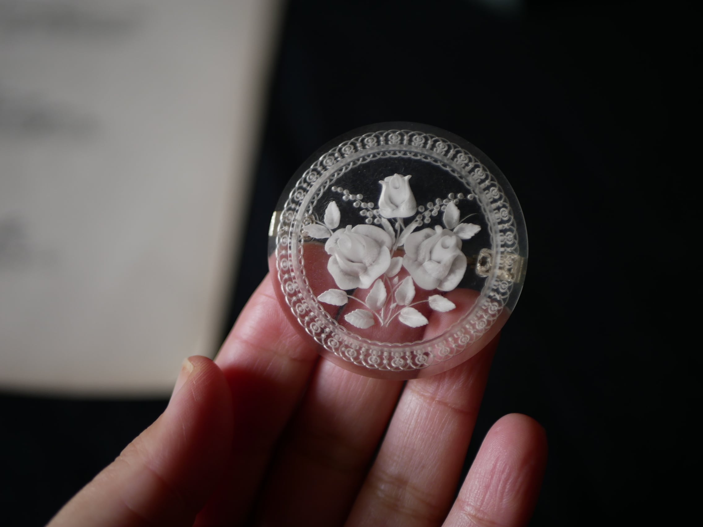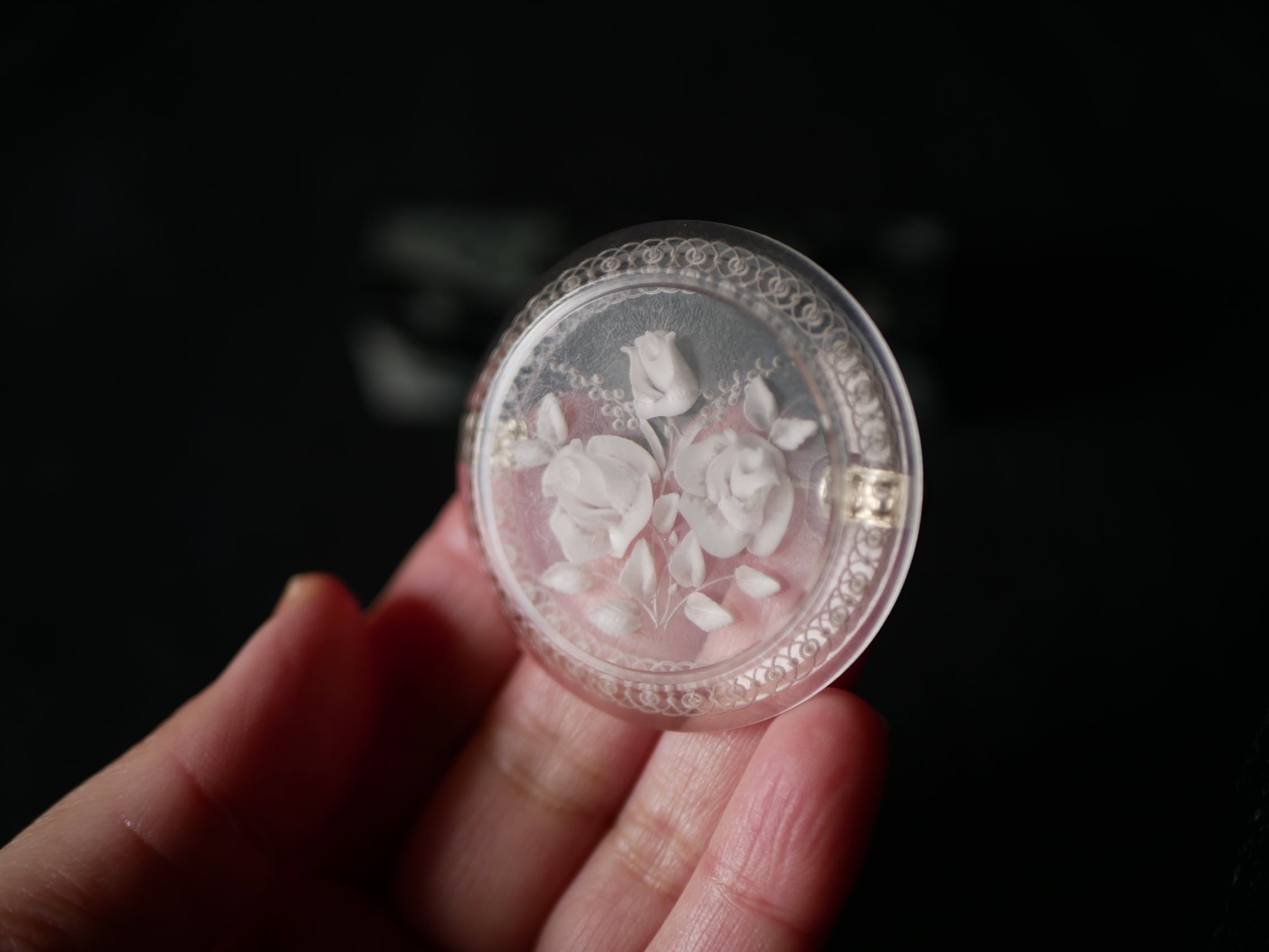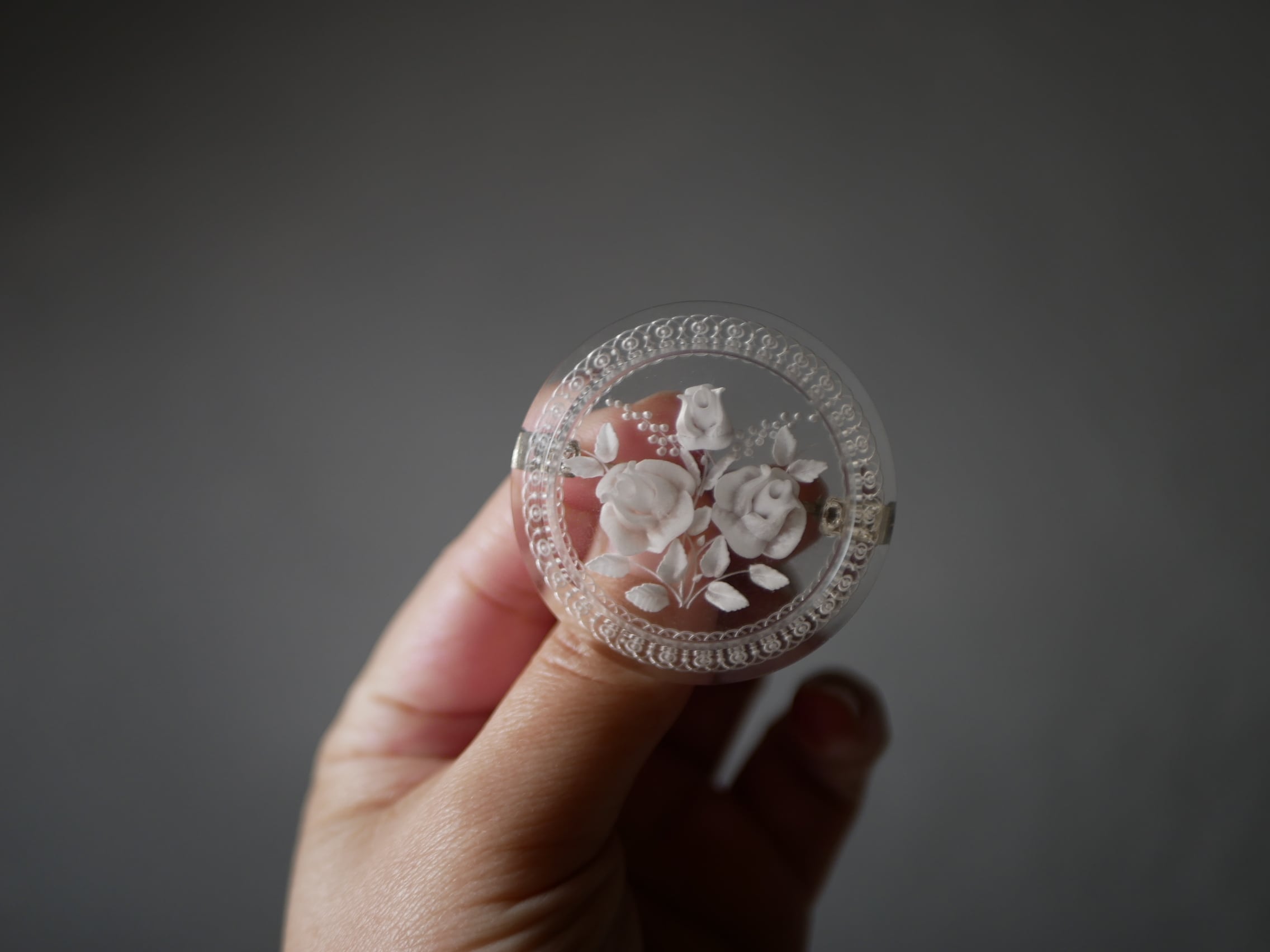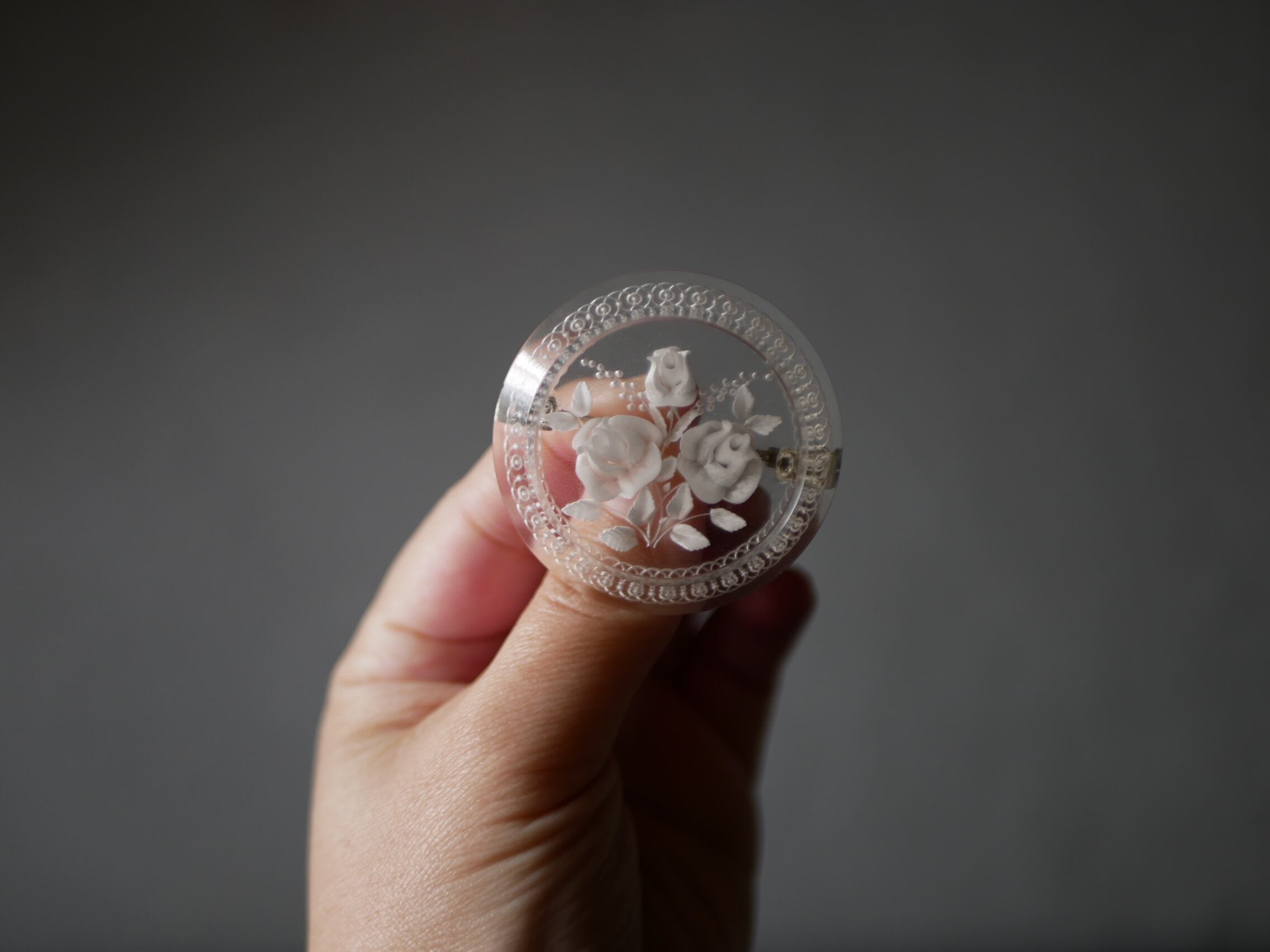レースのような彫りが施されたリムに、ミモザとローズのブーケが可愛い円形のルーサイト。