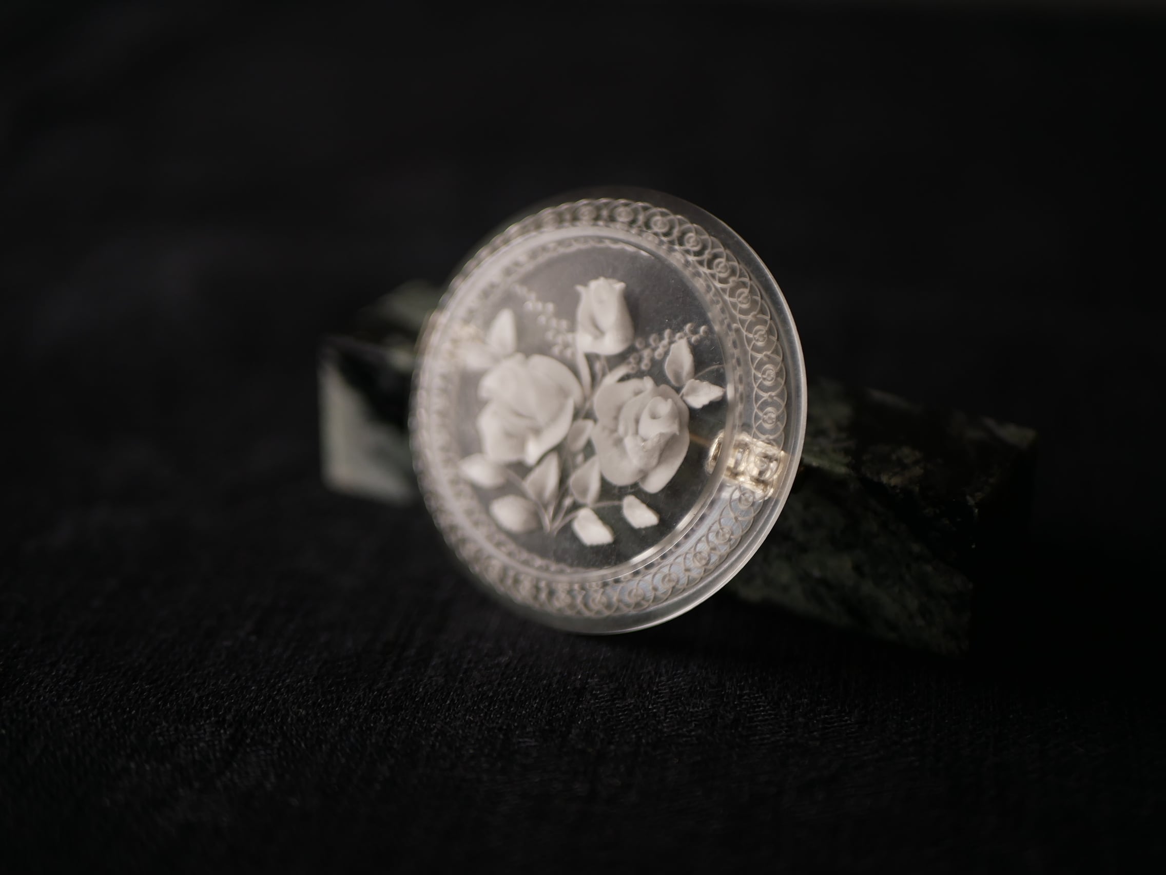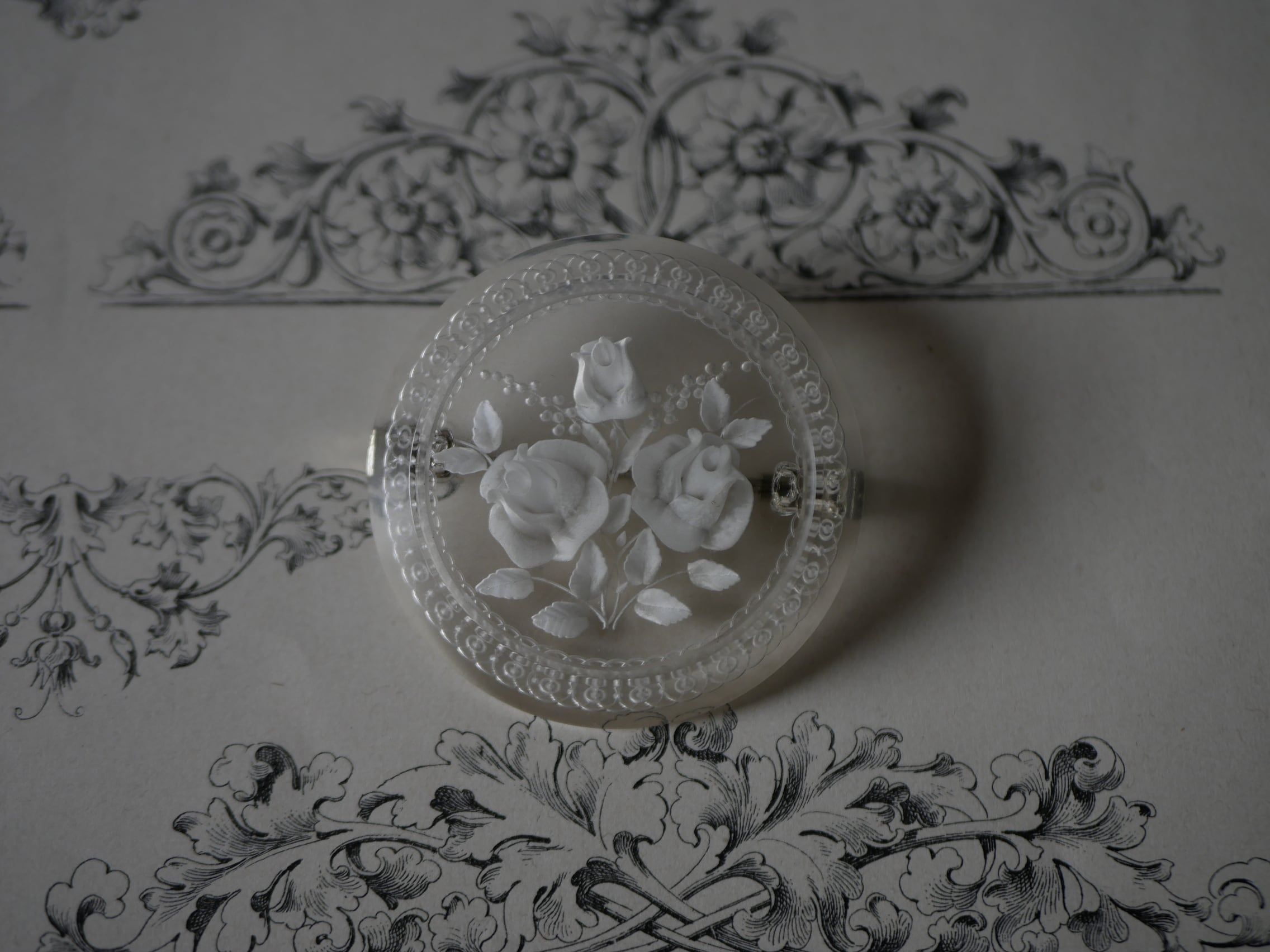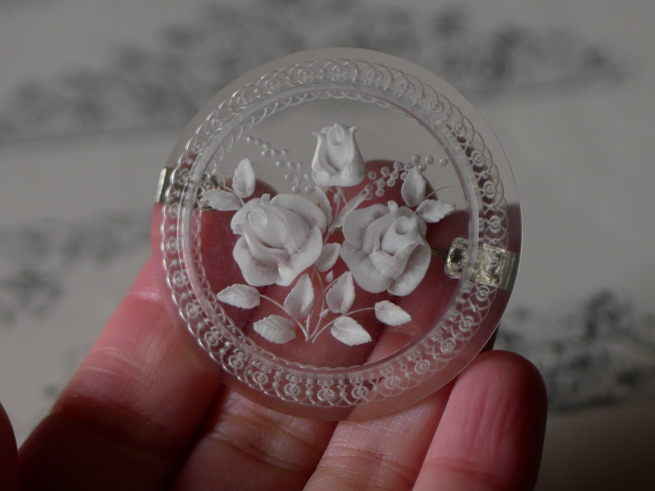 レースのような彫りが施されたリムに、ミモザとローズのブーケが可愛い円形のルーサイト。