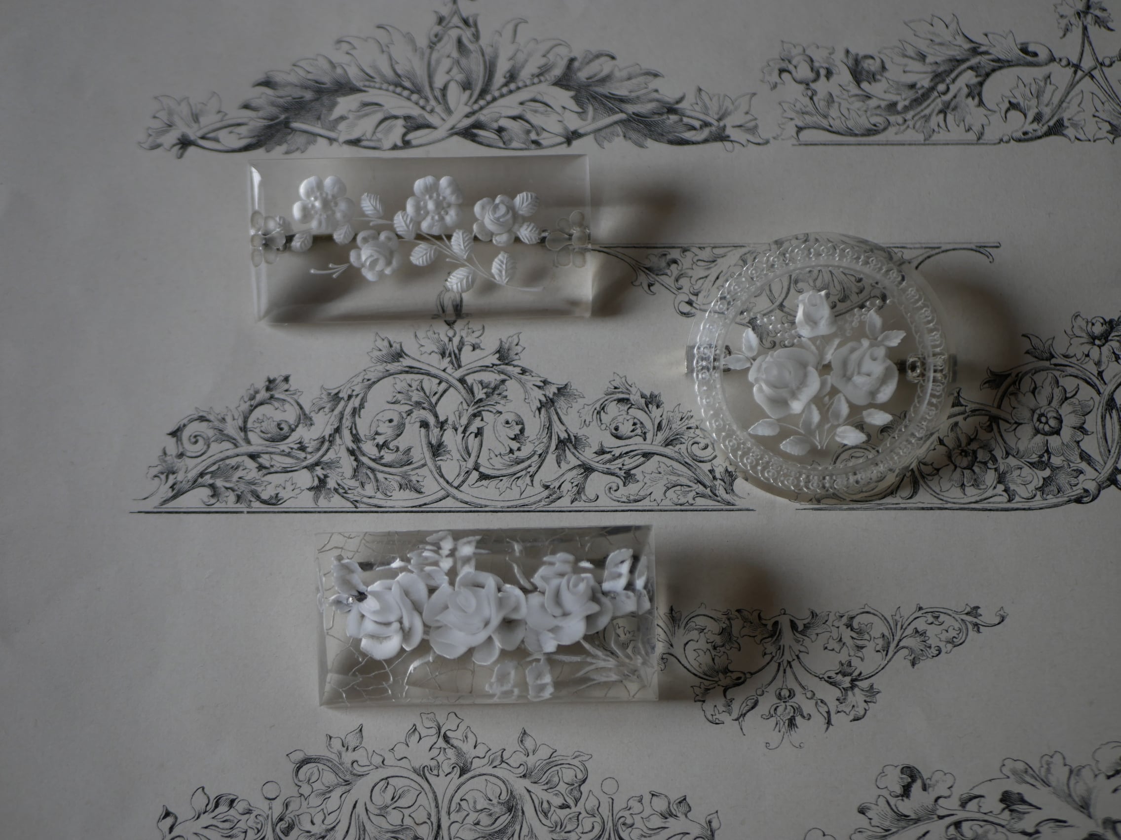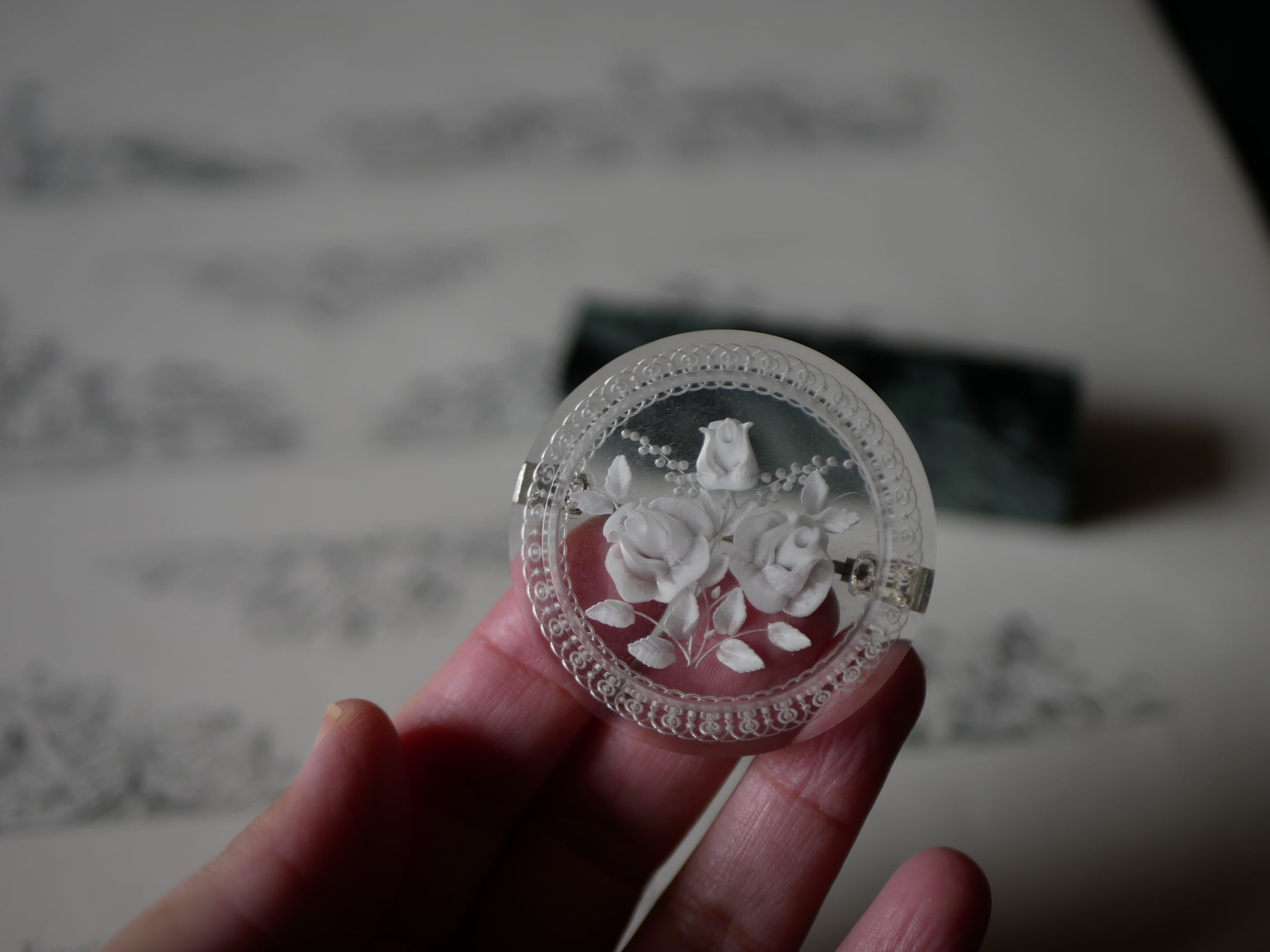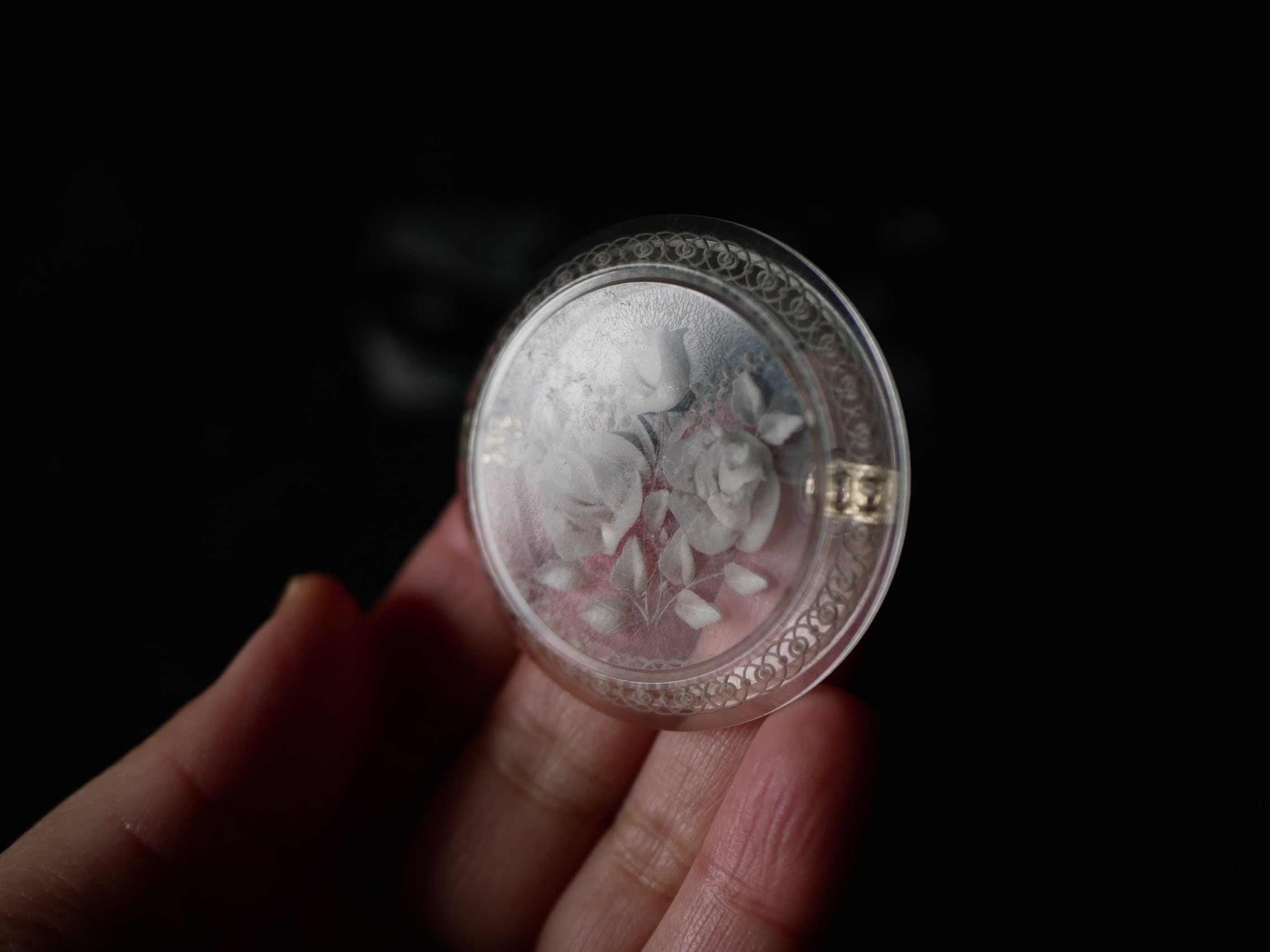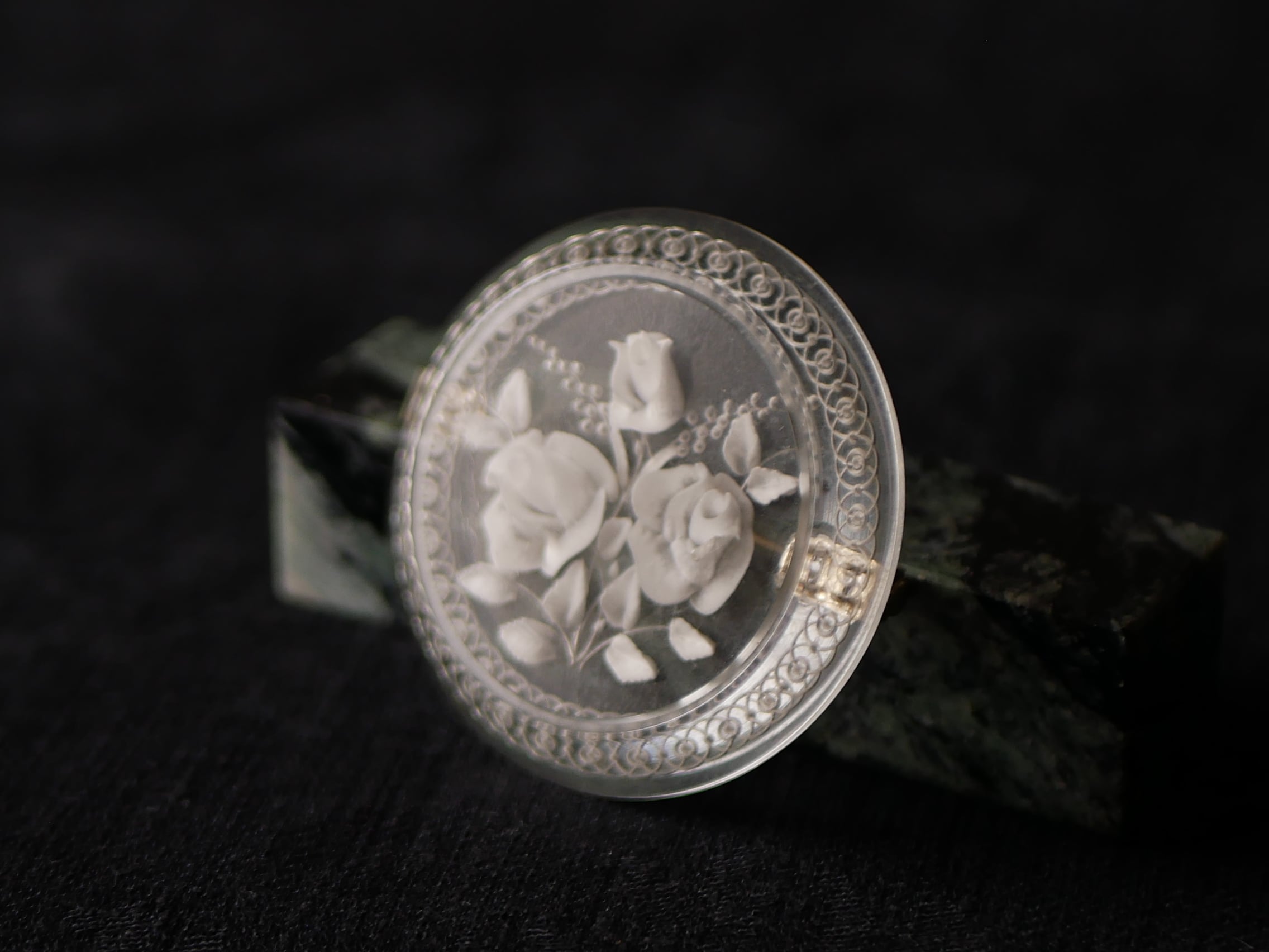 レースのような彫りが施されたリムに、ミモザとローズのブーケが可愛い円形のルーサイト。
