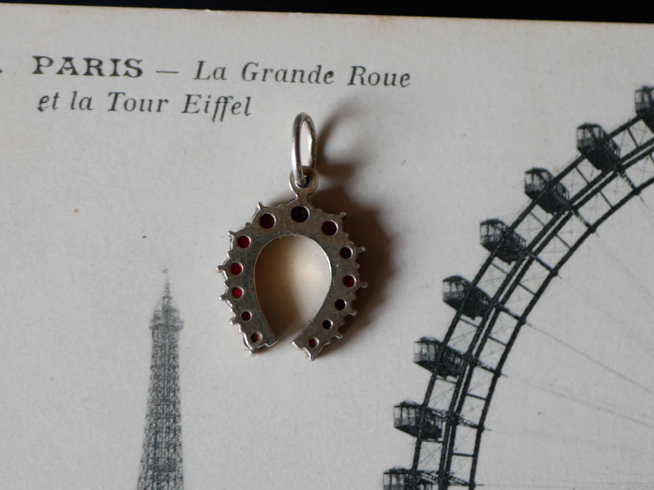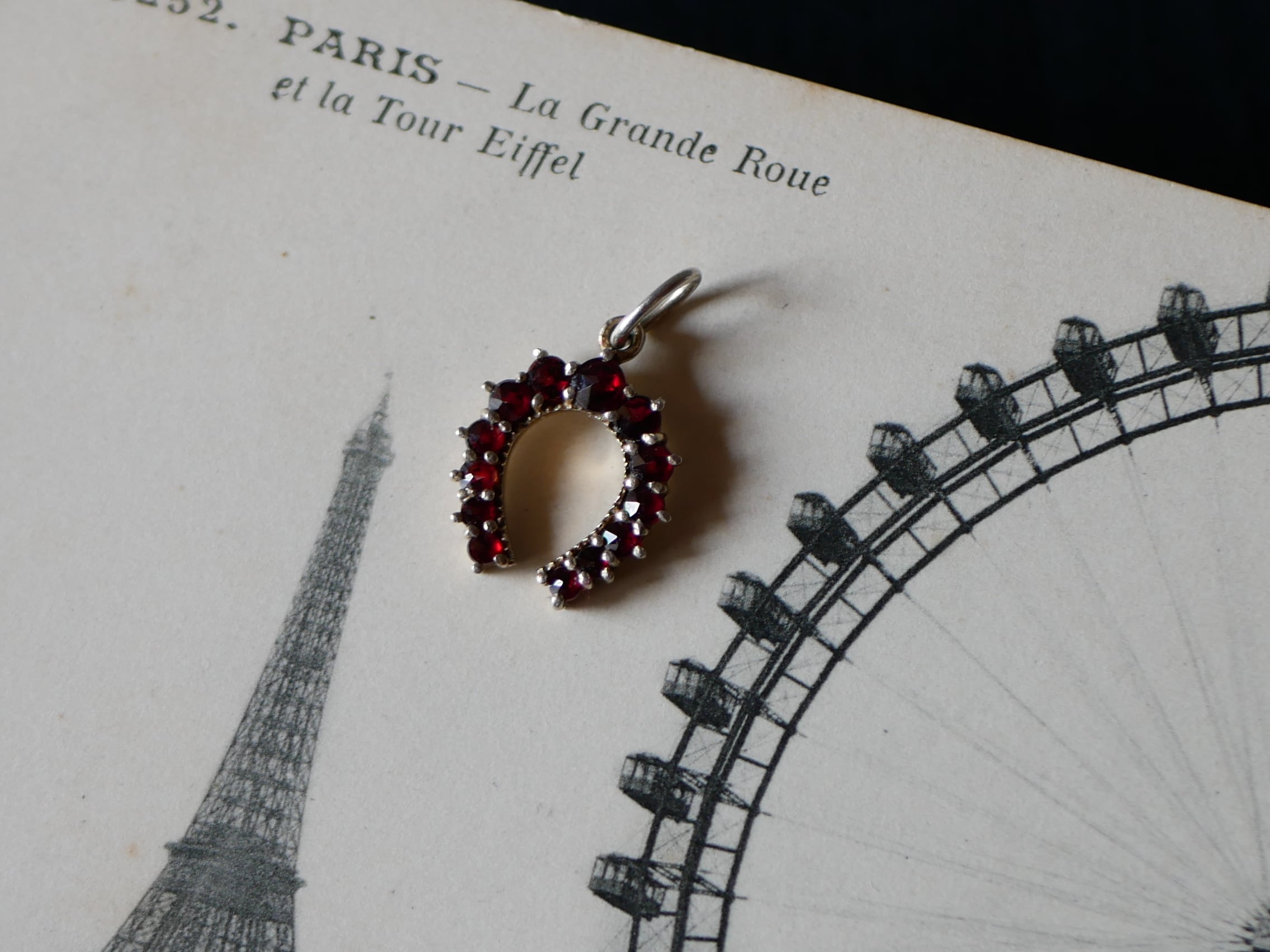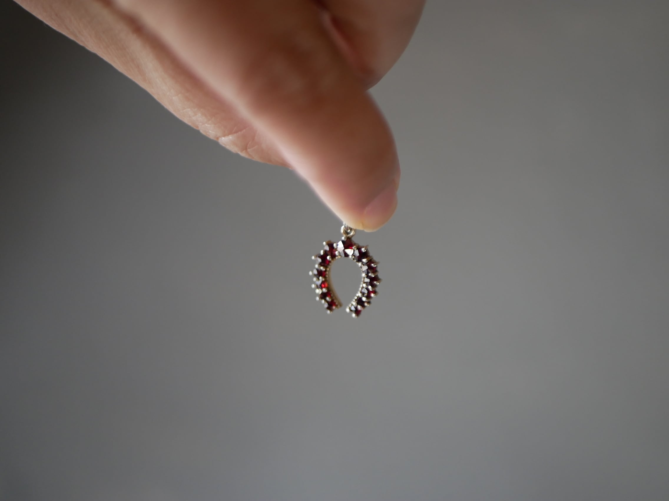 ローズカットのガーネットが並ぶ素敵なホースシューのペンダントトップです。