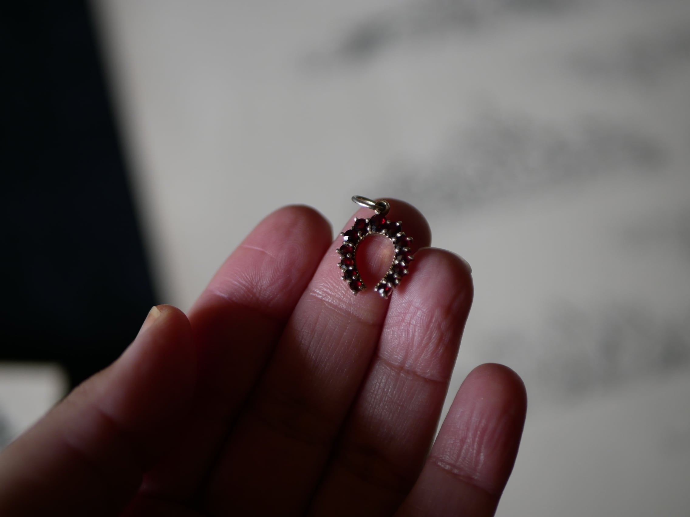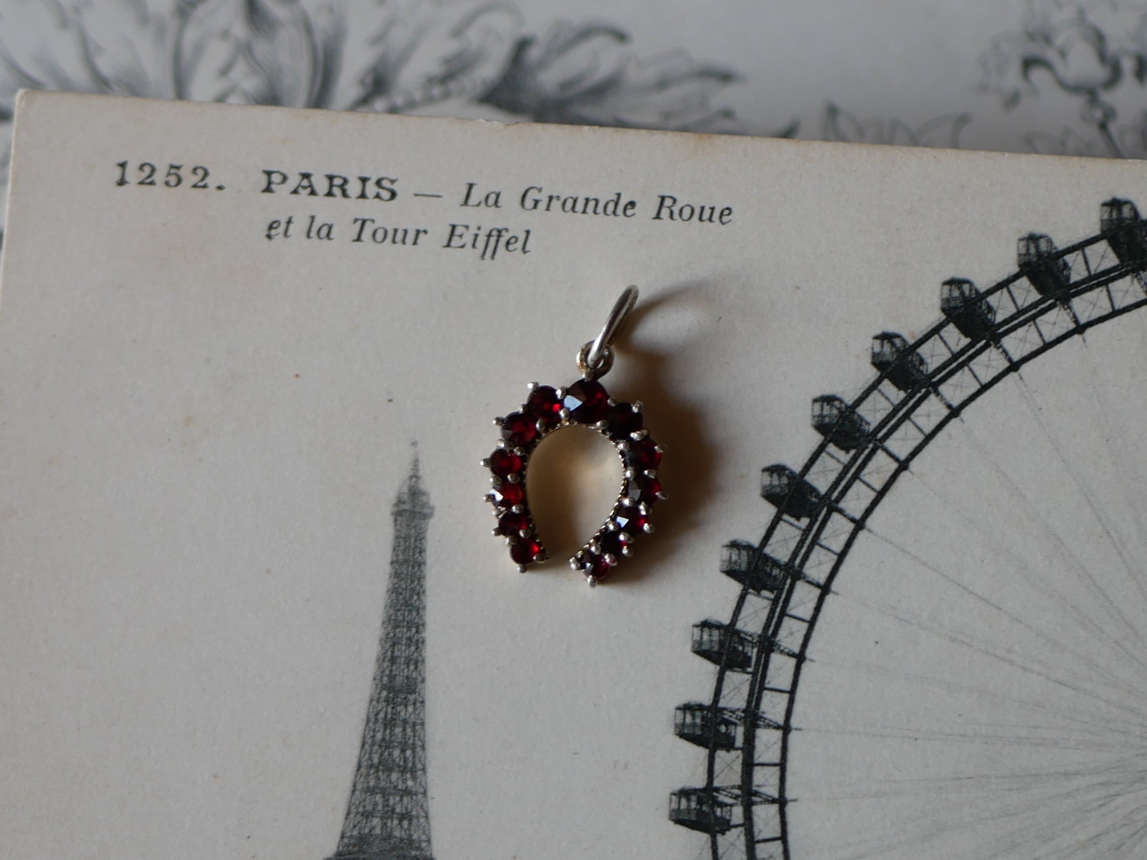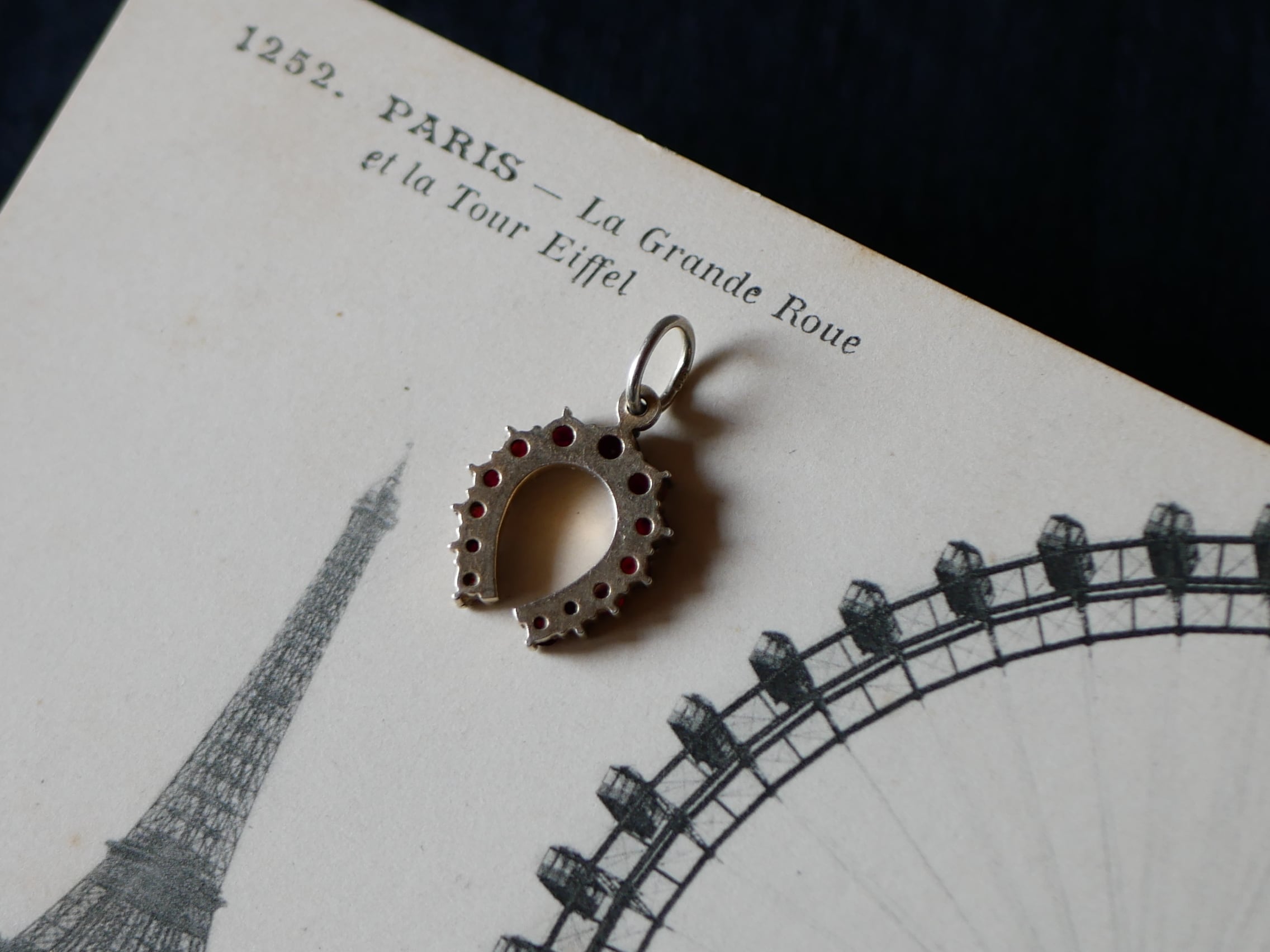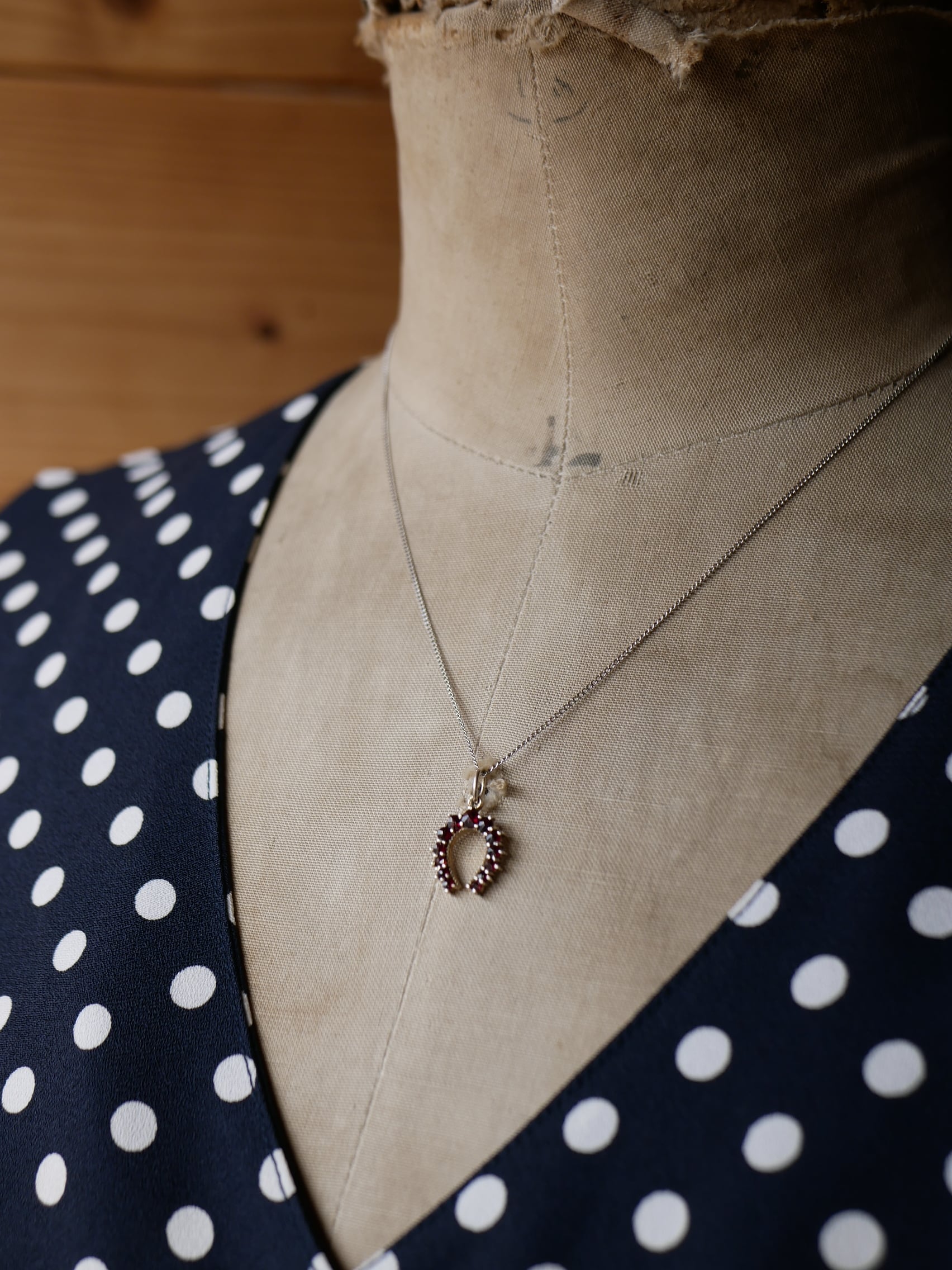 ローズカットのガーネットが並ぶ素敵なホースシューのペンダントトップです。