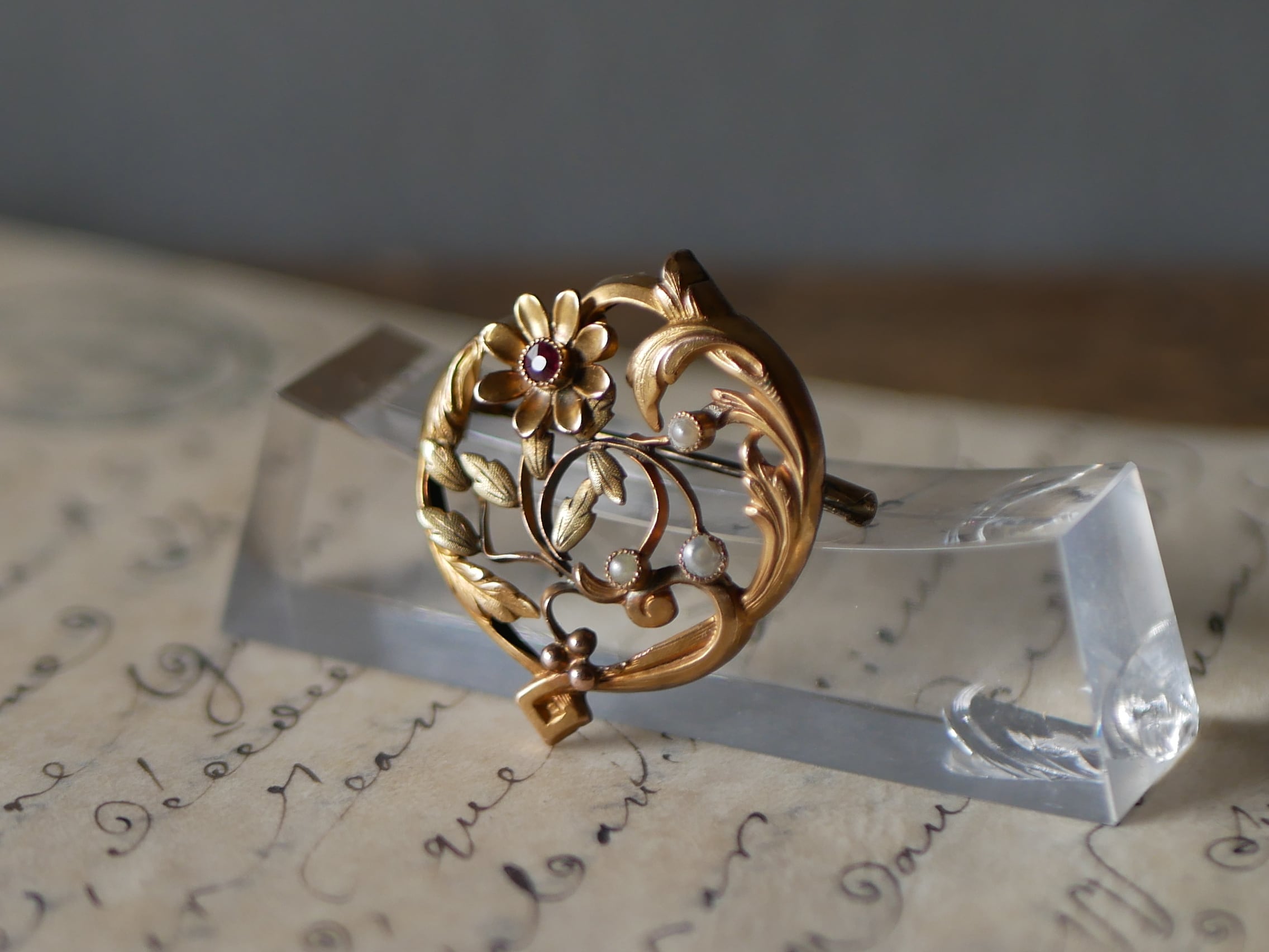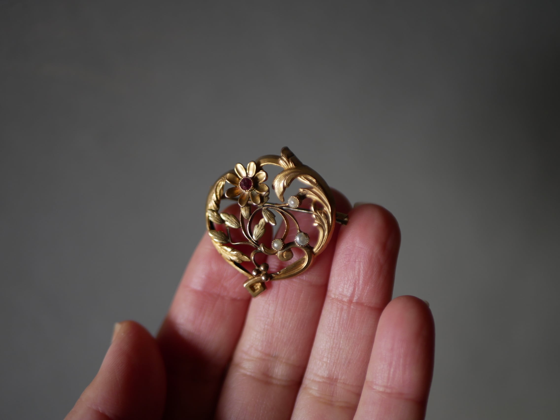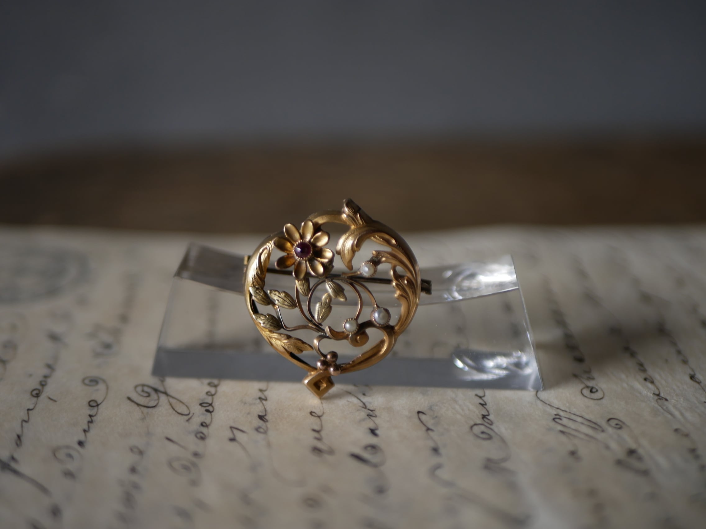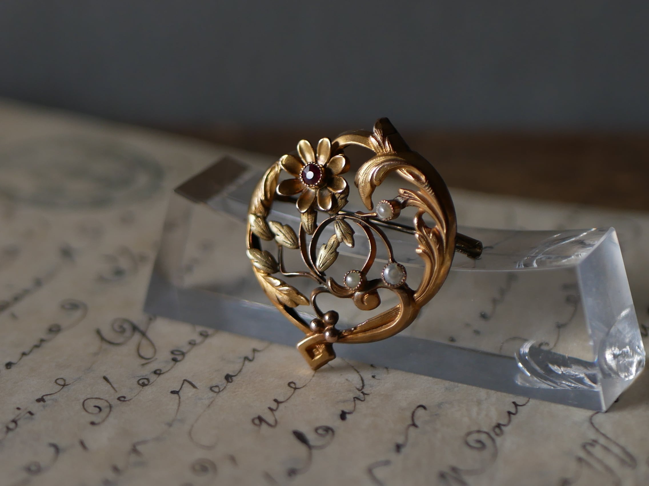 ゴールドプレート 赤い石とシードパール ブローチ フランスアンティーク アンティークのある暮らし