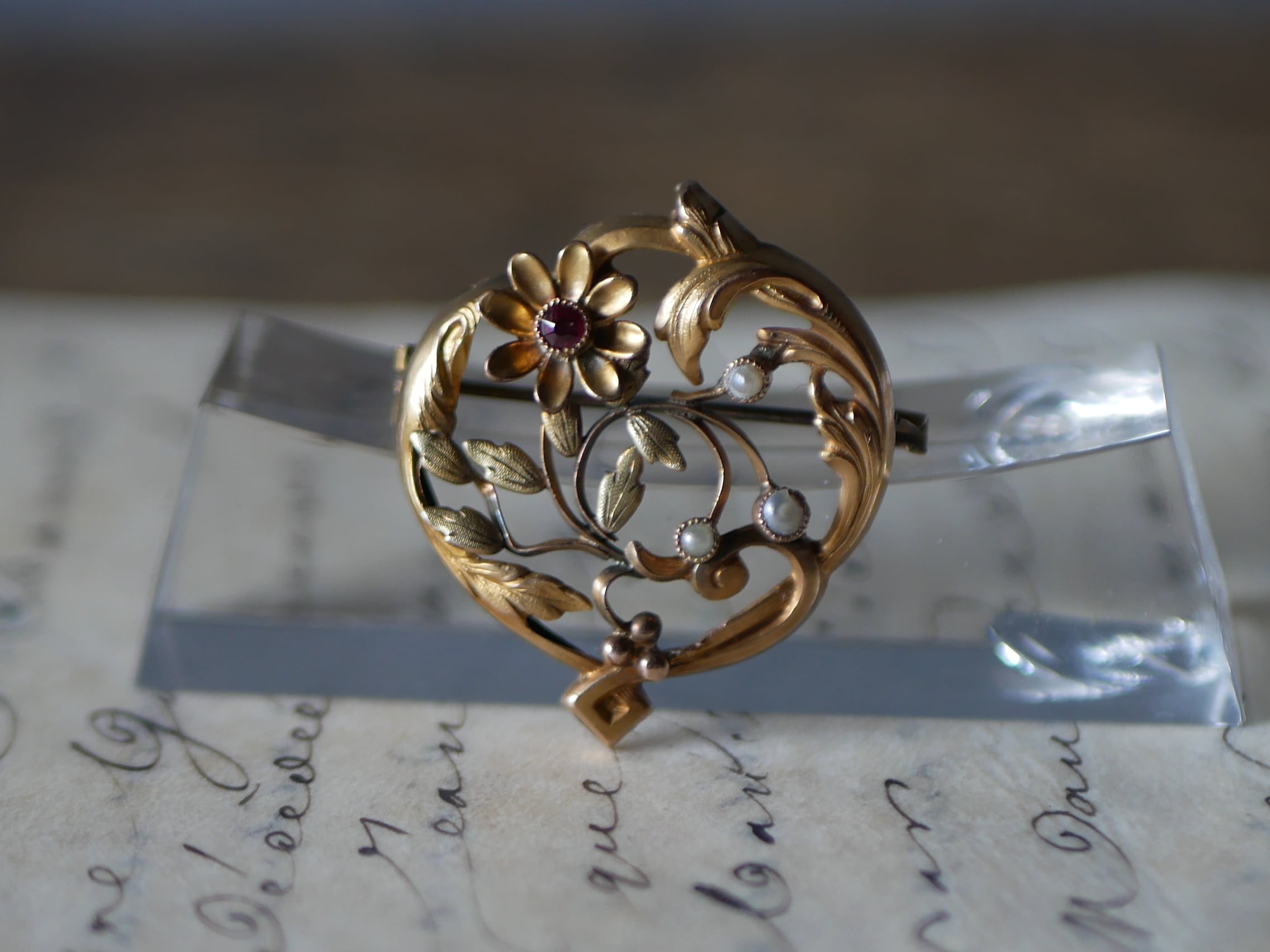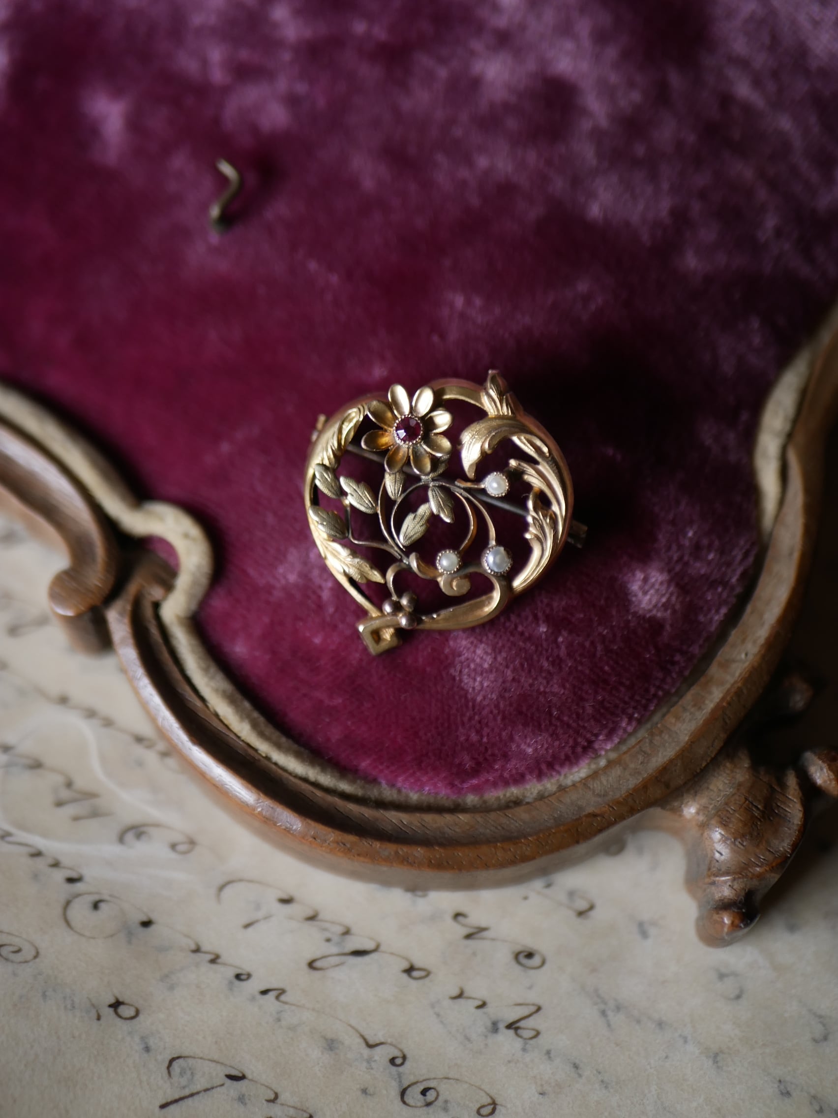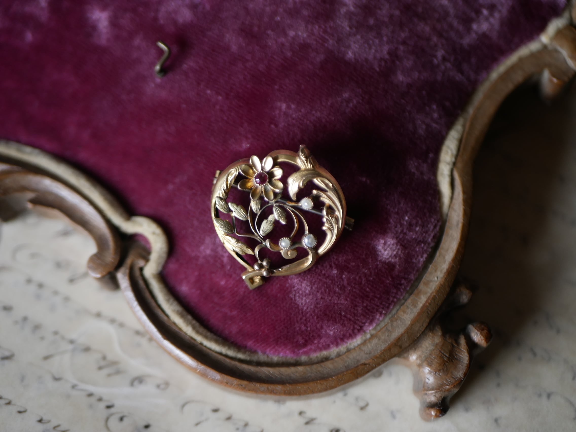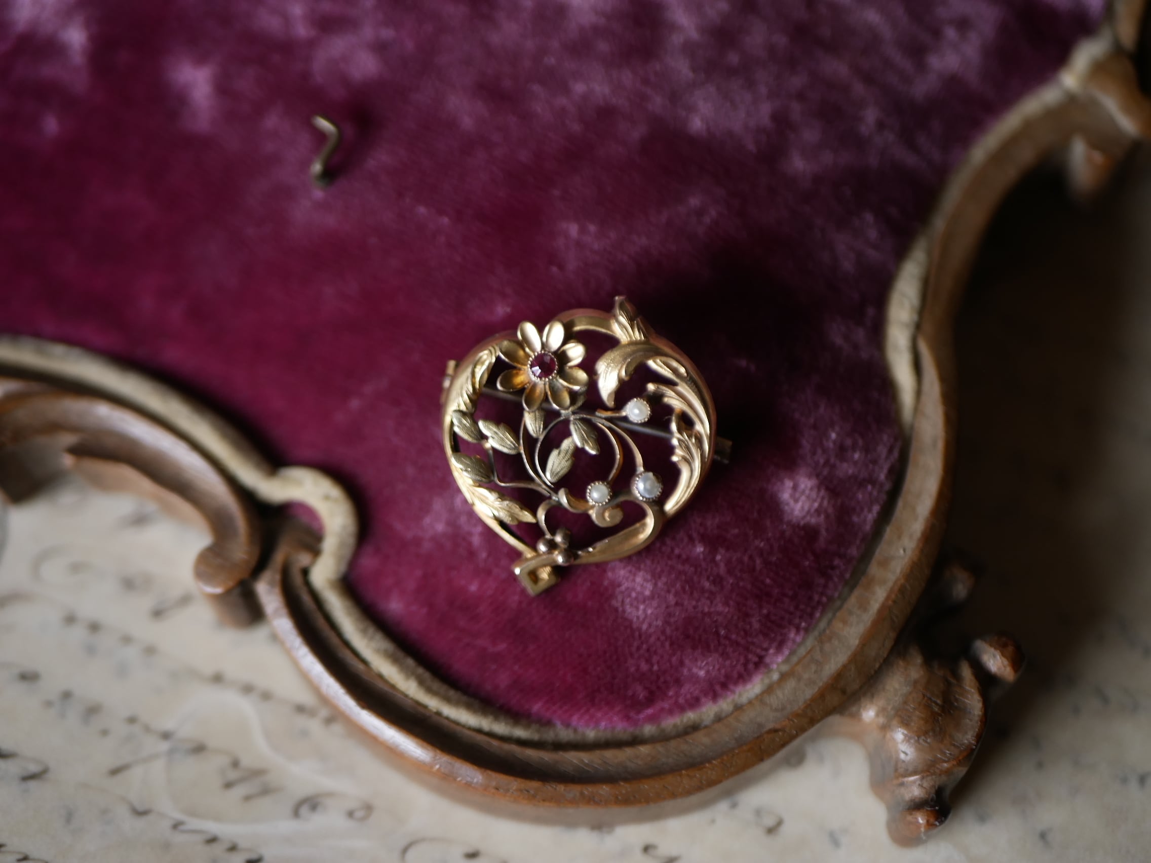 ゴールドプレート 赤い石とシードパール ブローチ フランスアンティーク アンティークのある暮らし