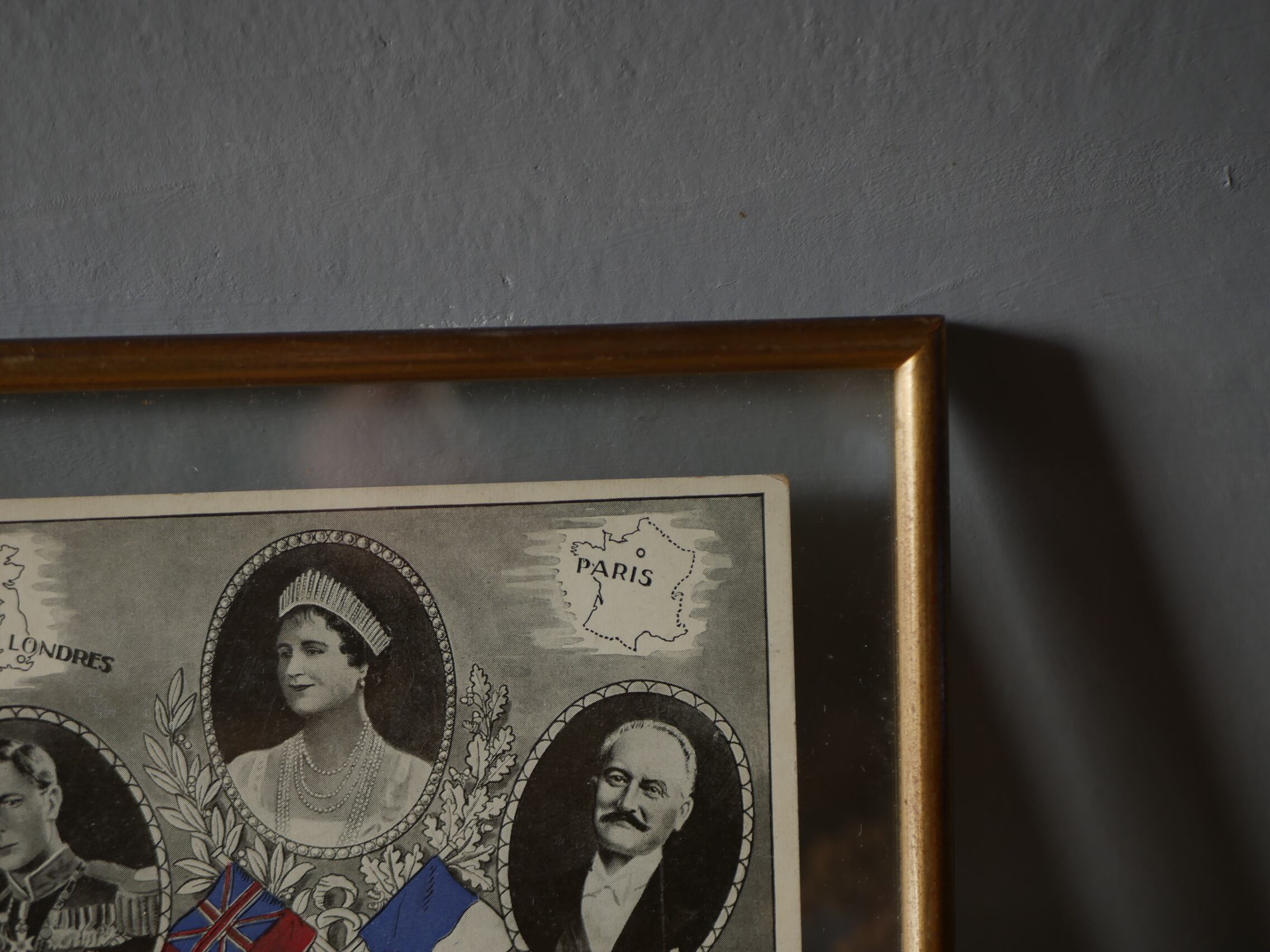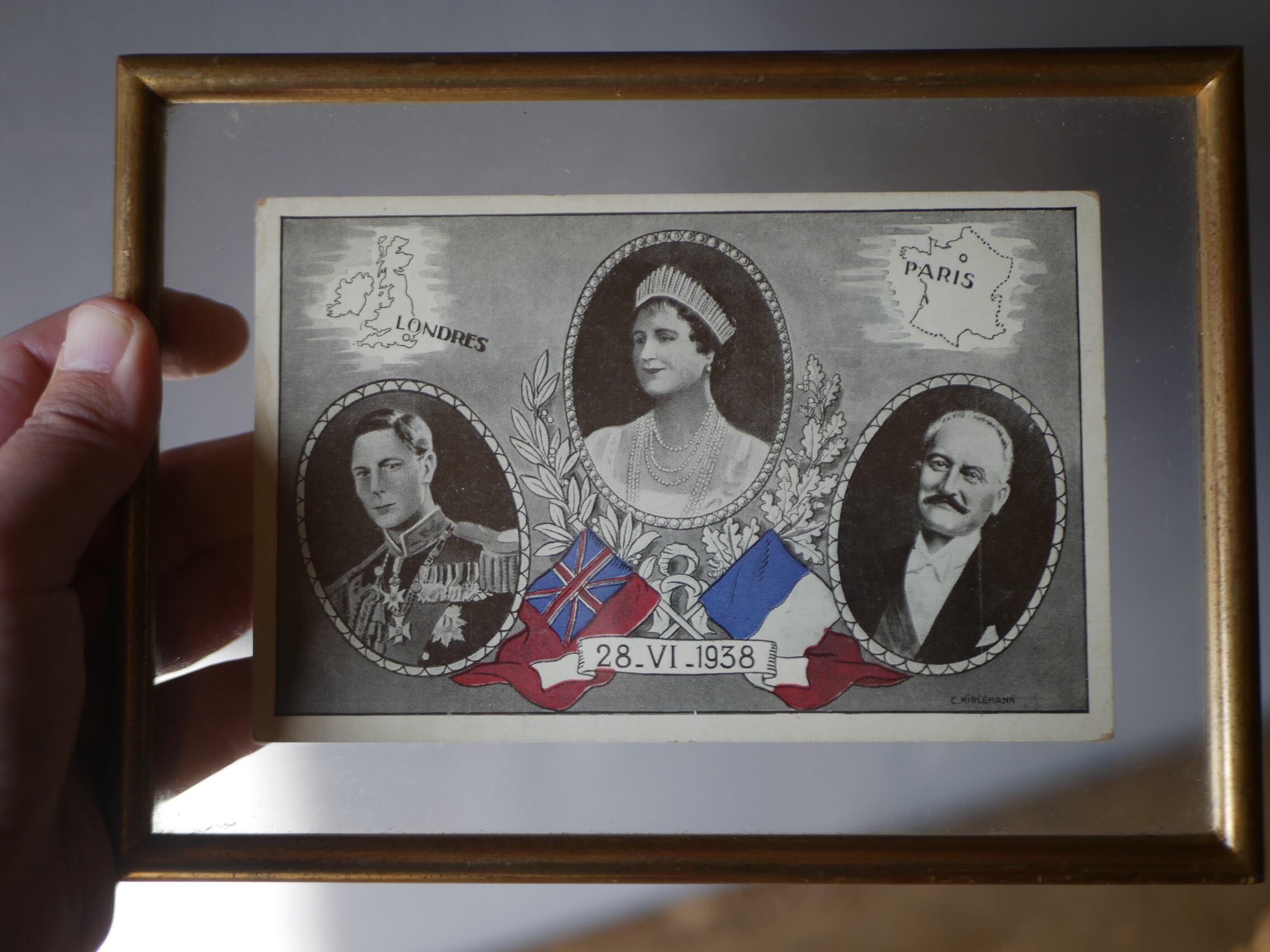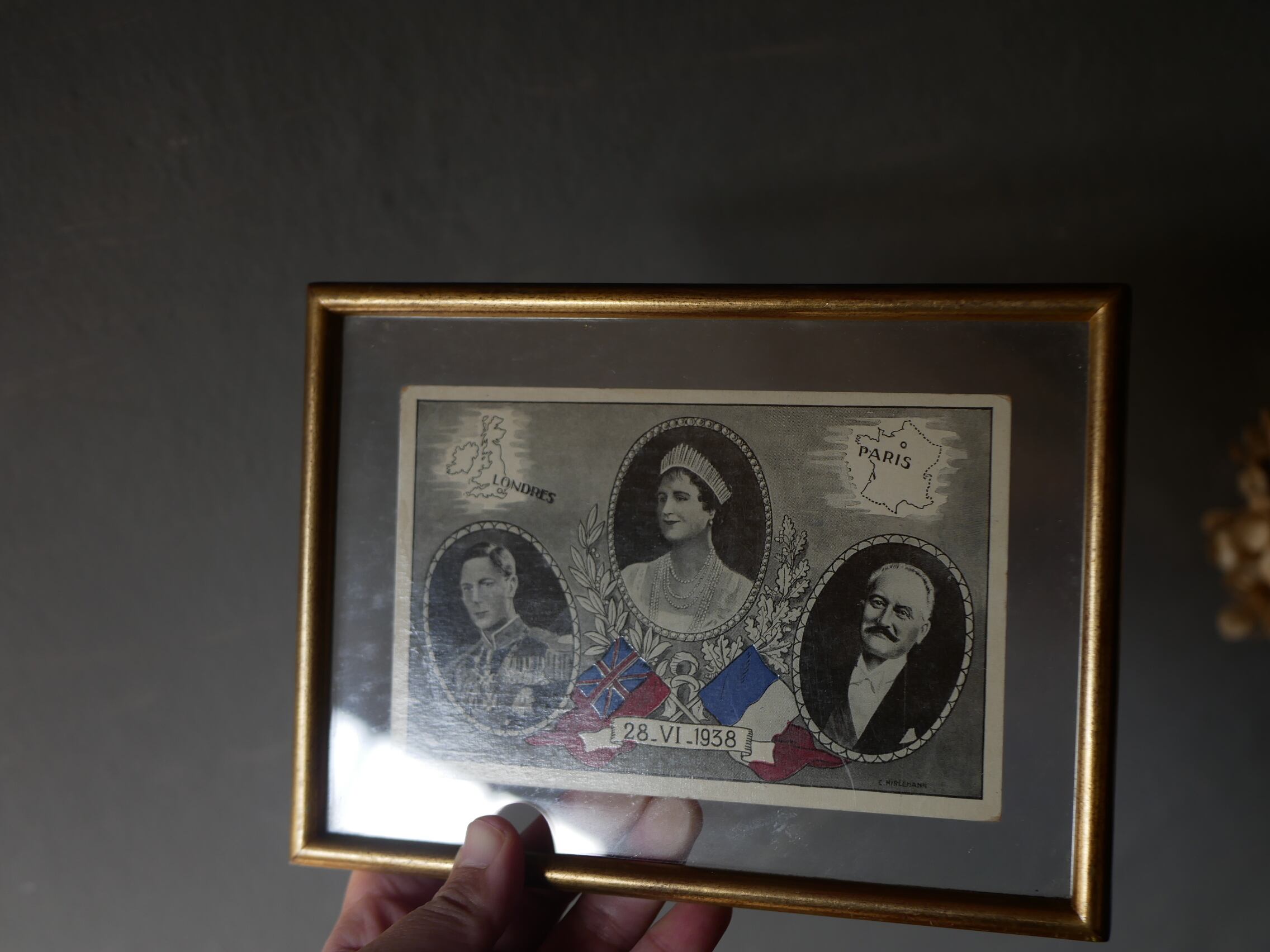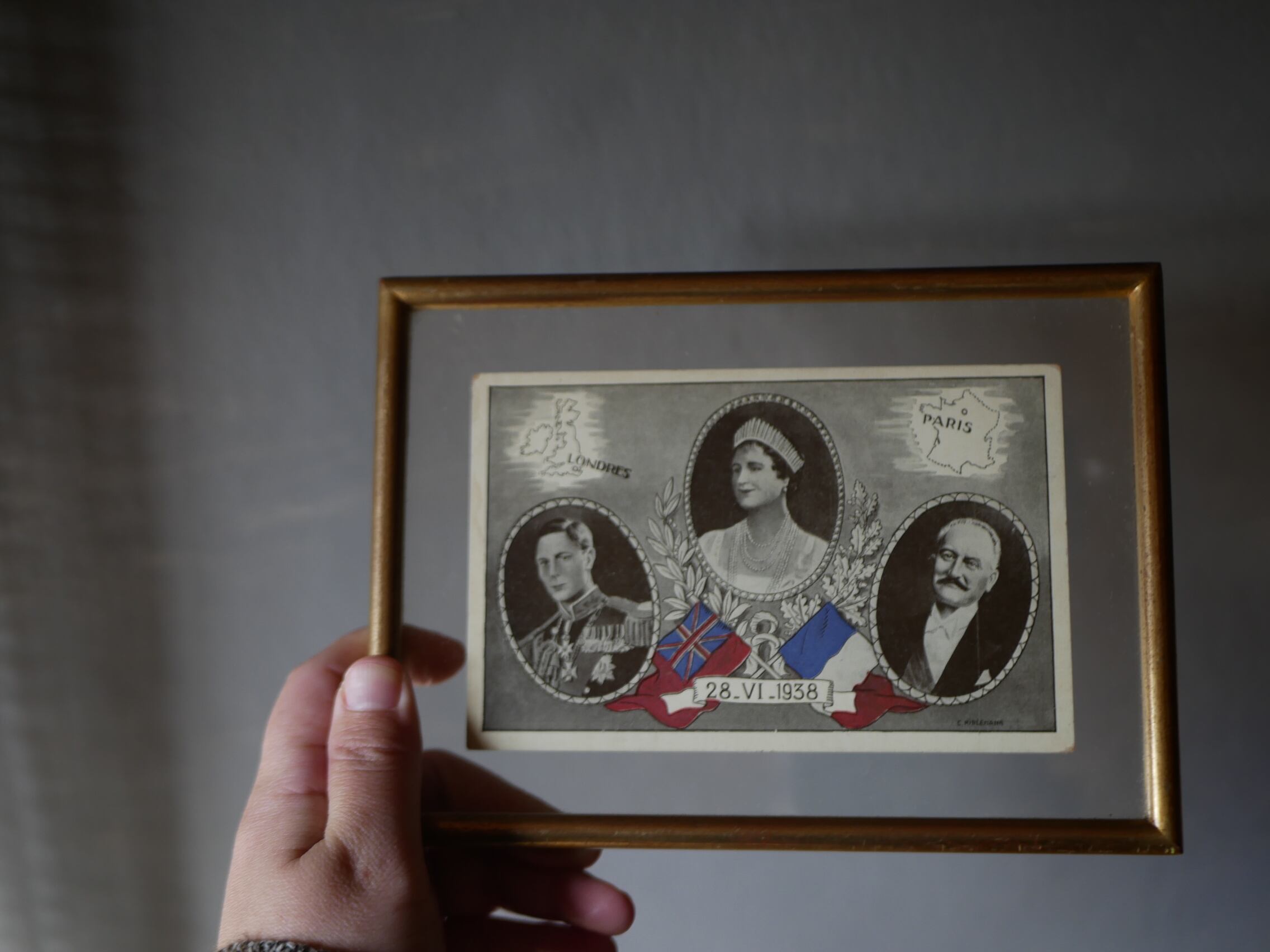 1938年6月28日、イギリス国王夫妻によるフランス公式訪問を記念して作成されたものだそうで、中央がエリザベス王妃、左はエリザベス王妃の夫ジョージ6世(当時はヨーク公アルバート王子)、