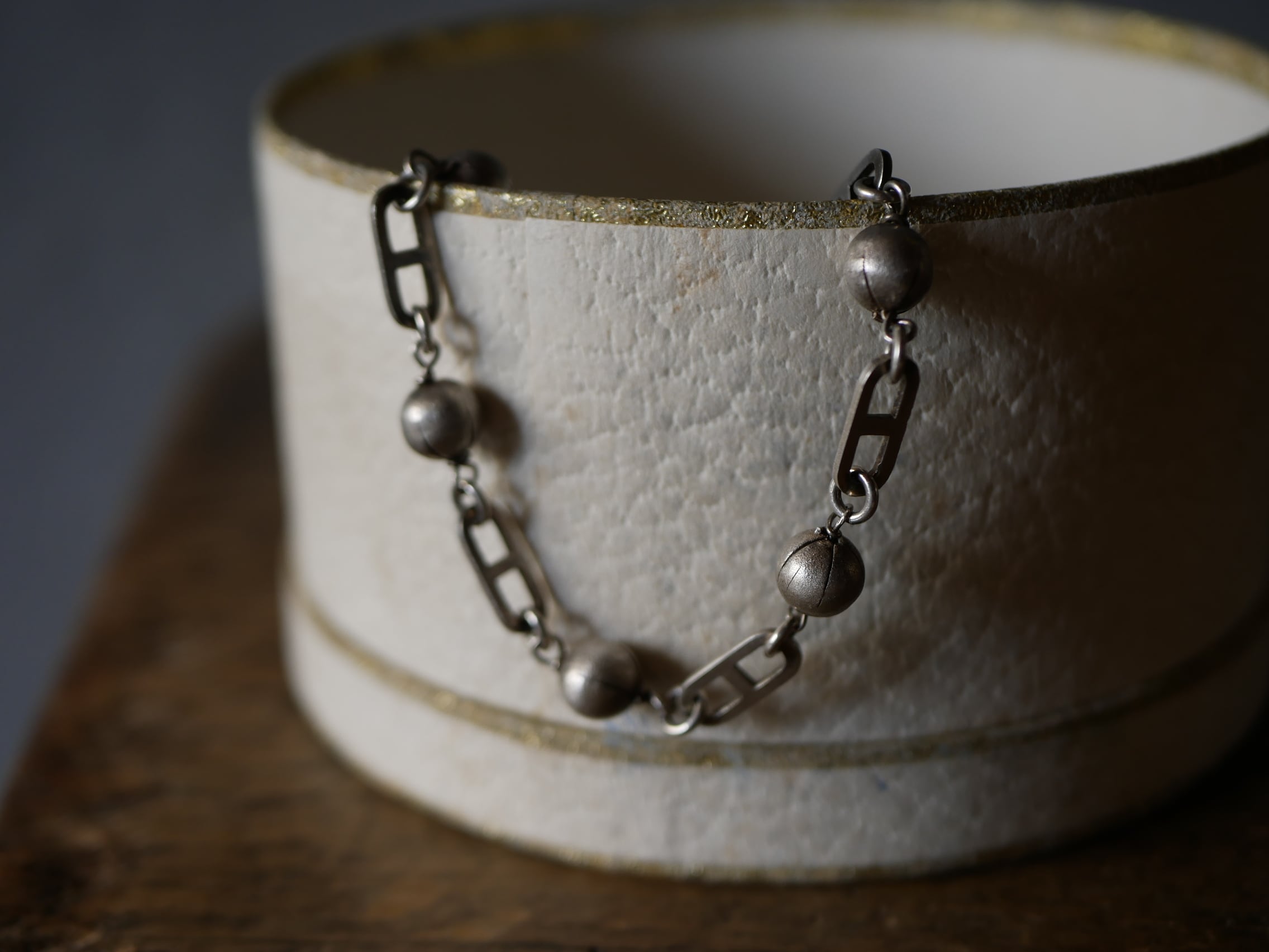 ボールと工業的なリンクが連なったモダンなアクセサリーになります。