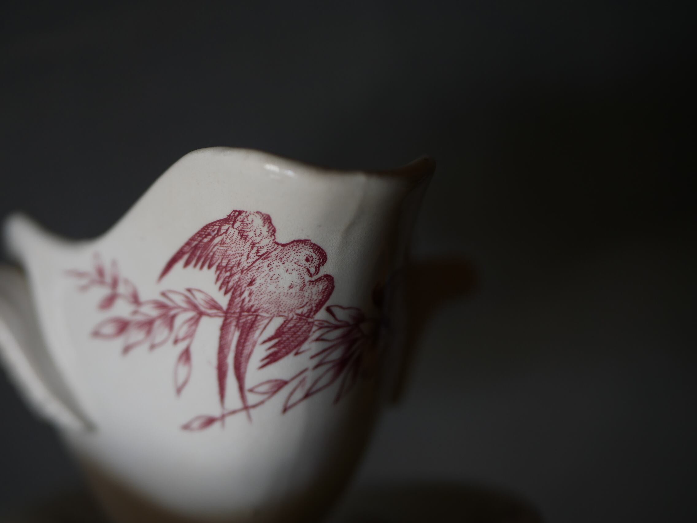 ボルドー色の植物や鳥が素敵で、取っ手のドットもお気に入りです
