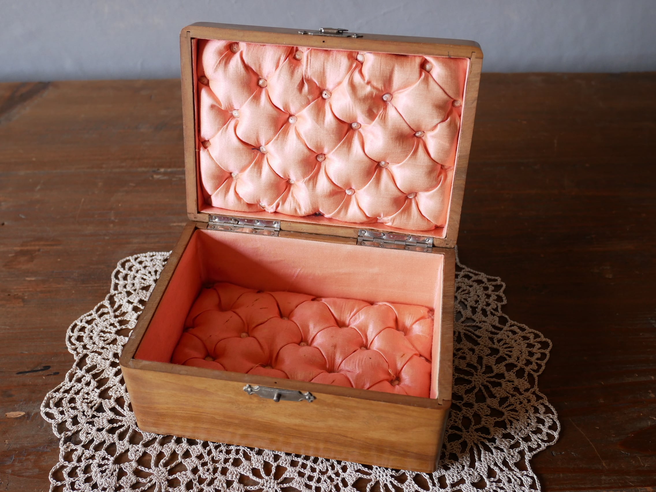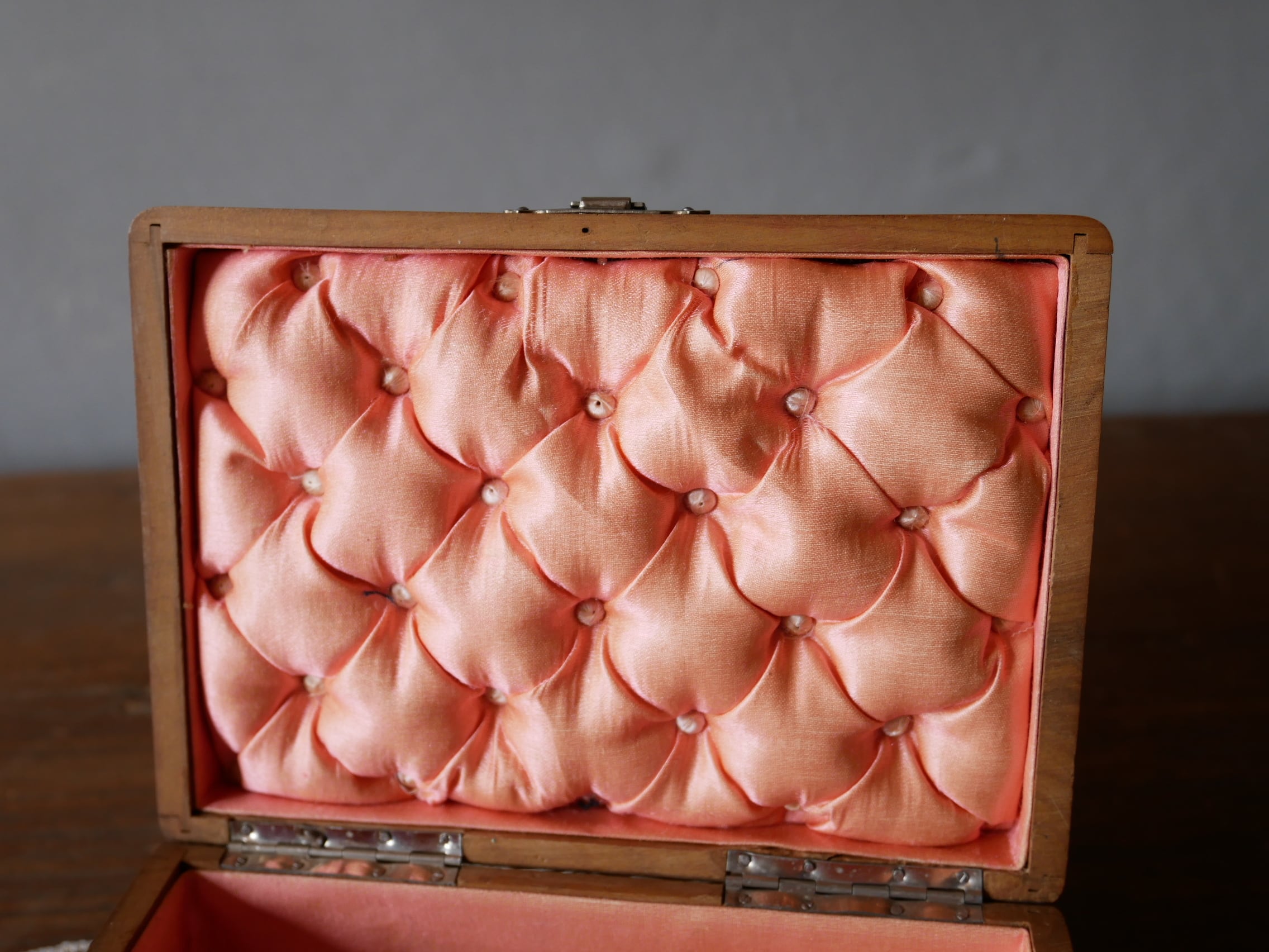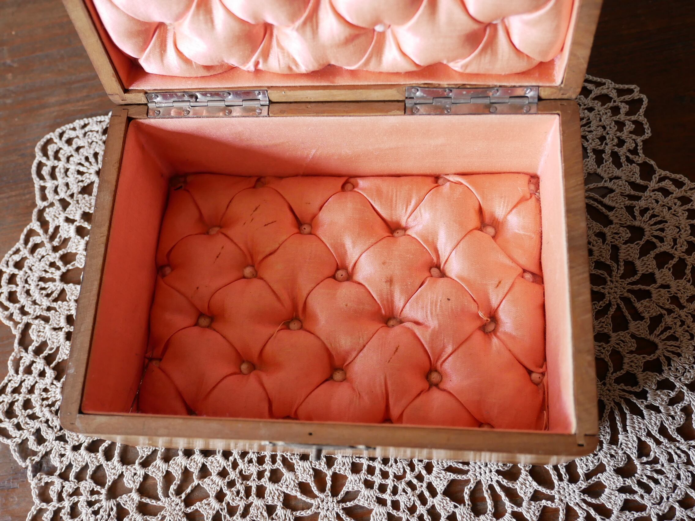 中は高級感あるサーモンピンクのクッションになっていて、宝石箱としてお使い頂けます。
