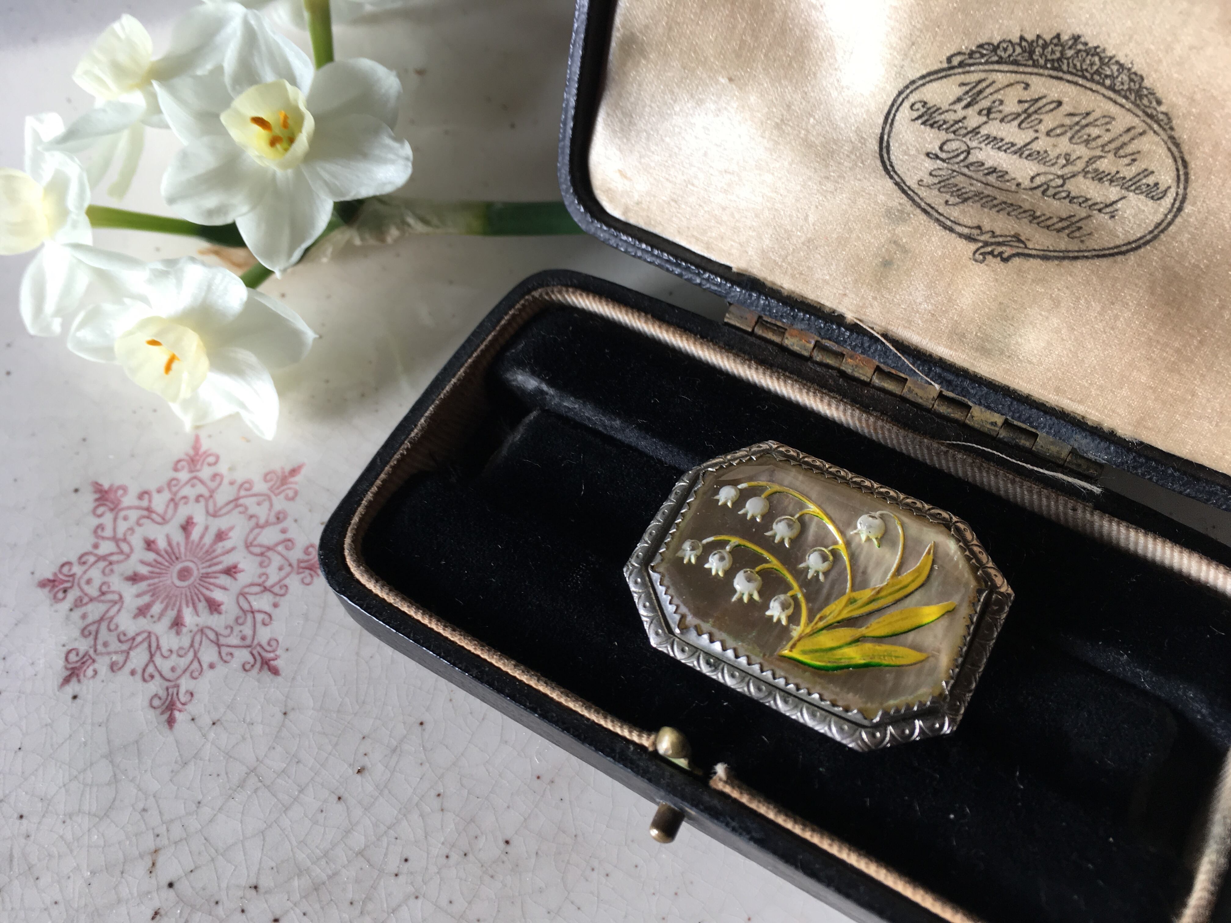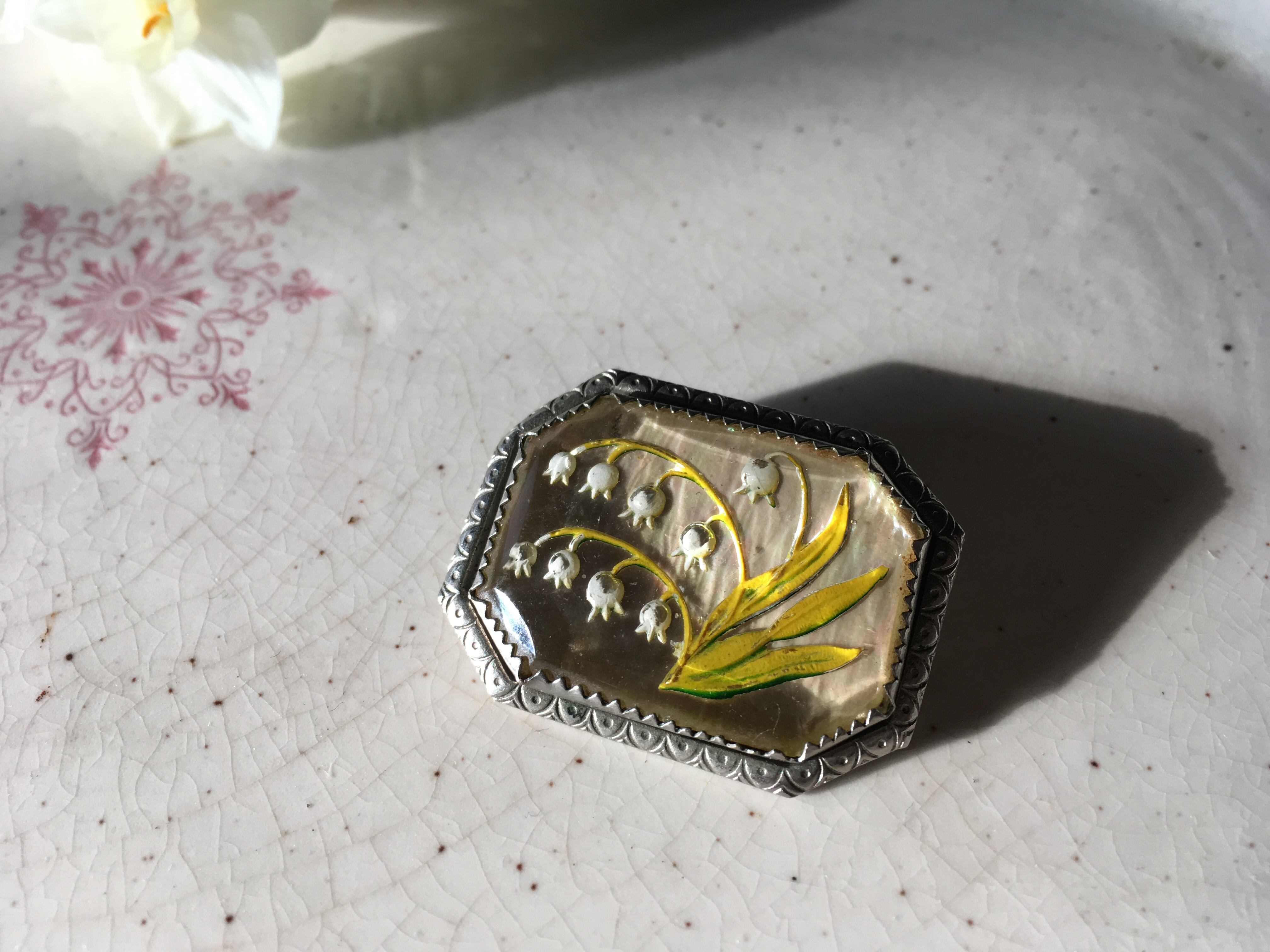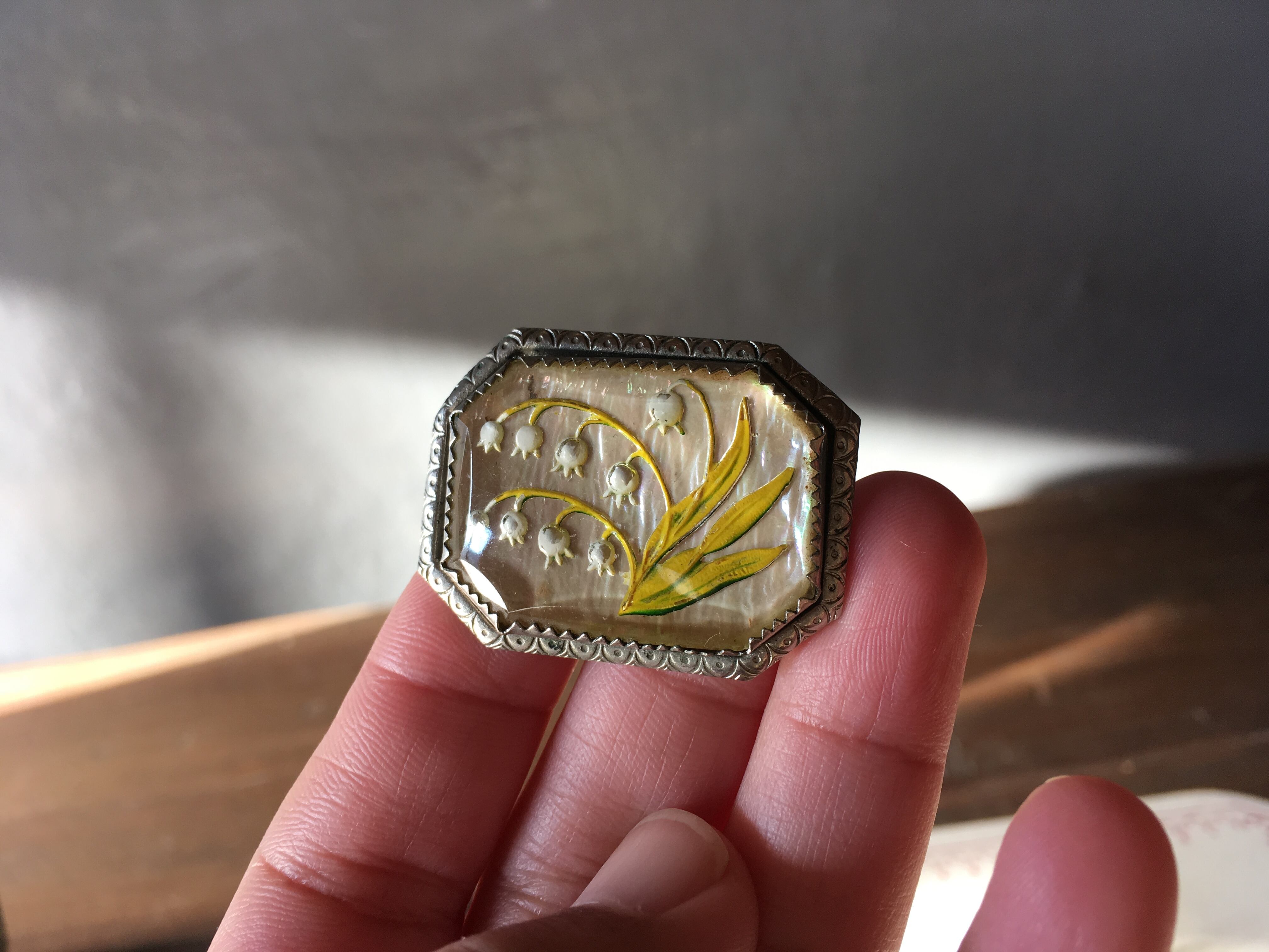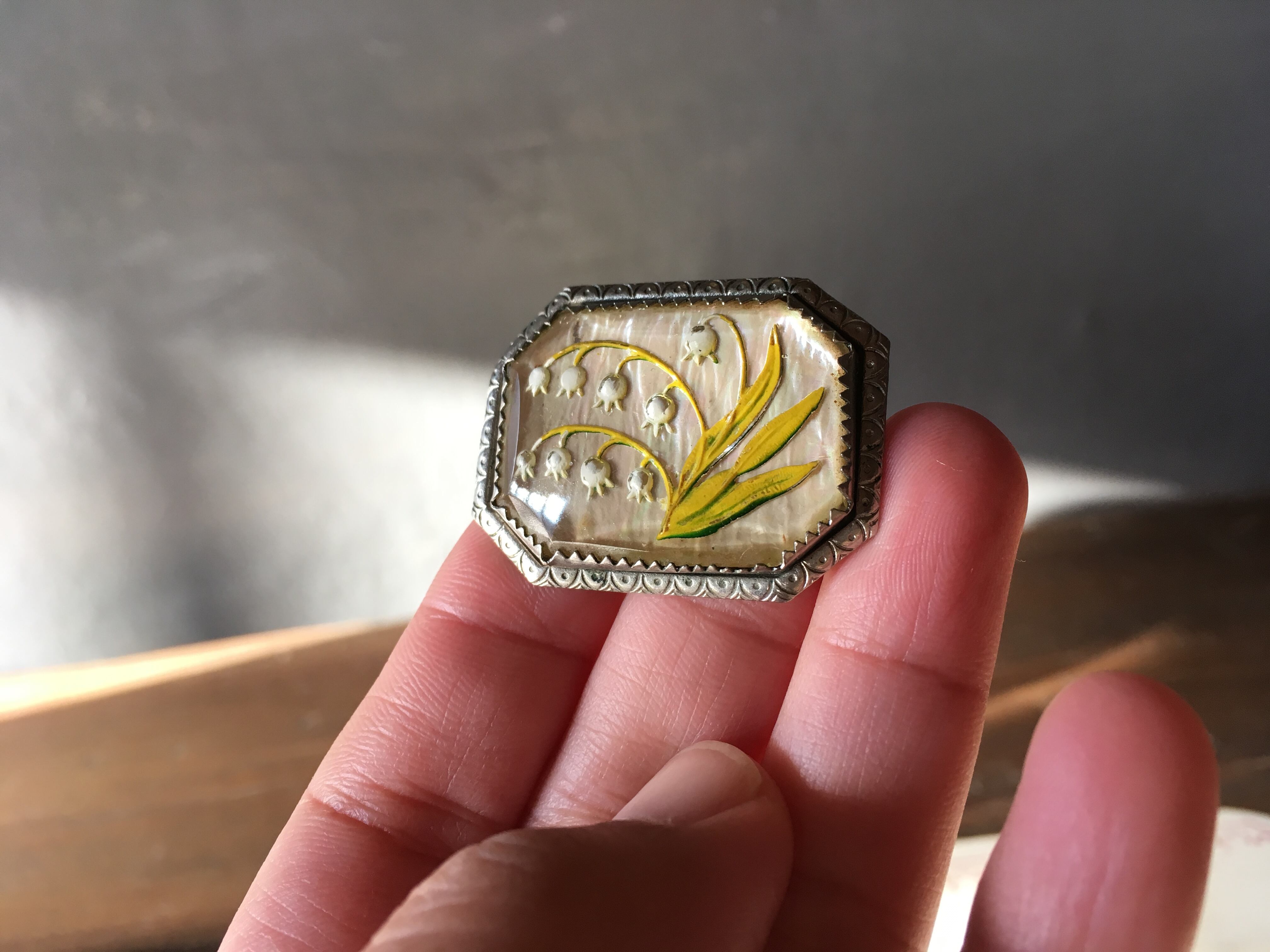 白蝶貝をベースに、ぷくっとした立体的なすずらんがハンドペイントで描かれています。