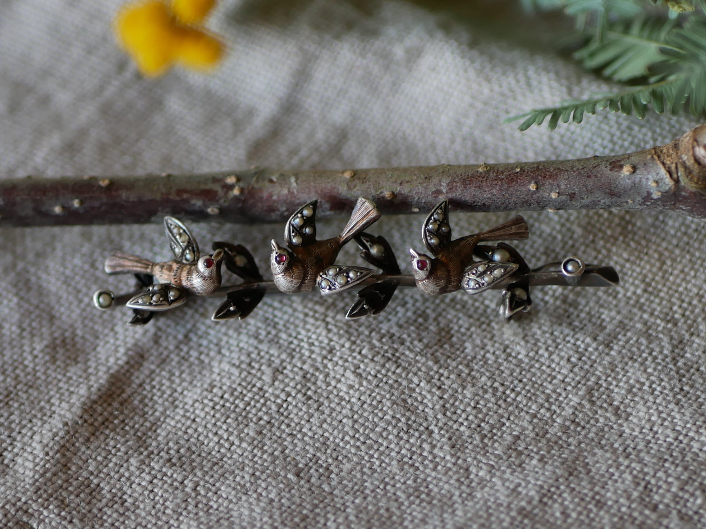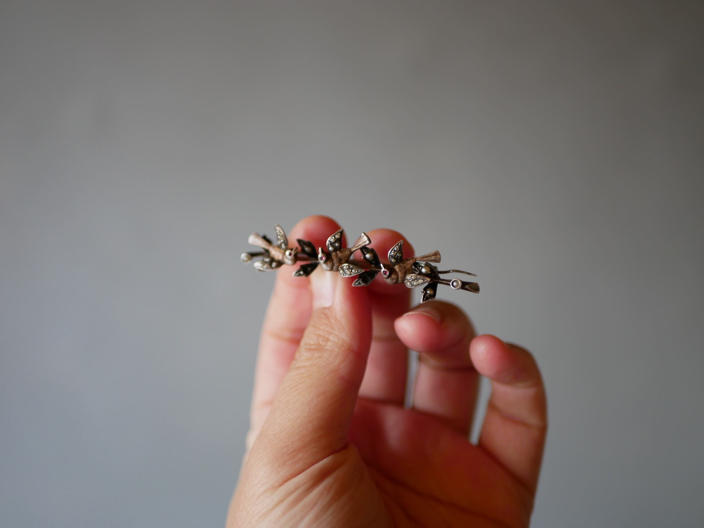 ツバメの羽根と枝にはシードパールが、ツバメの目には赤い硝子、そして体は少しローズゴールド色が付けられています