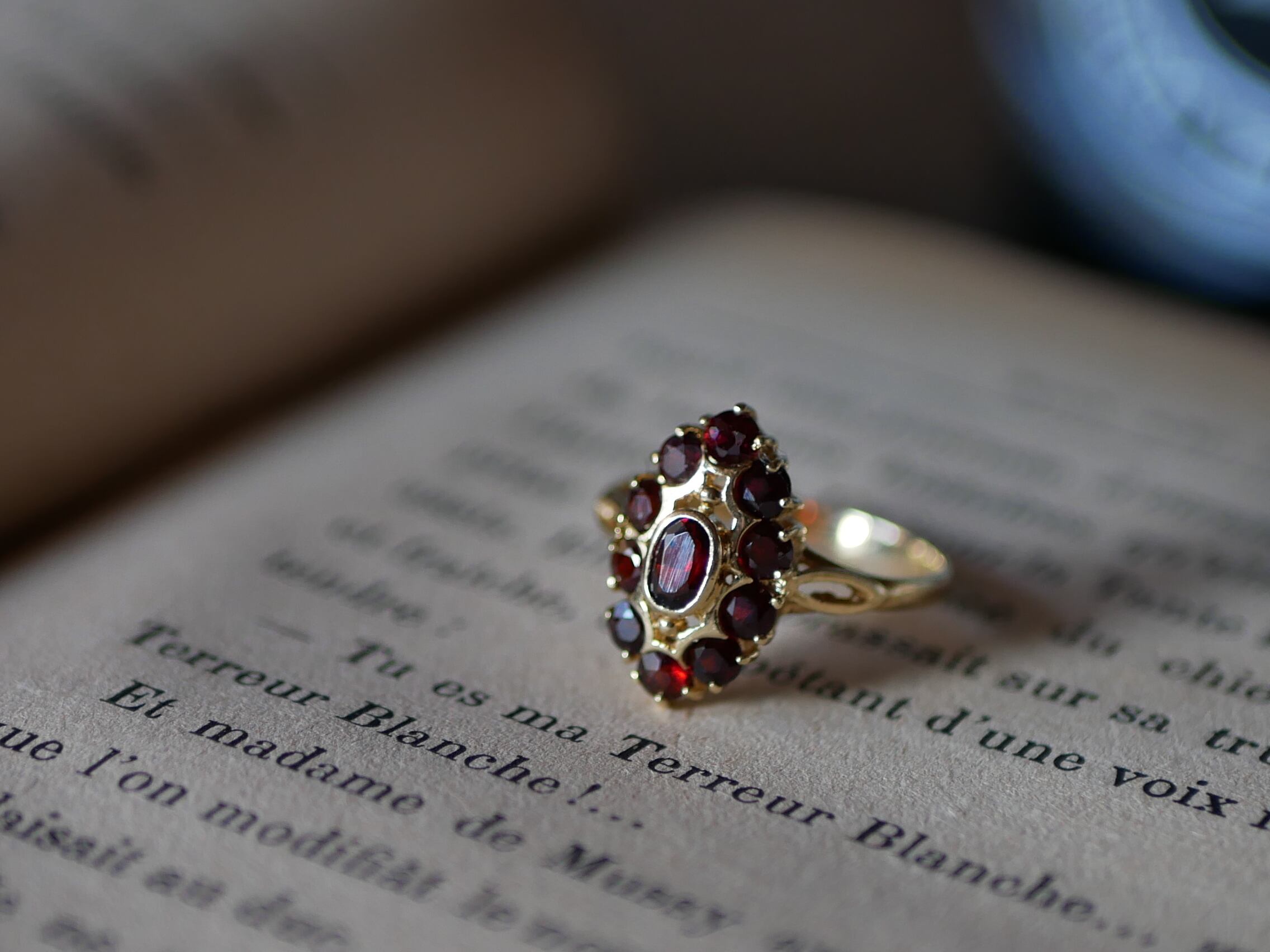メインにはオーバル型の天然ガーネット、その周りを10石のガーネットが囲んだ