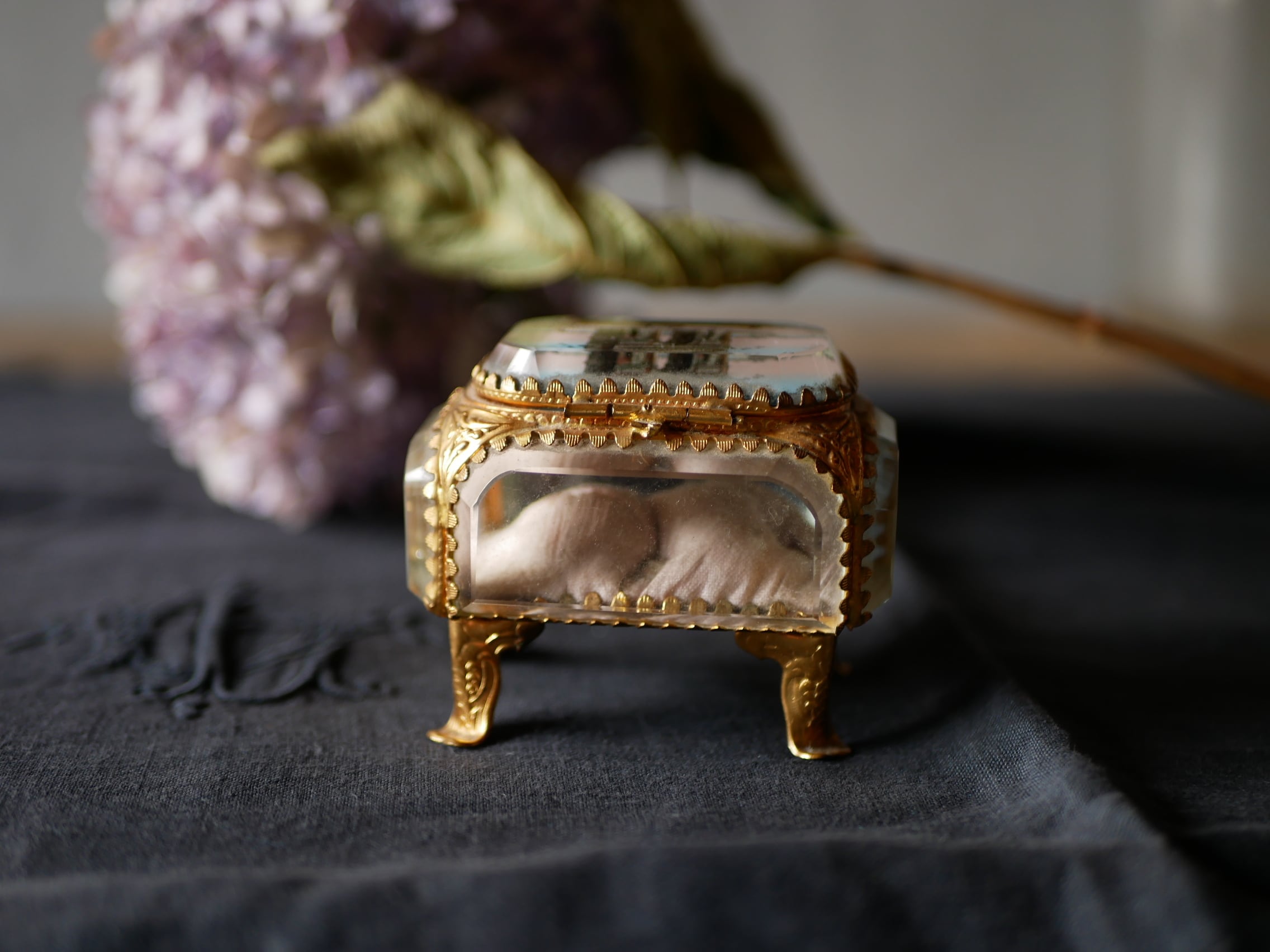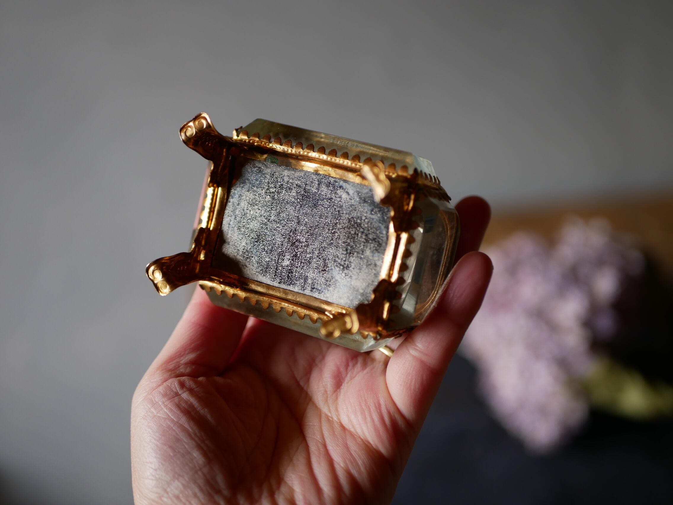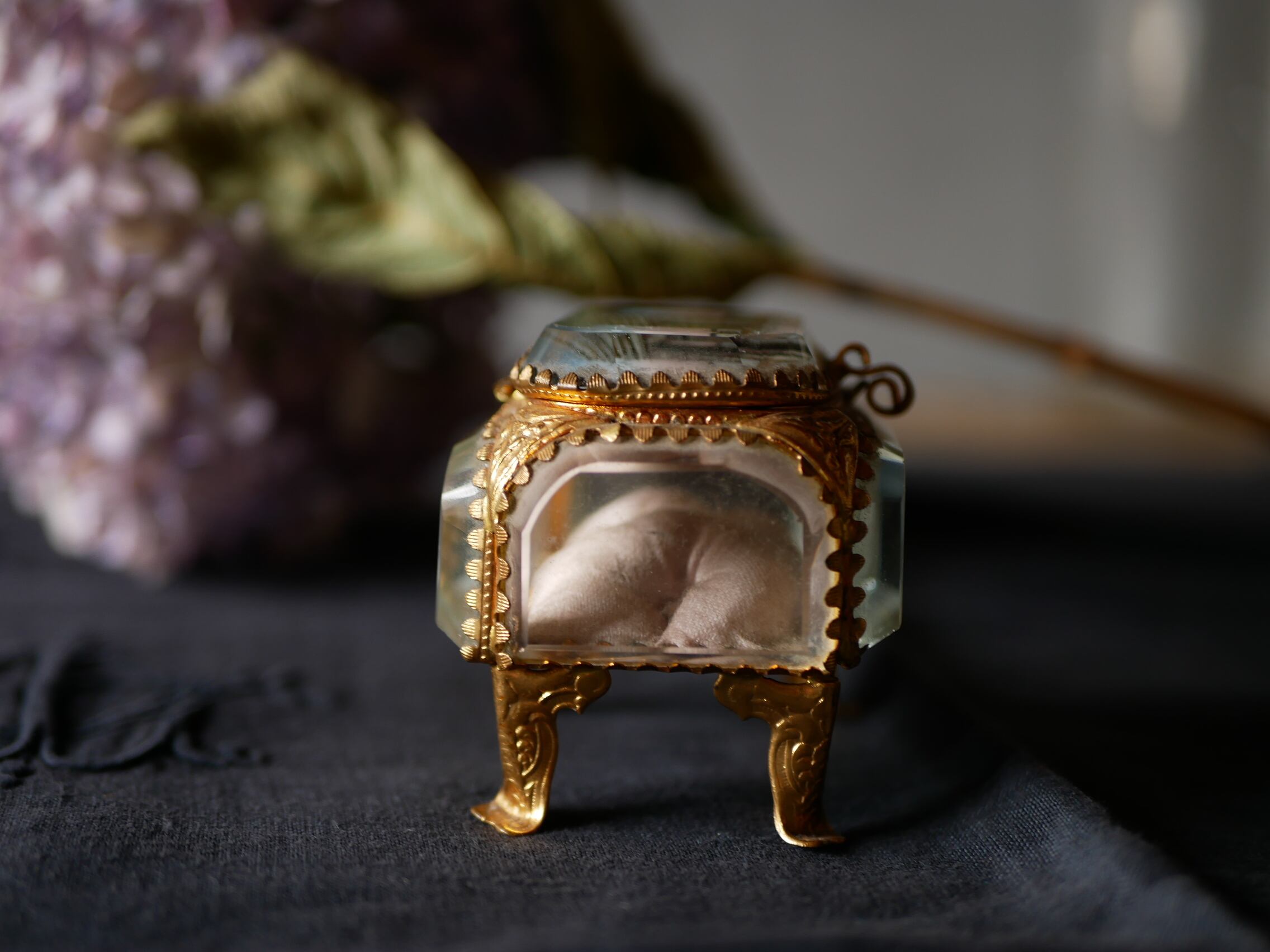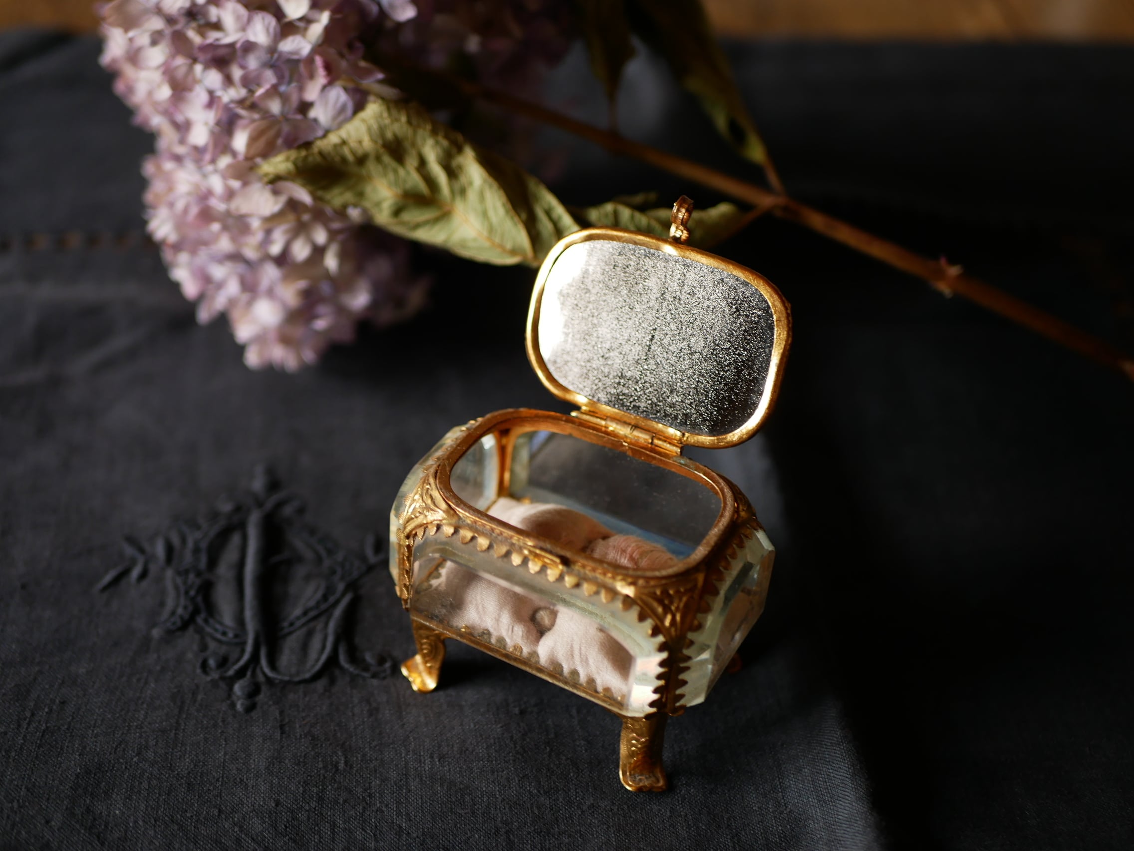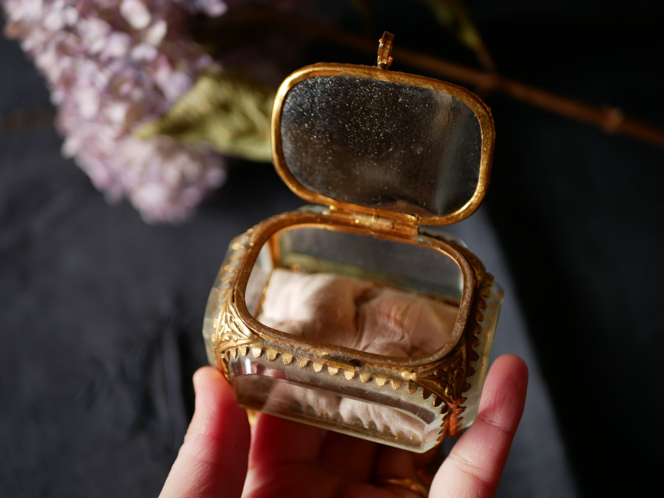 拭えない埃はあるものの、中のシルクのクッションも状態良く薄いピンク色が上品です。