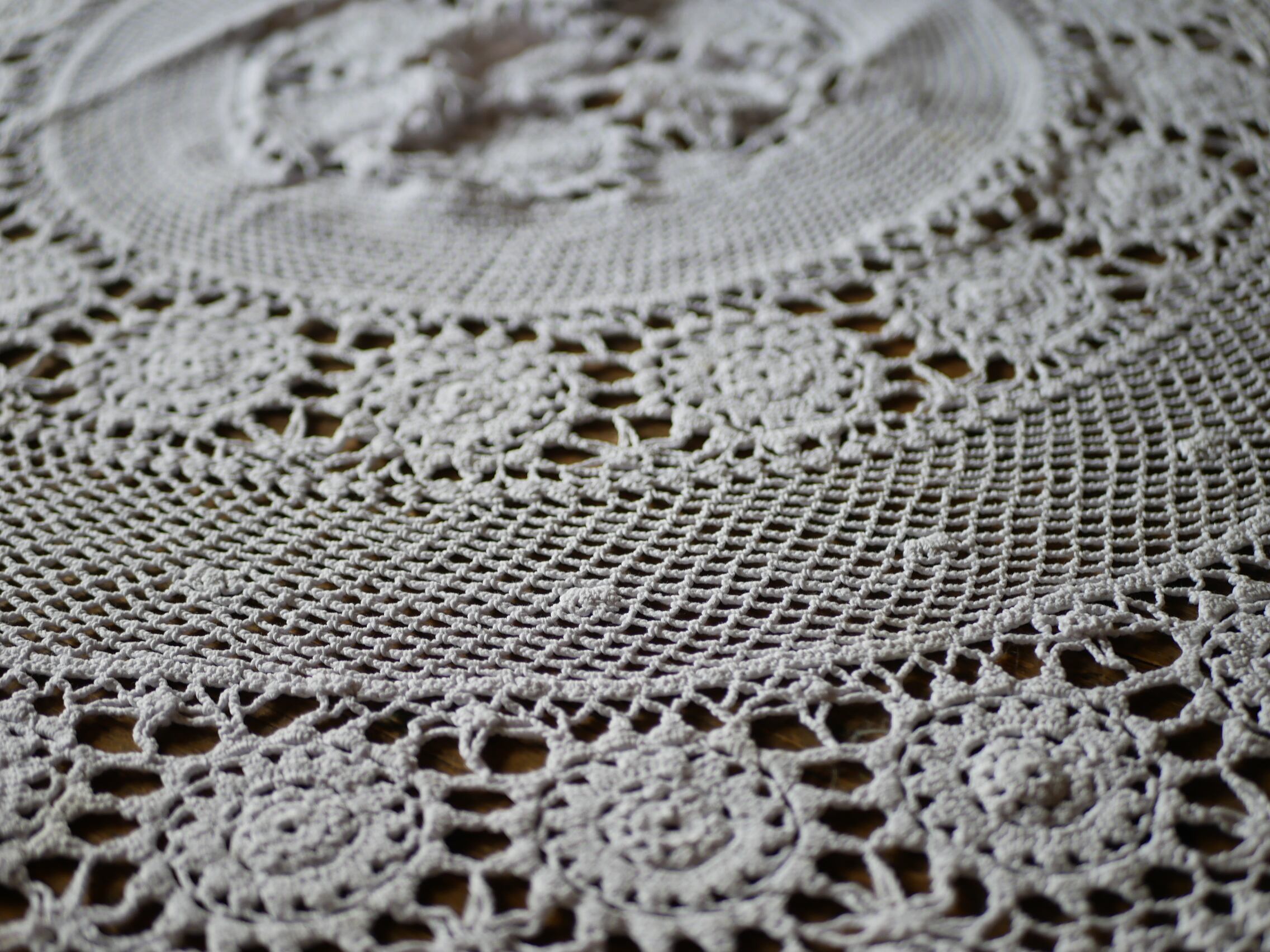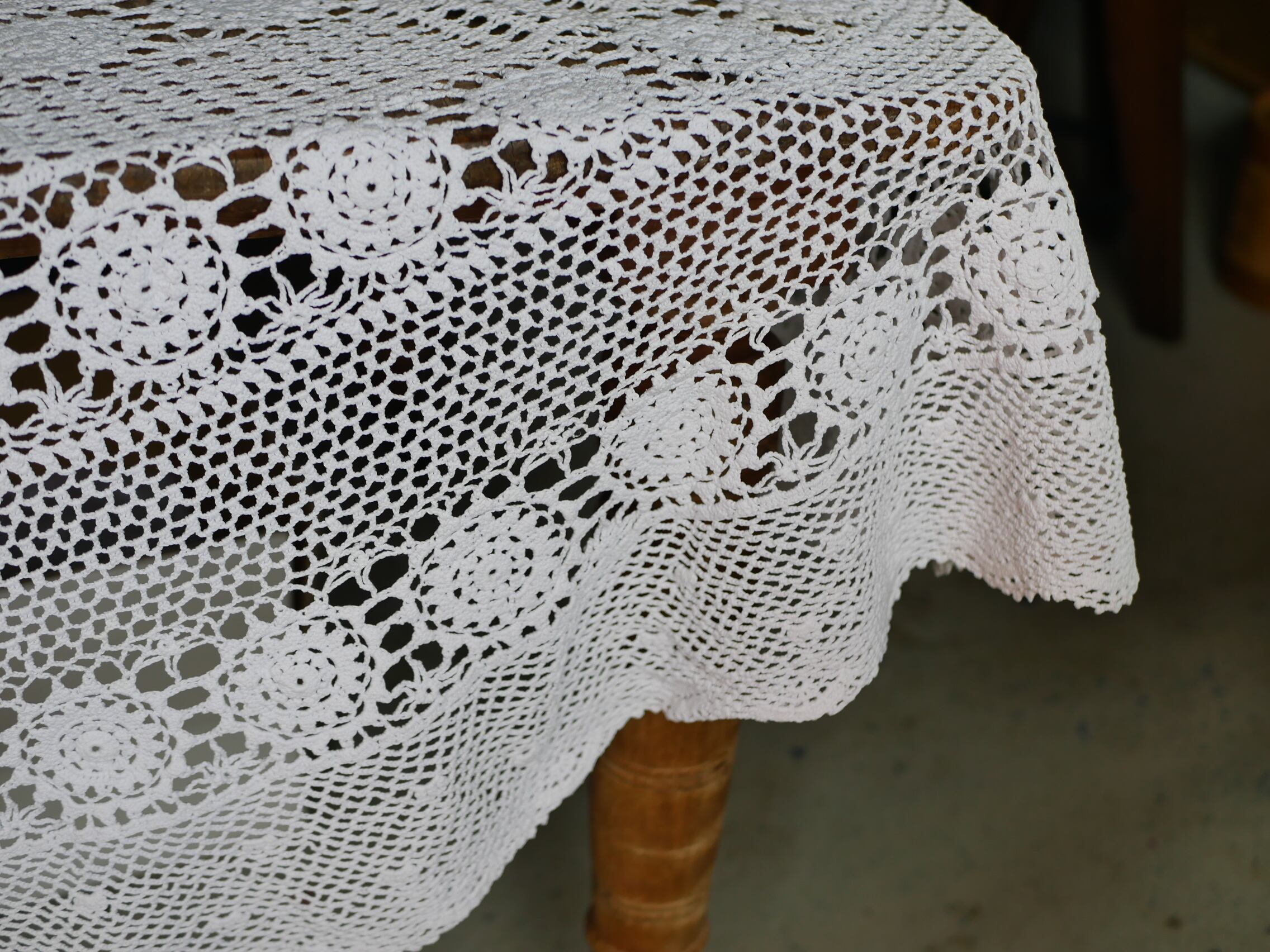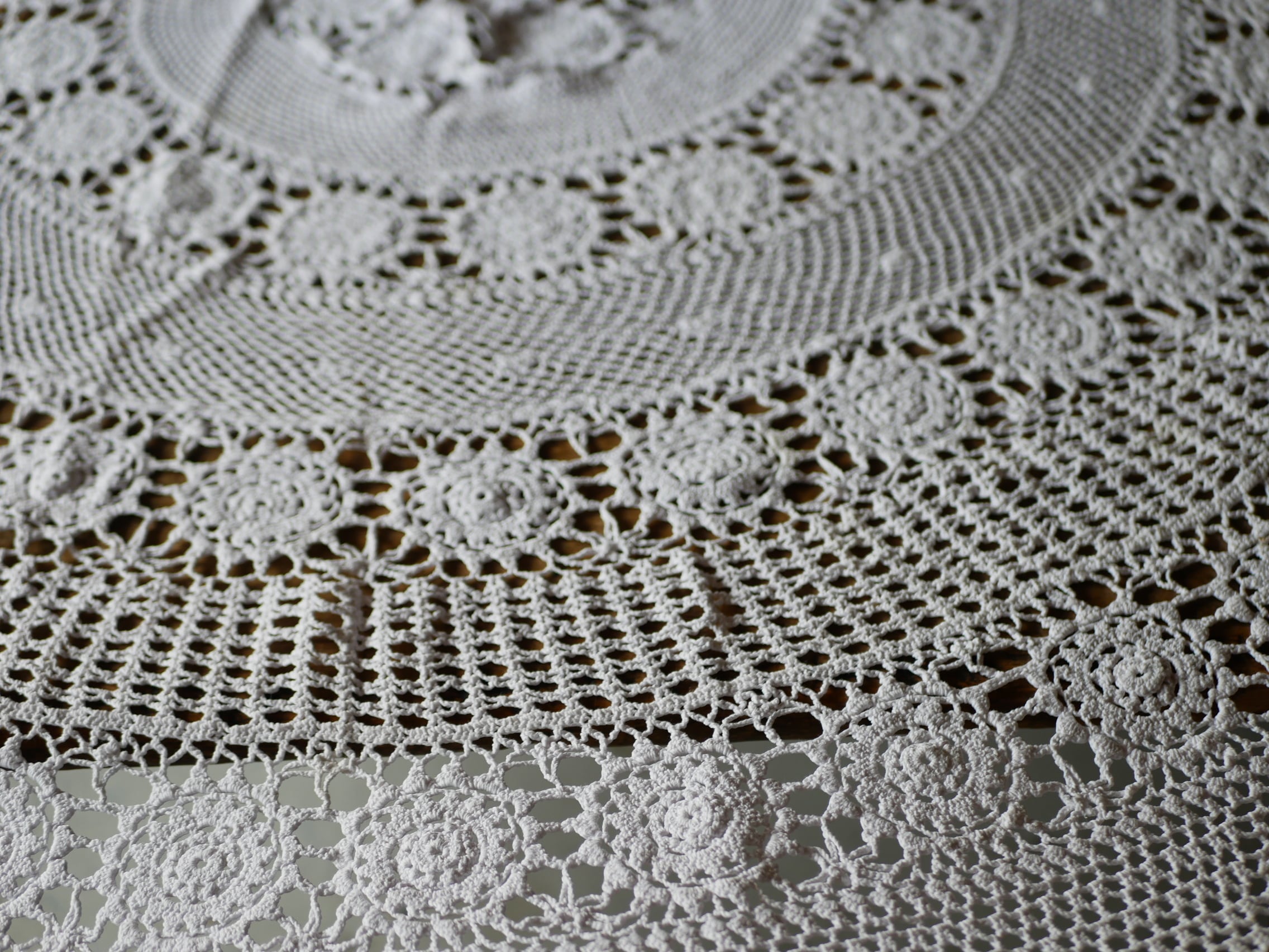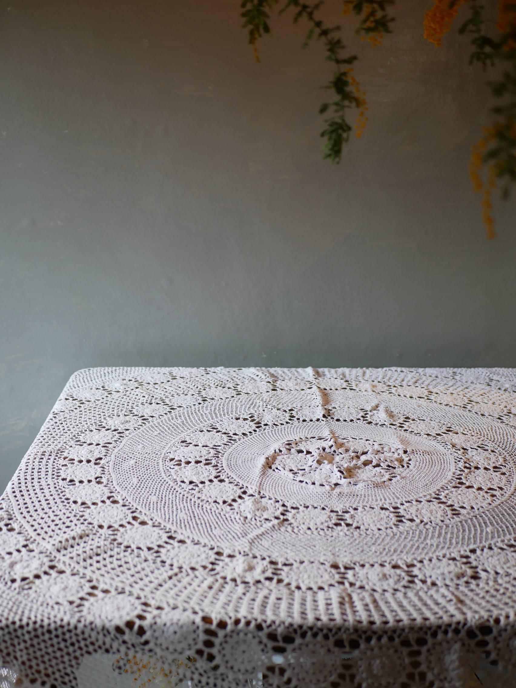 連なるクロッシェ(かぎ編み)で作られたとても大きなテーブルクロス。