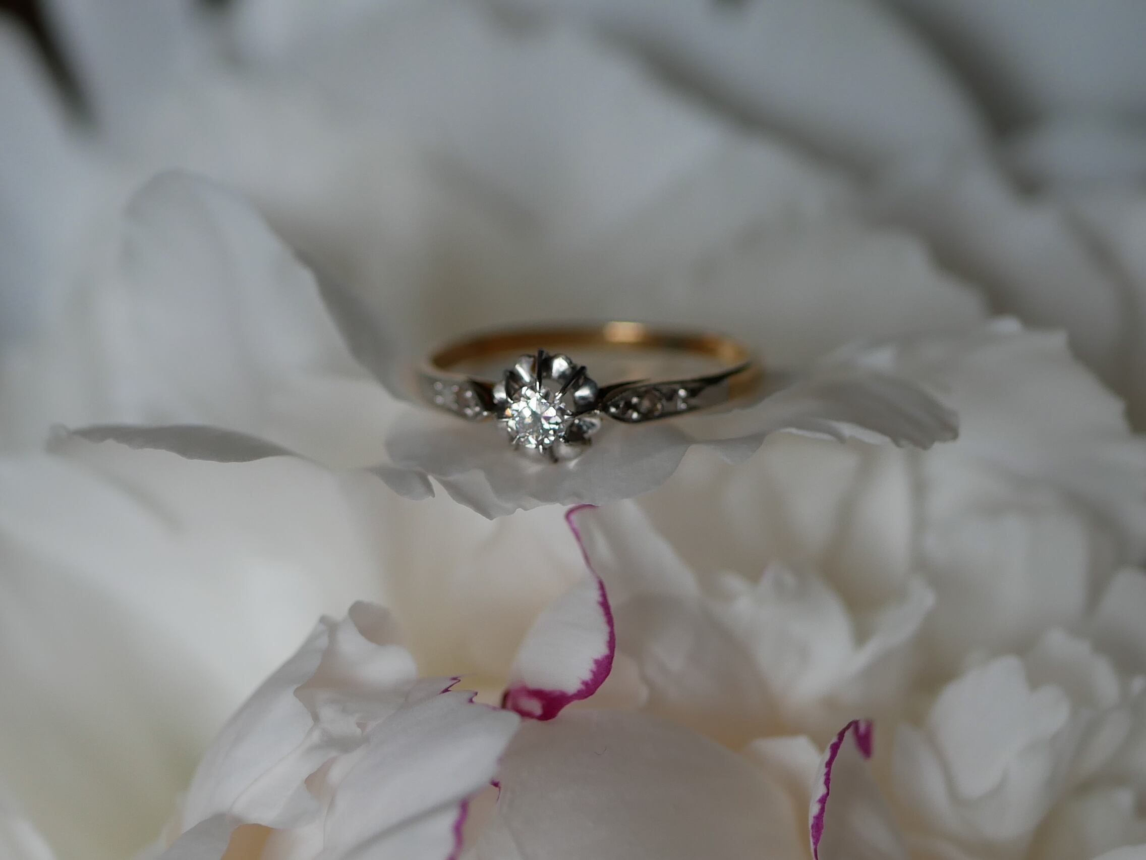 ラウンドブリリアントカットのダイヤモンドは良く輝き、内包物もほとんど見られません。