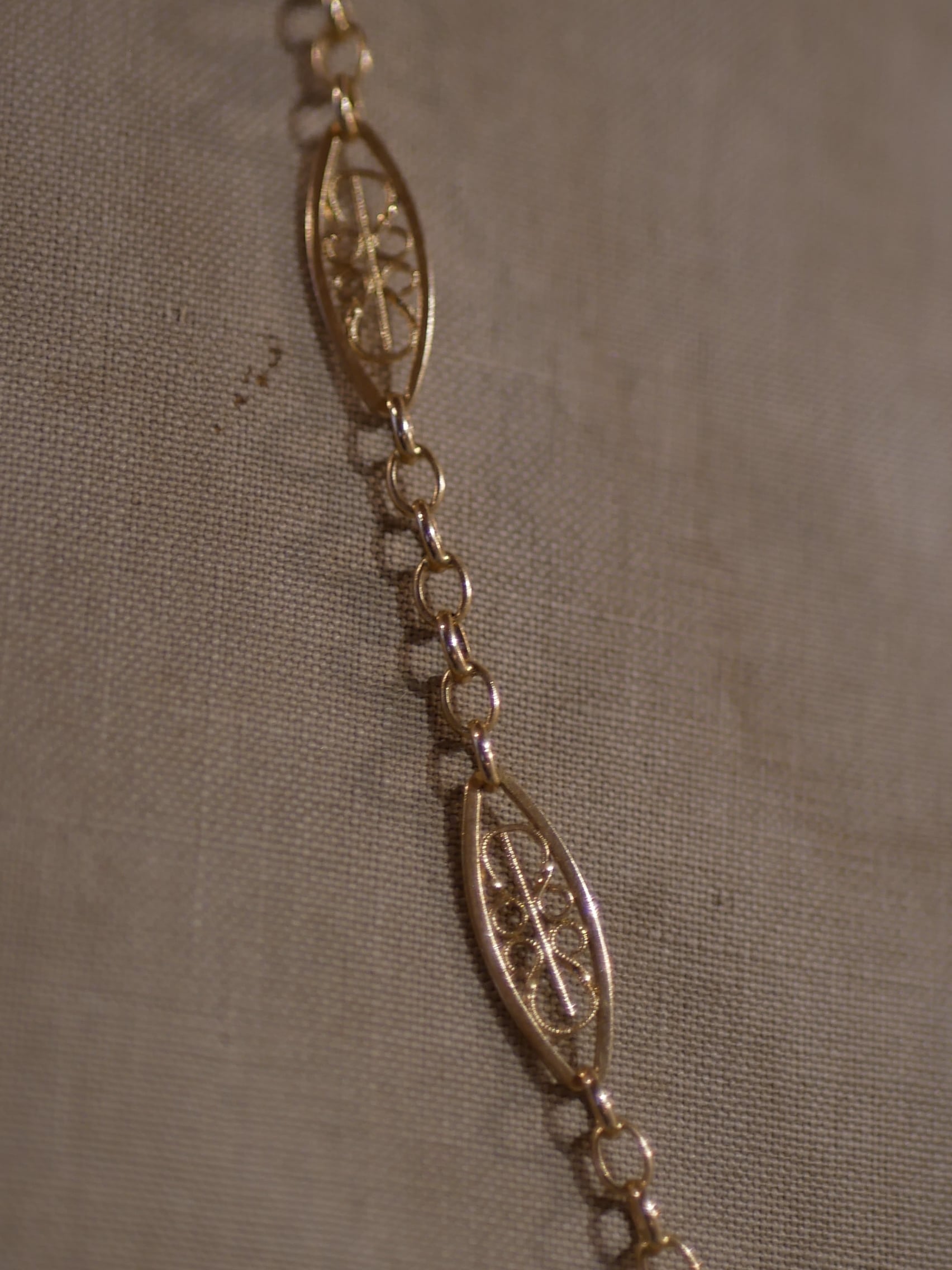 イエローゴールドで作られたこのフィリグリーネックレスは上品さとシンプルでありながら華やかさを兼ね備えたジュエリーです。