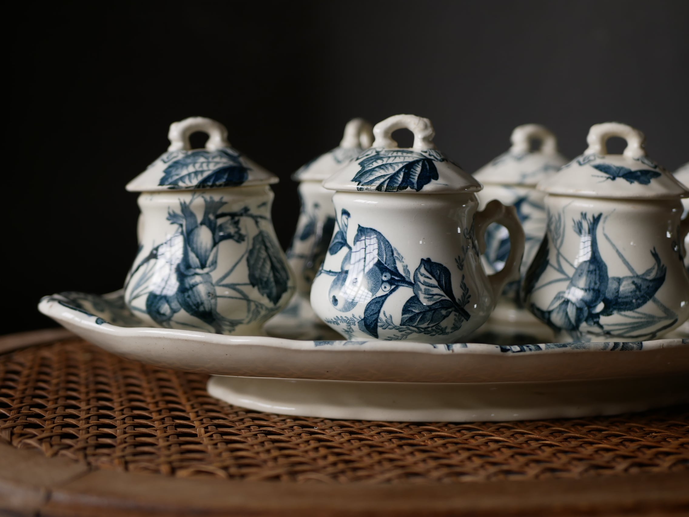 小さくぽってりした形のクリームポットには虫や蝶々の絵柄と共に花や葉っぱが生き生きと描かれています。