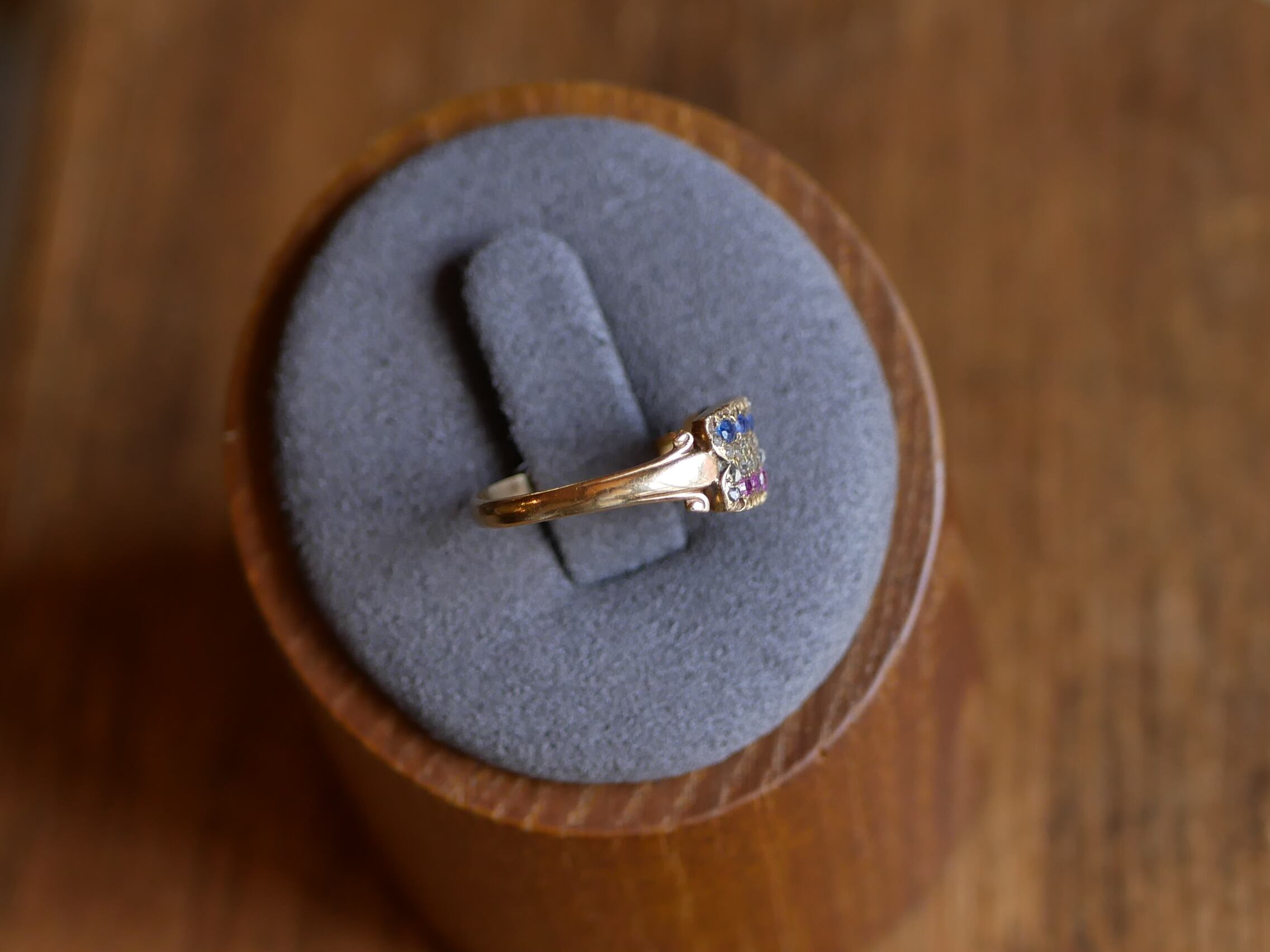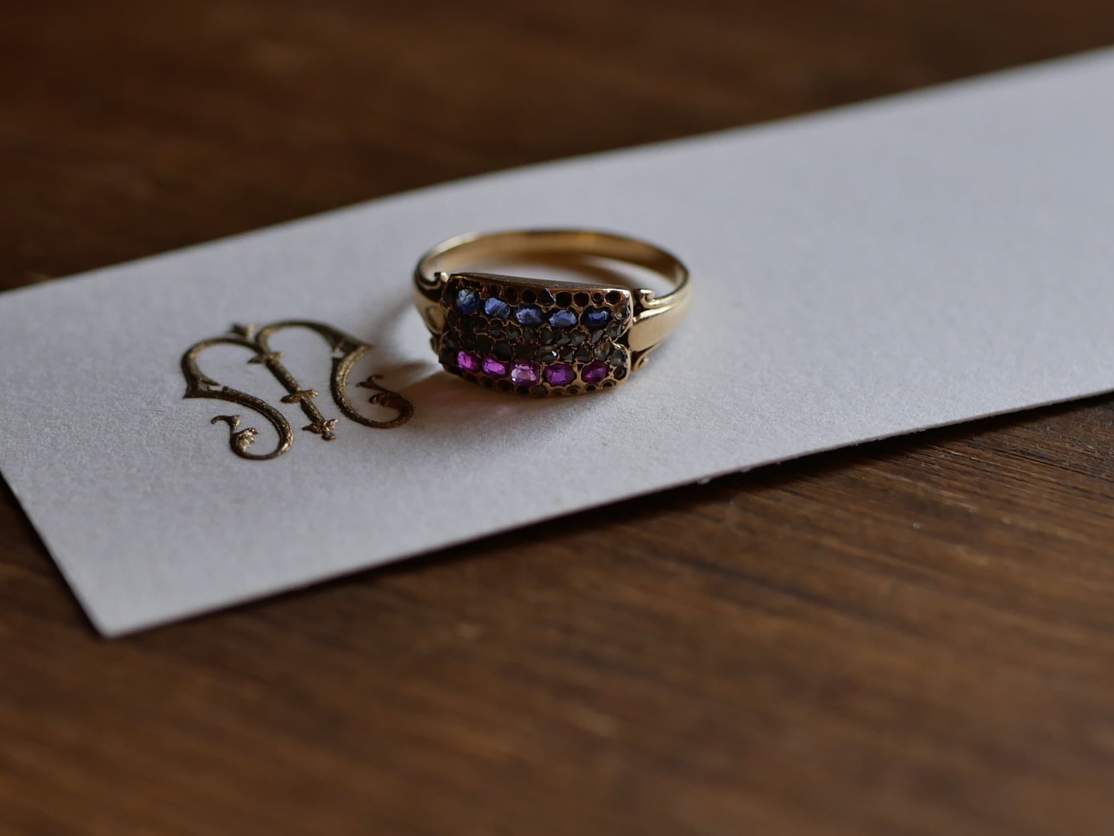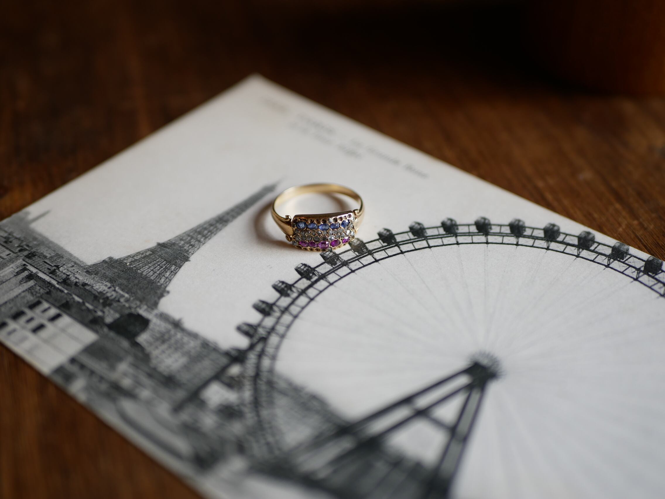 フレンチカラー、トリコロールの華奢なアンティークリングです。