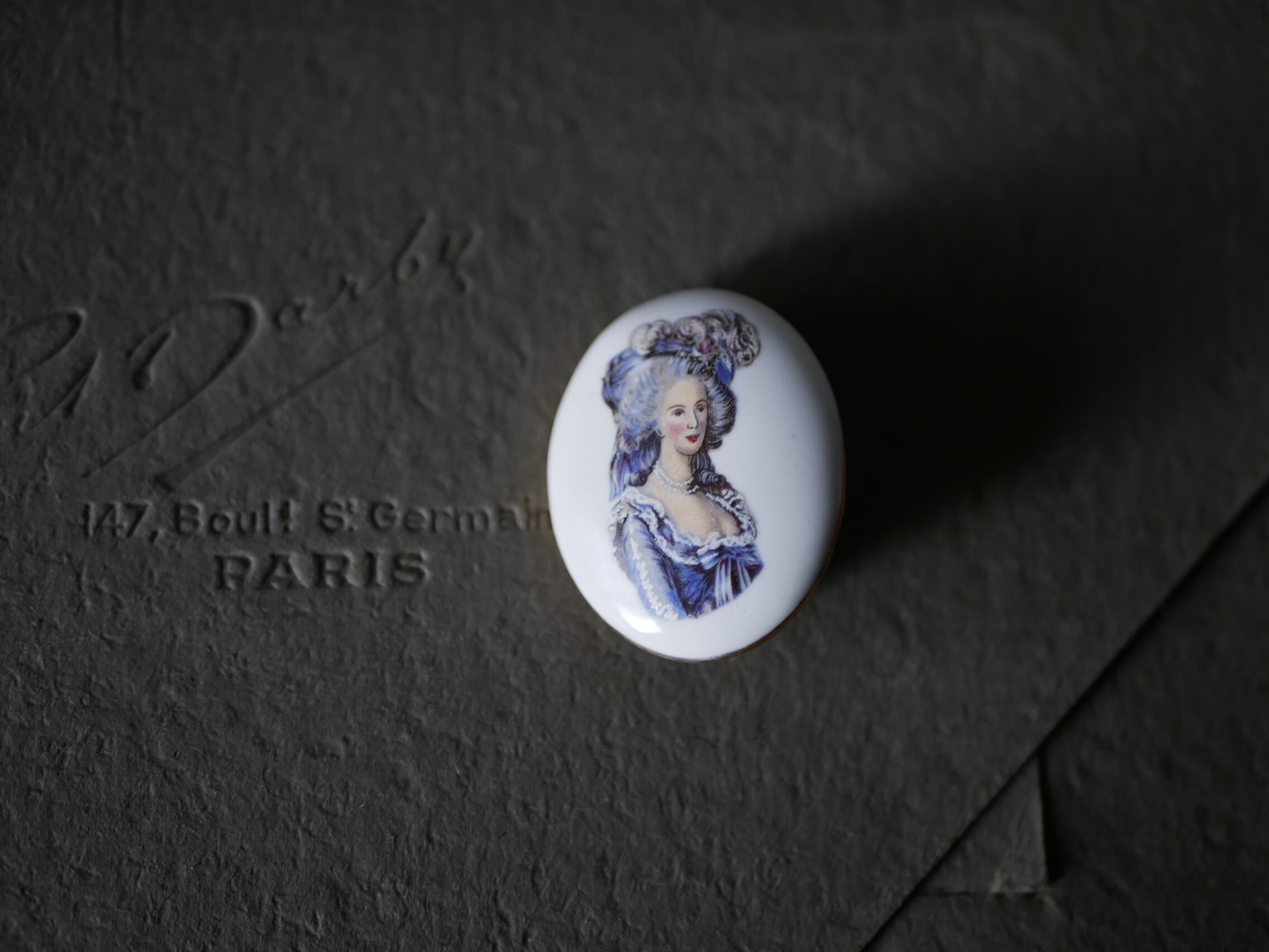 お洒落な貴婦人が描かれたアンティークブローチ。