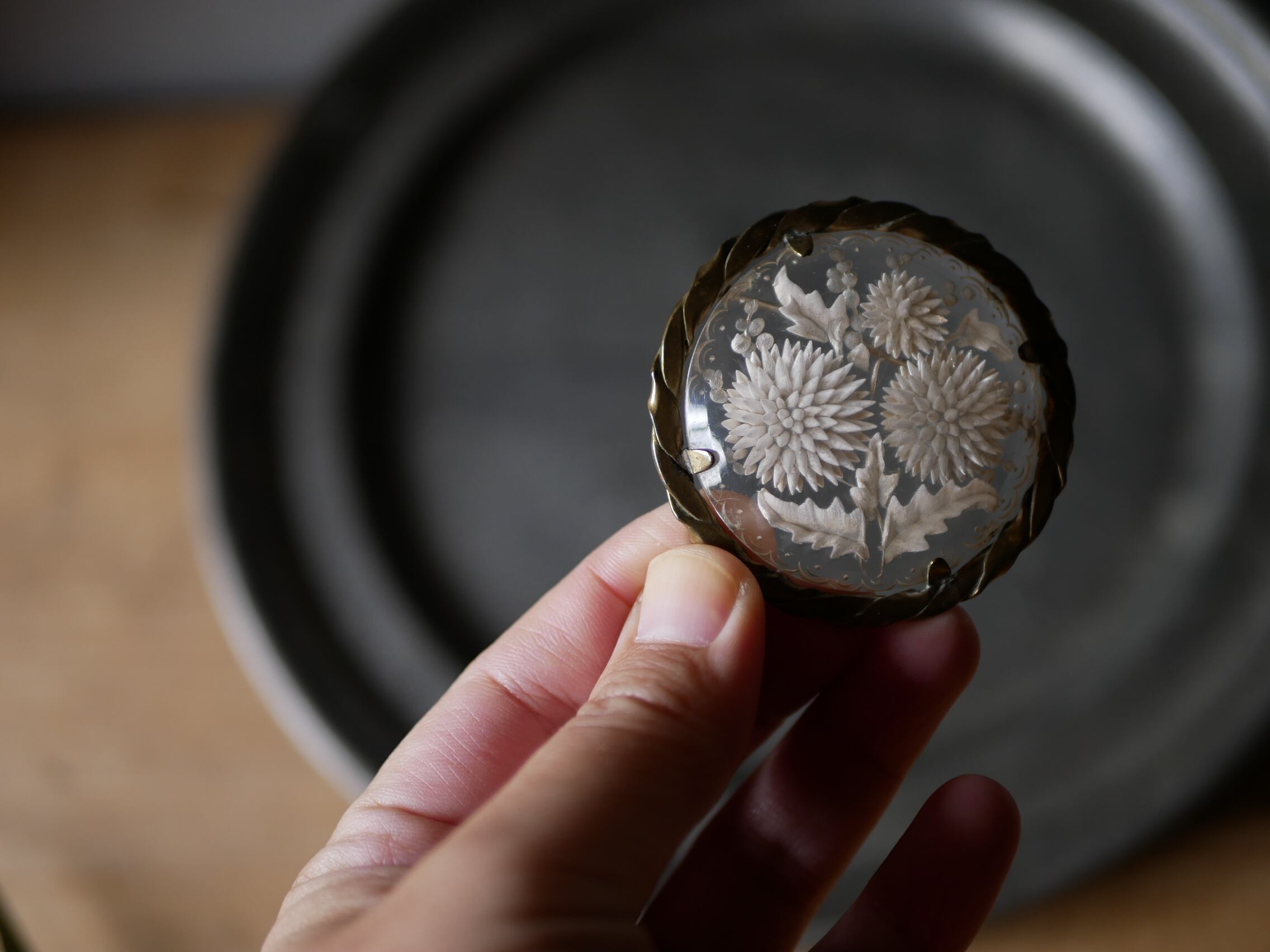 びっしりとスペースいっぱいにダリアがデザインされたルーサイトブローチです。