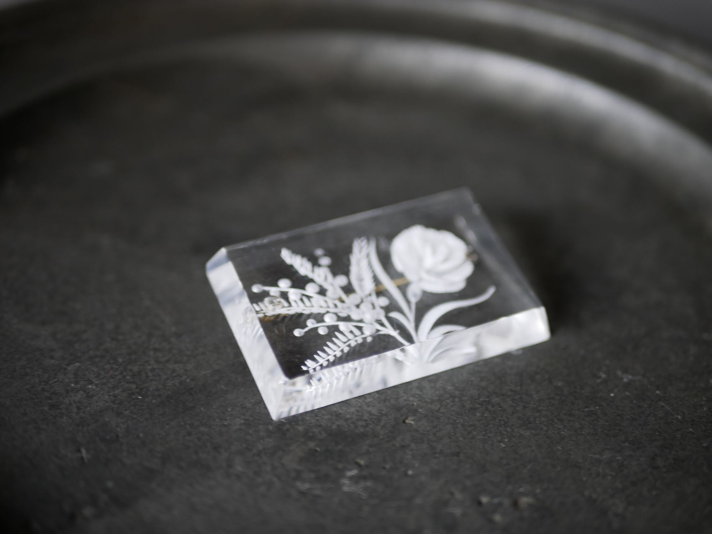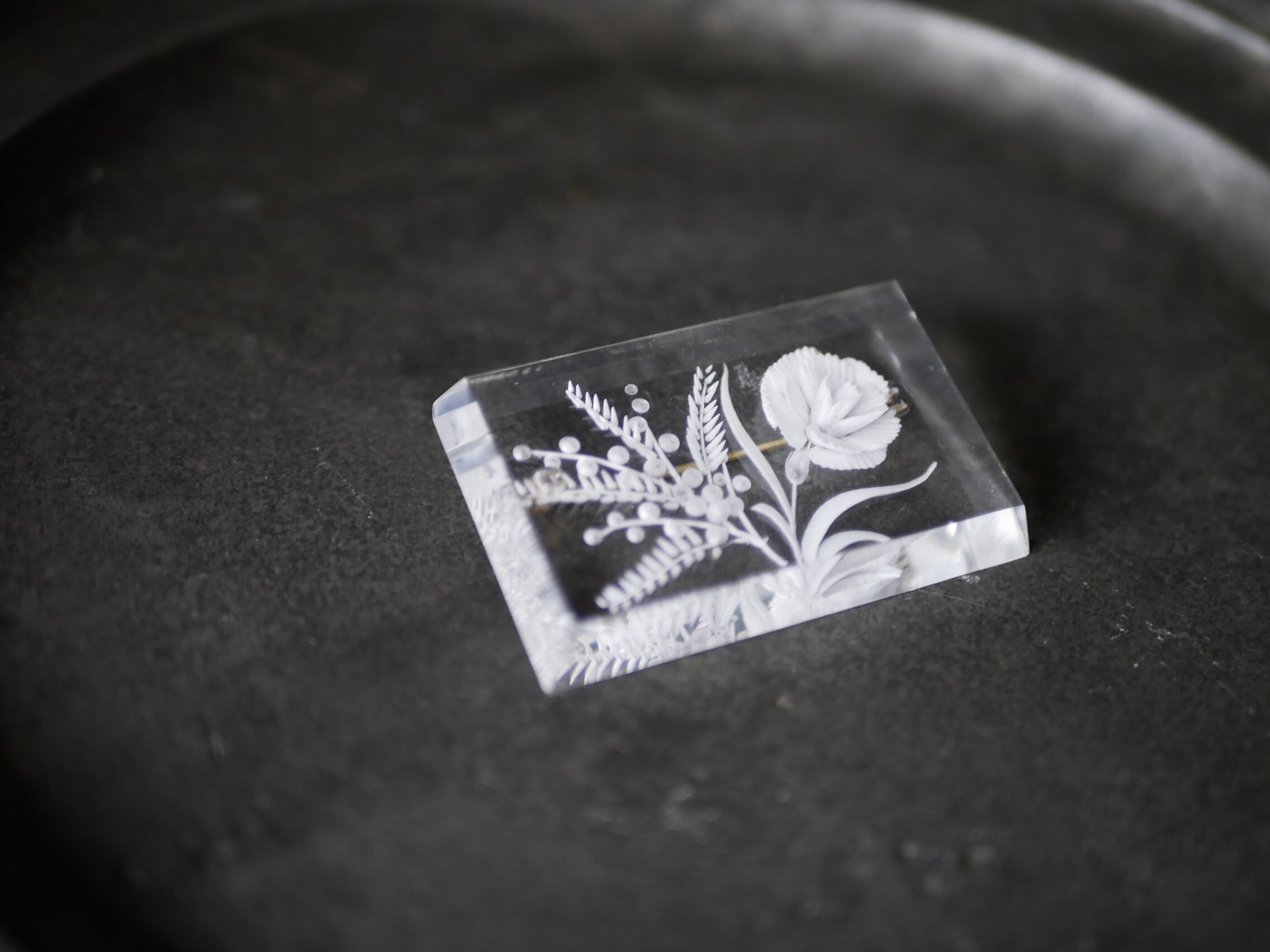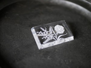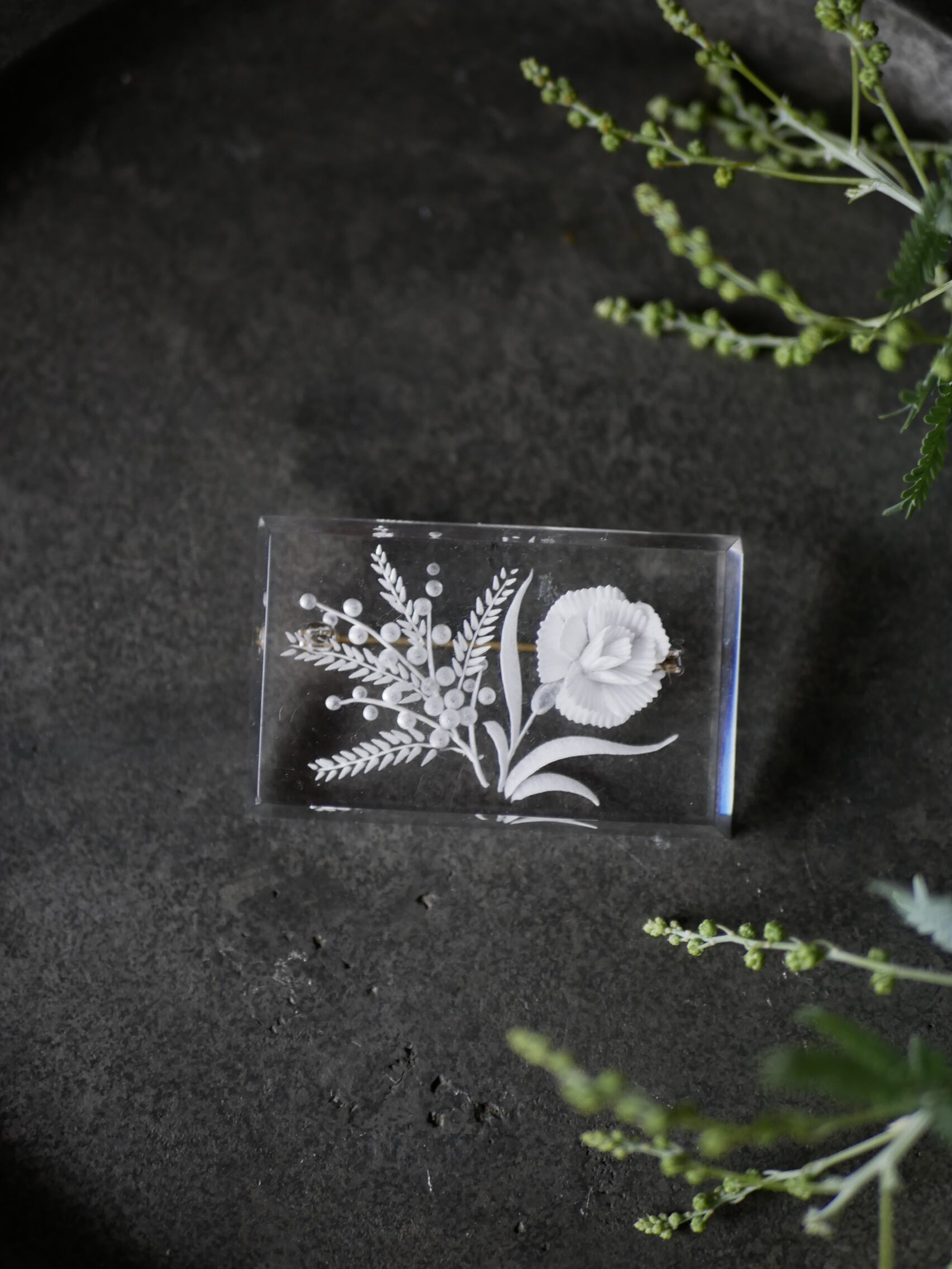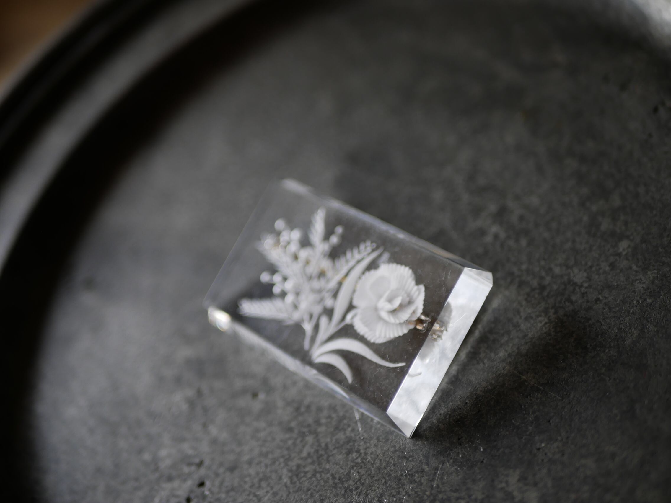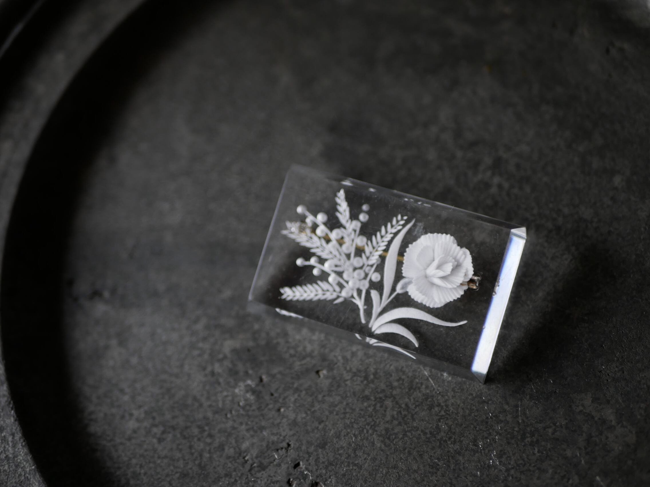白がとても綺麗でミモザの葉やバラの花びらが繊細に彫られています。