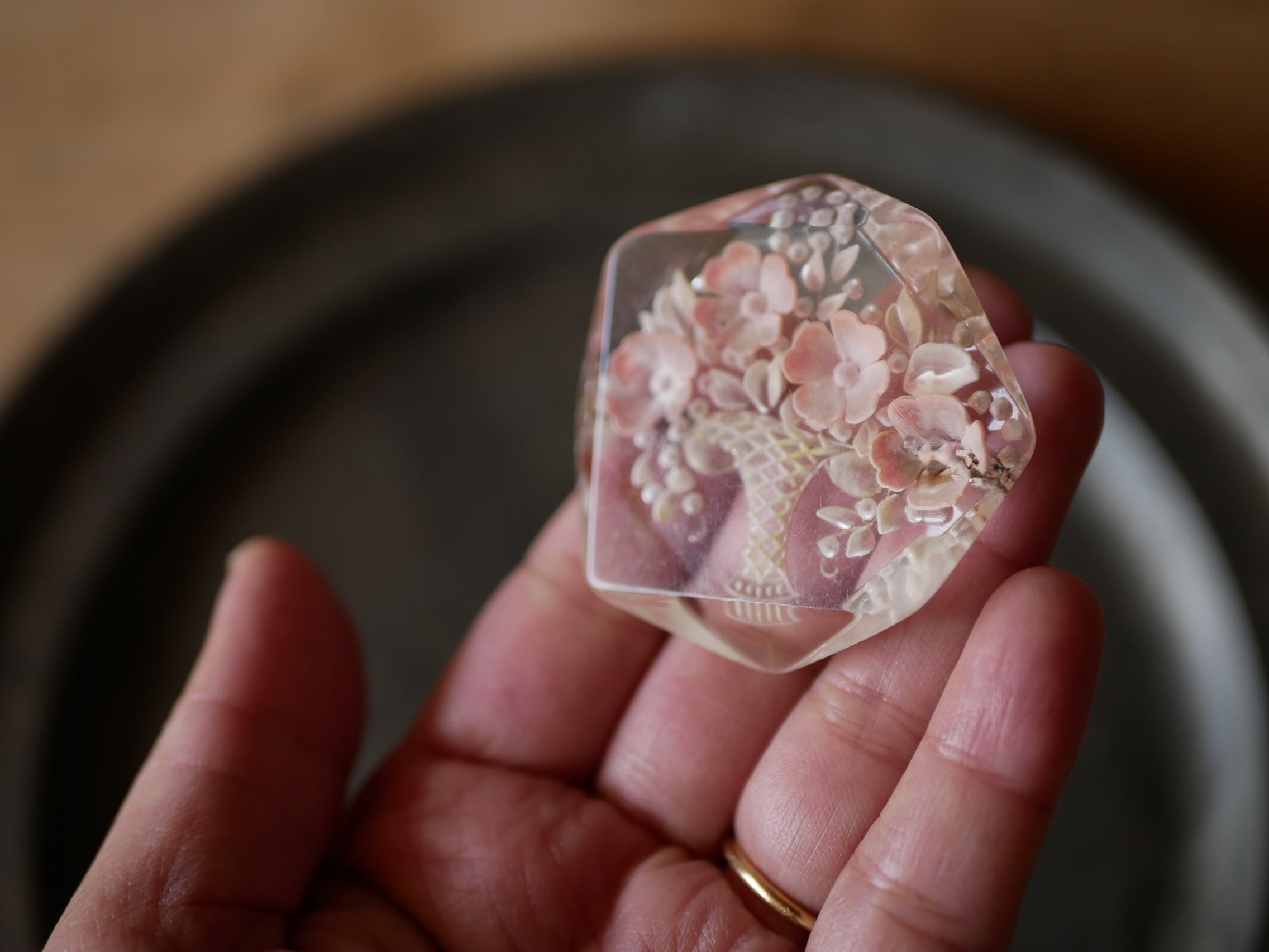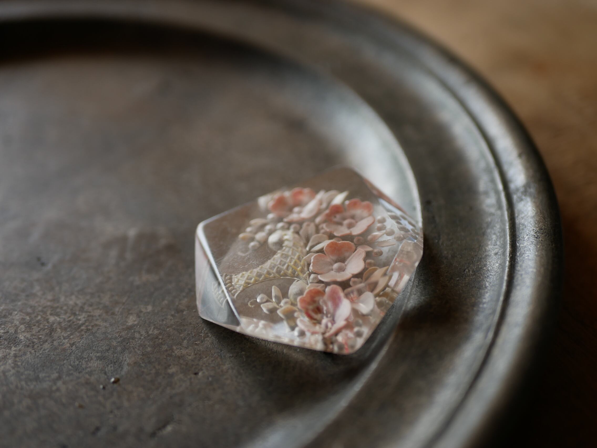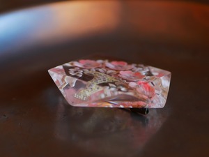 薄ピンクが可愛らしく見つけた時に心躍ったルーサイトブローチです。