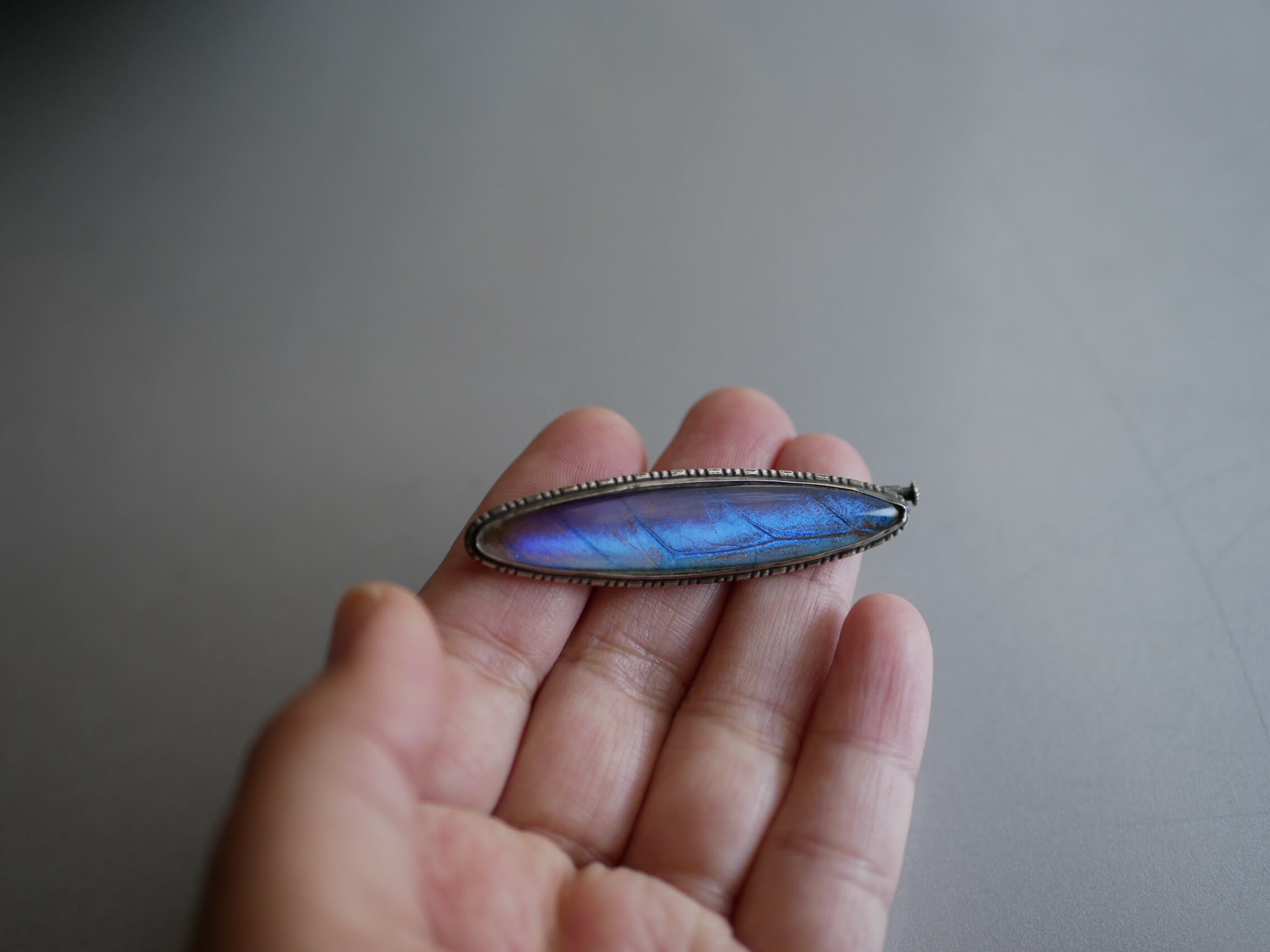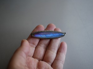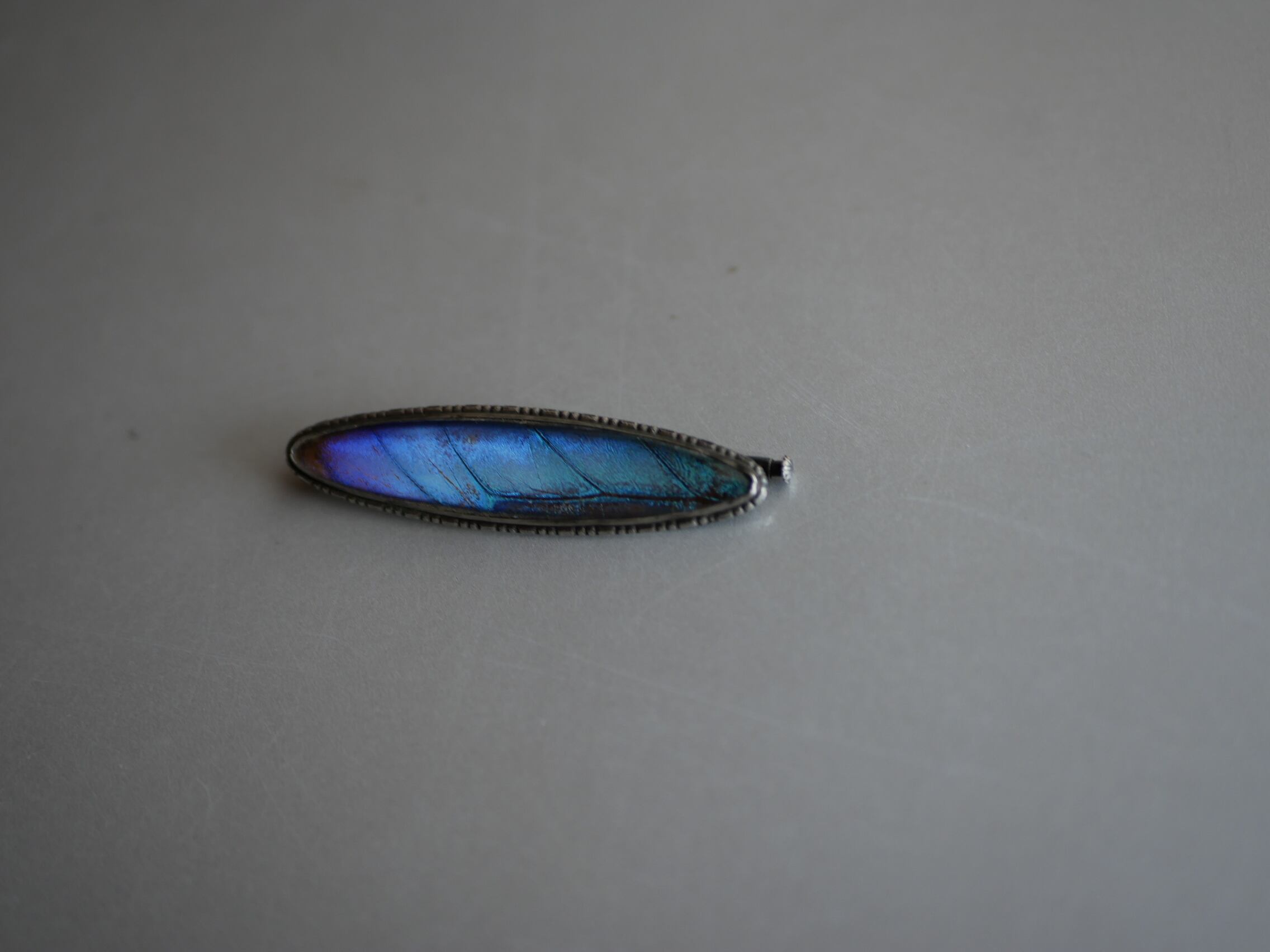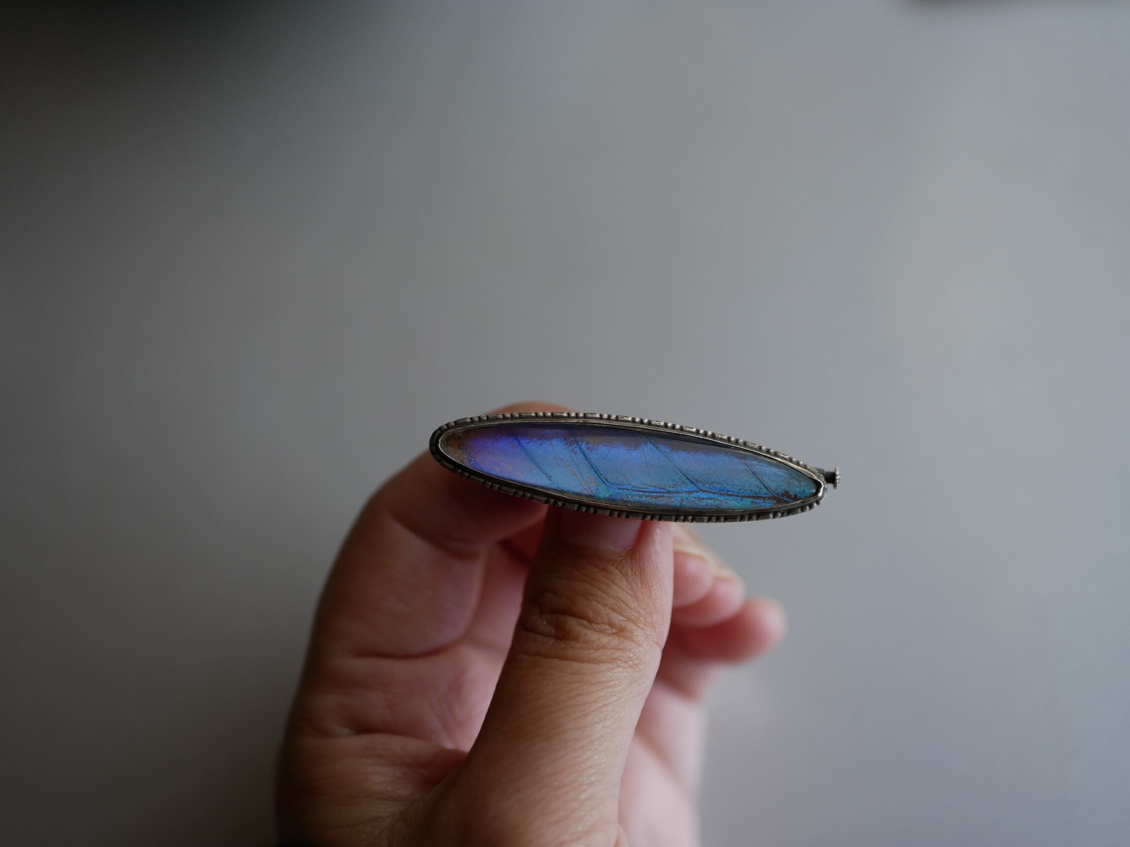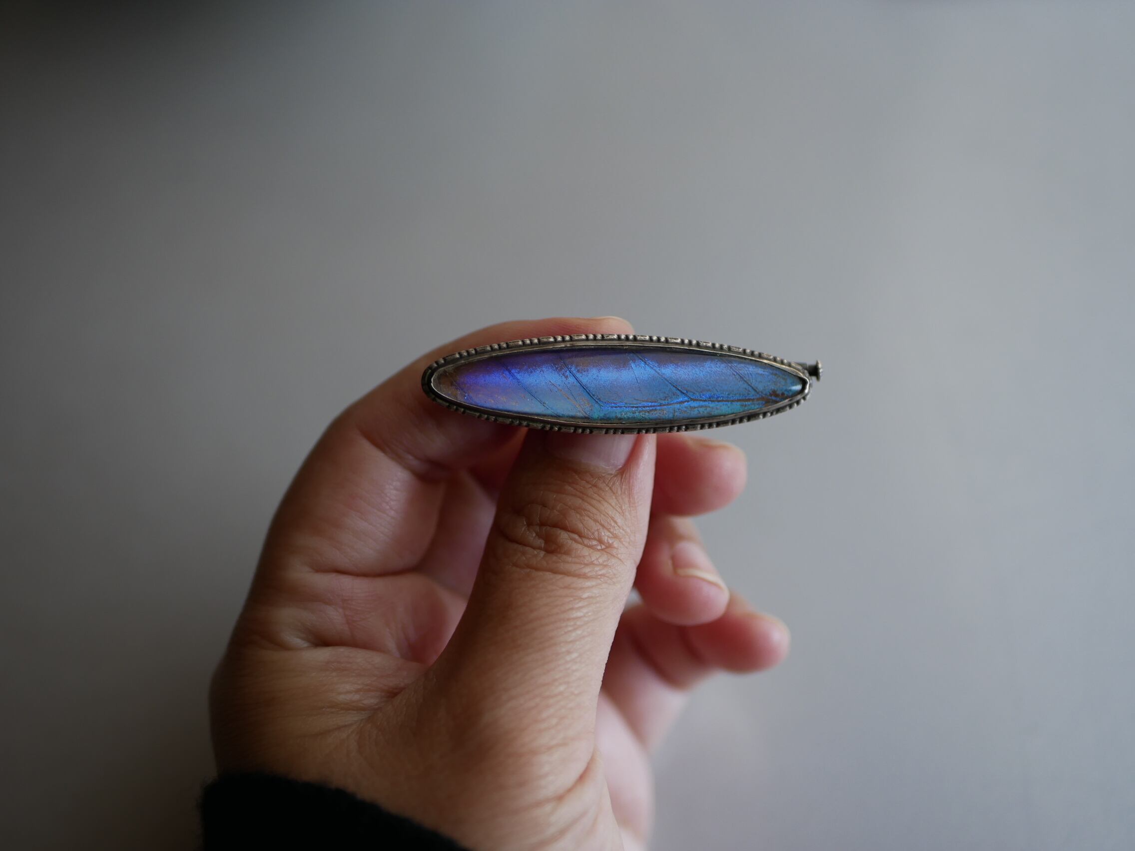 たくさん写真を撮りましたが、角度や光の当たり方によって本当に表情を変えるモルフォ蝶のブローチです。