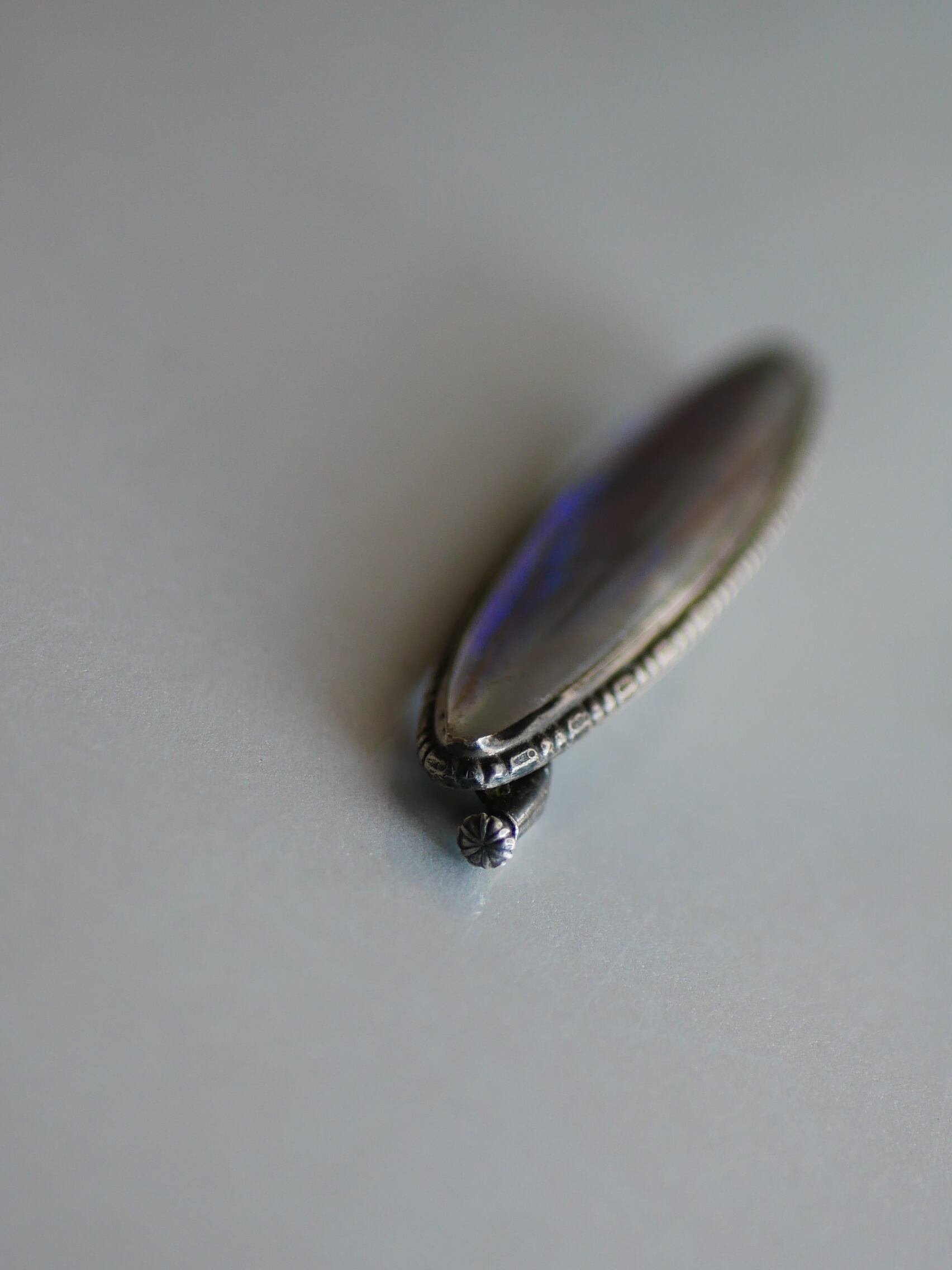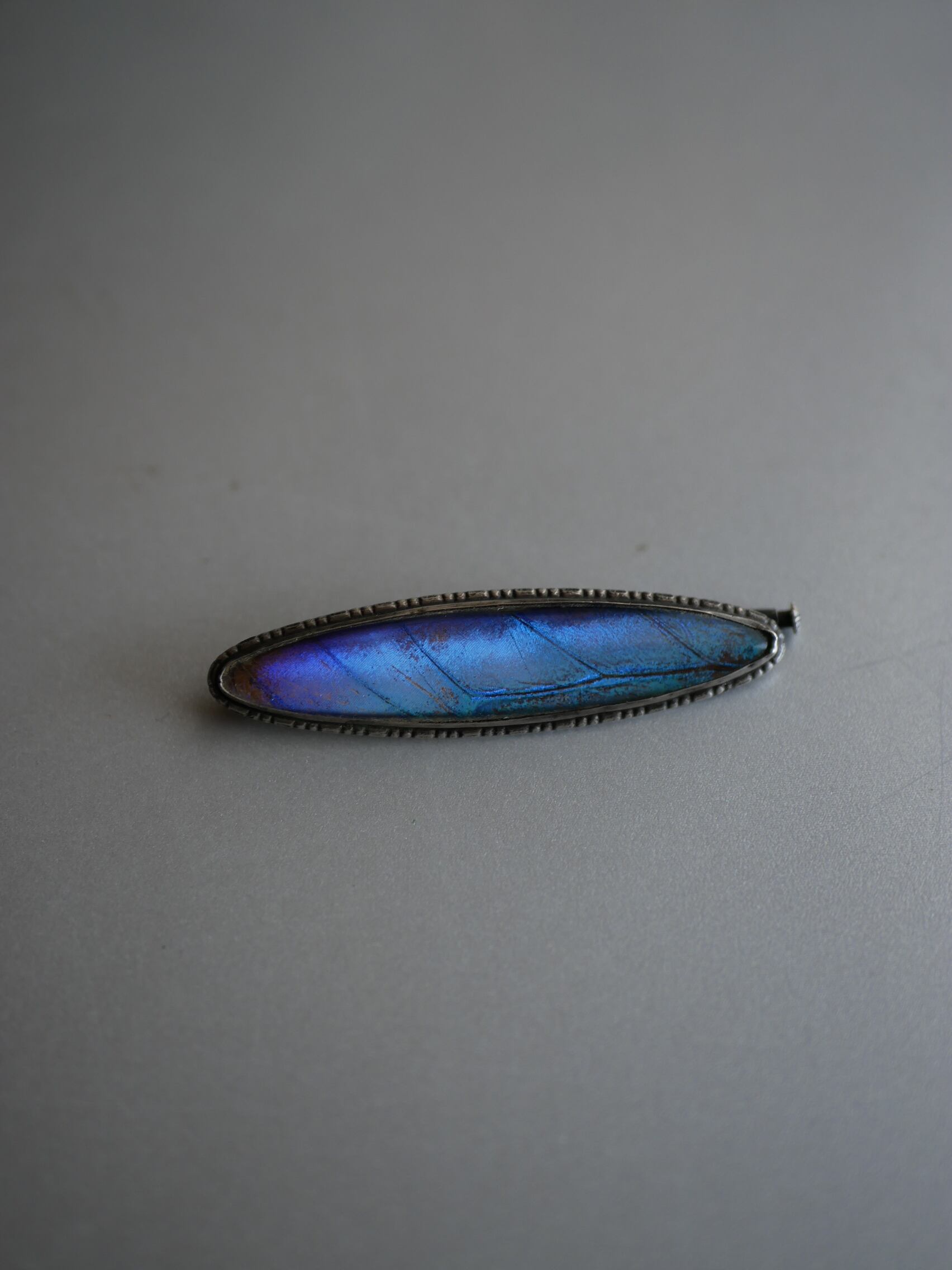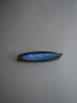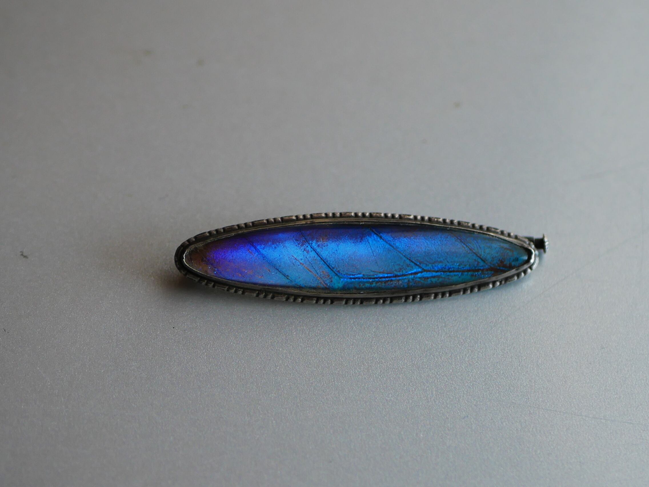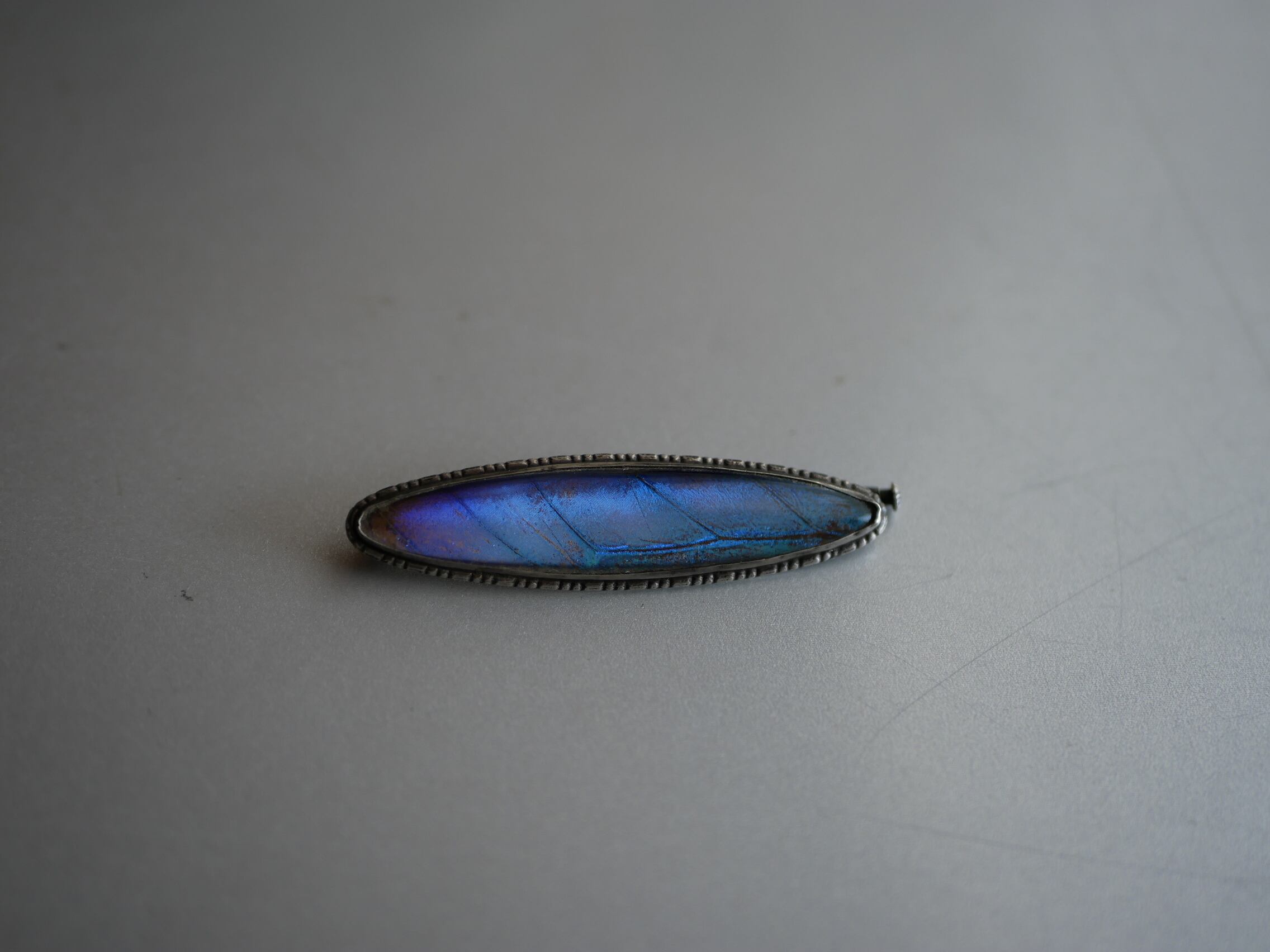 たくさん写真を撮りましたが、角度や光の当たり方によって本当に表情を変えるモルフォ蝶のブローチです。