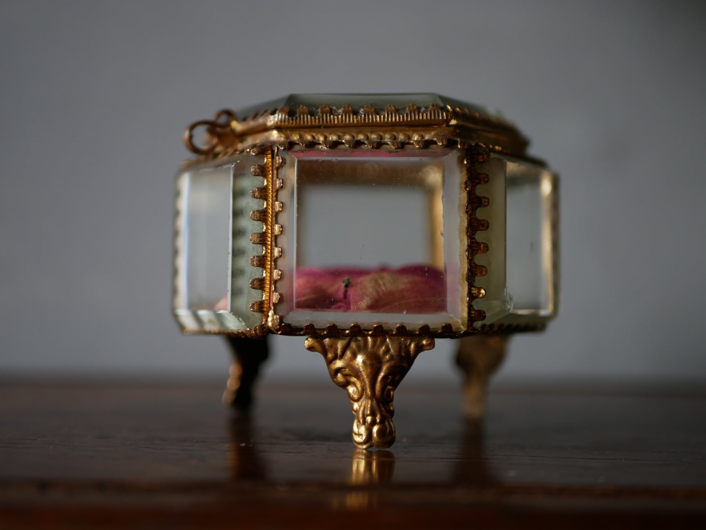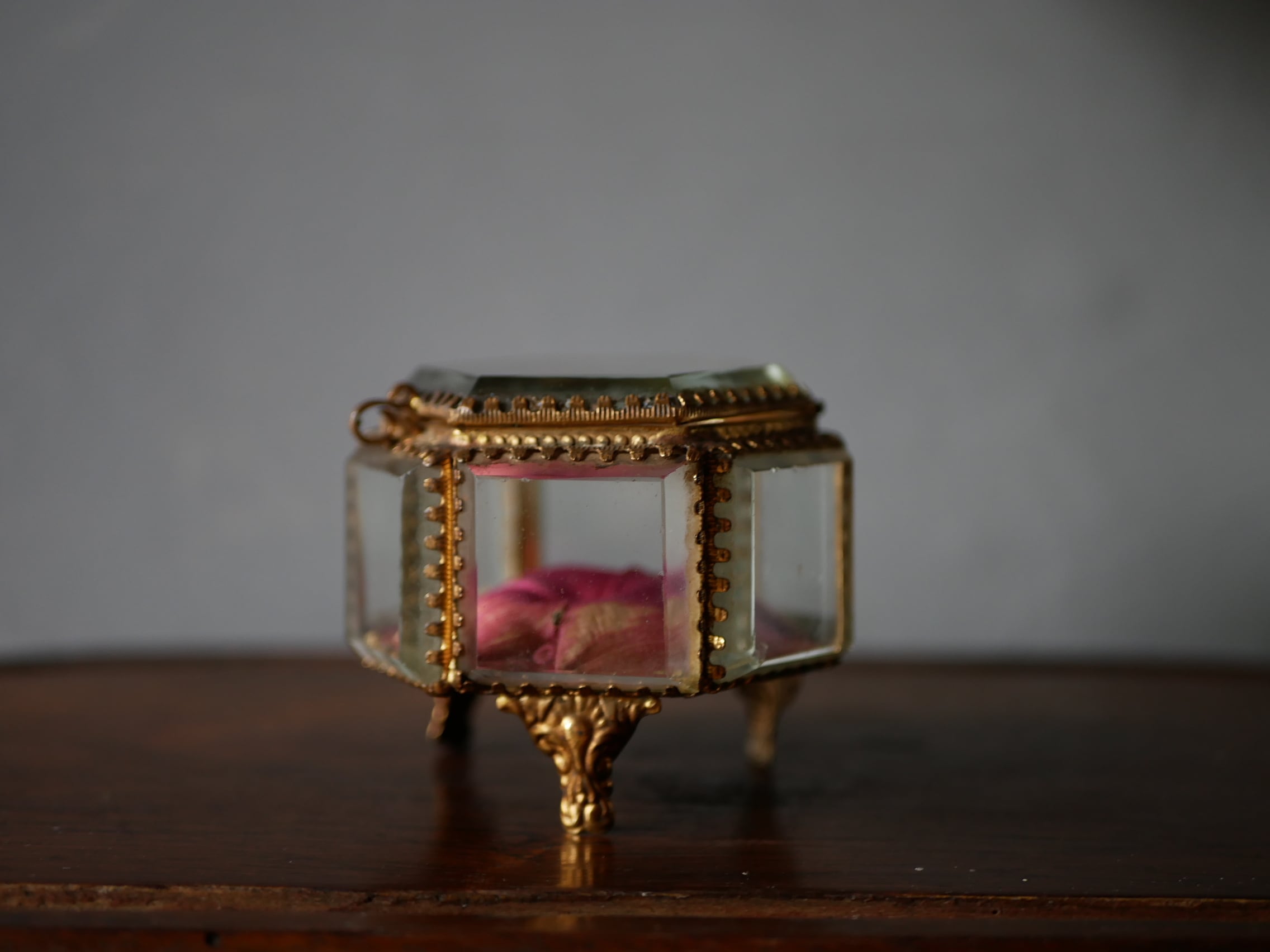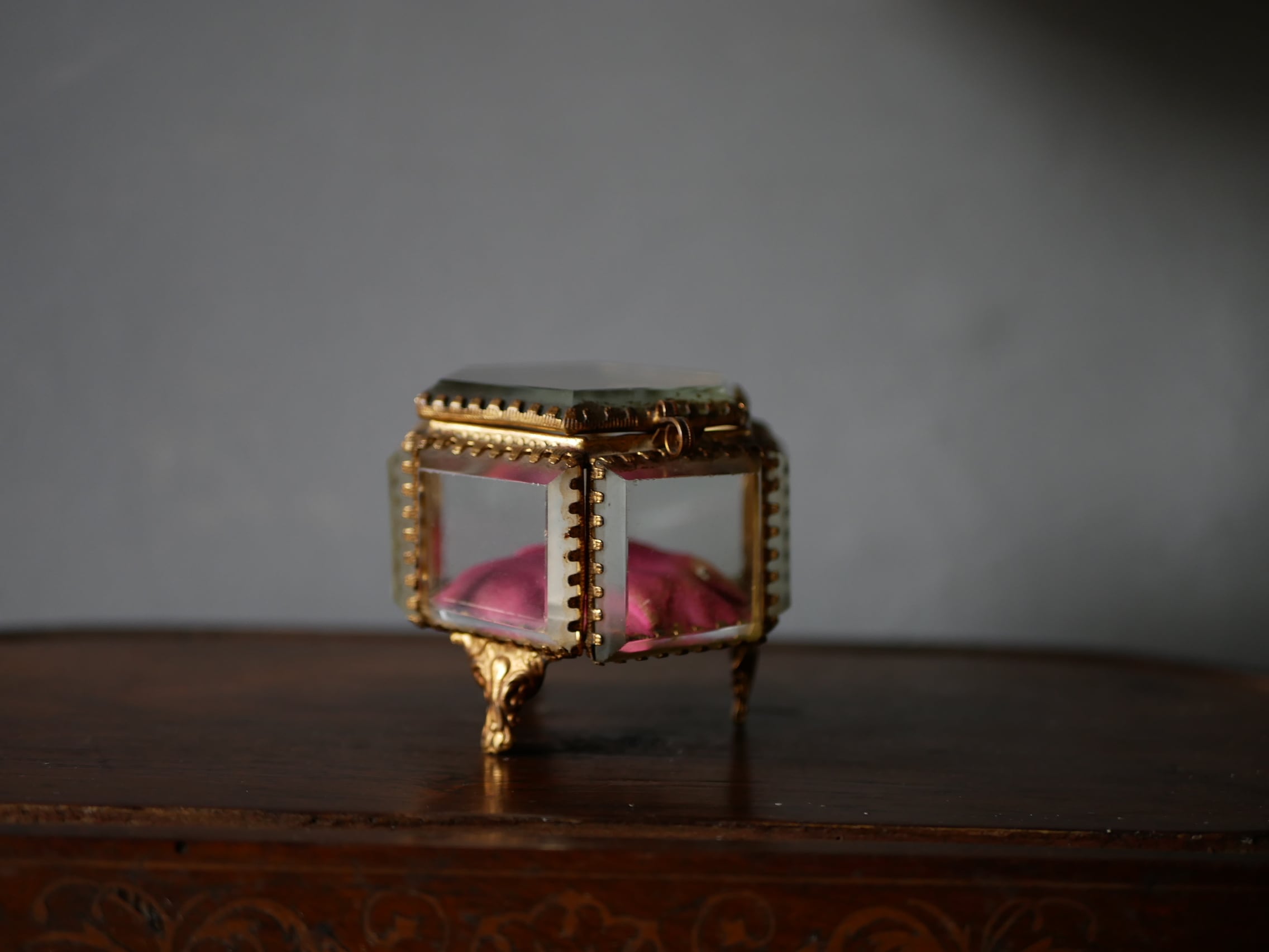 厚いガラスでつくられたフランスアンティークのジュエリーボックス。
