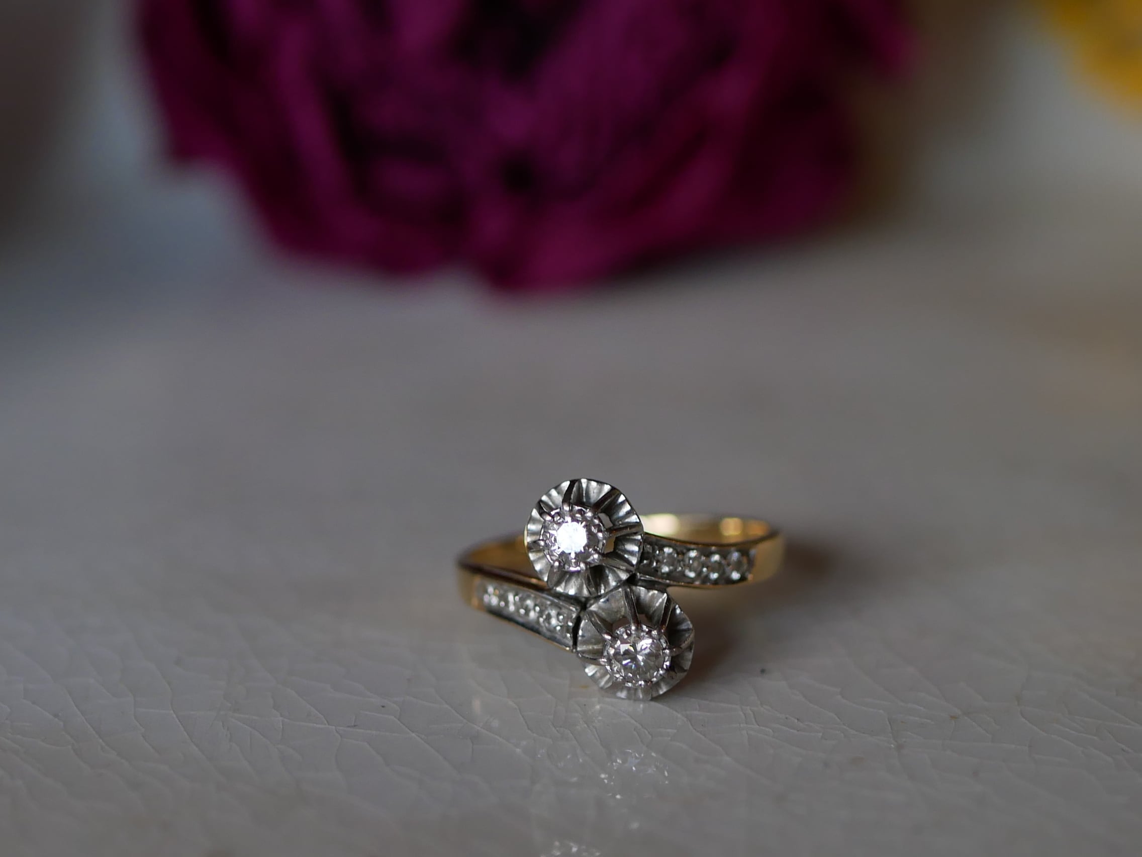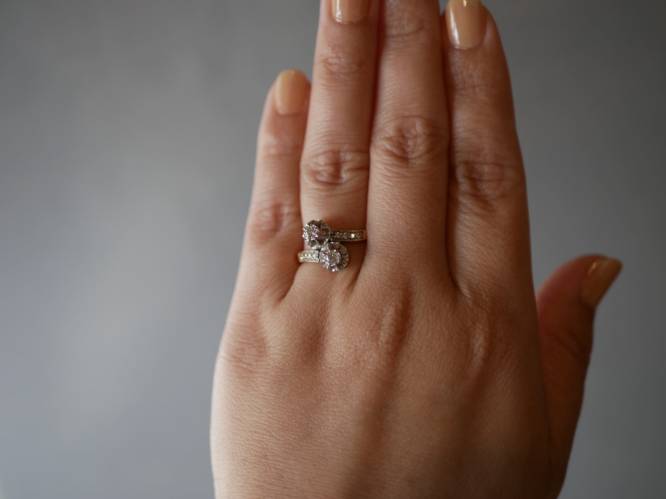 トワエモアの2石はラウンドブリリアントカット、脇石(合計8石)も同じくラウンドブリリアントカットです。高く持ち上げられた爪と枠でしっかり留められています。