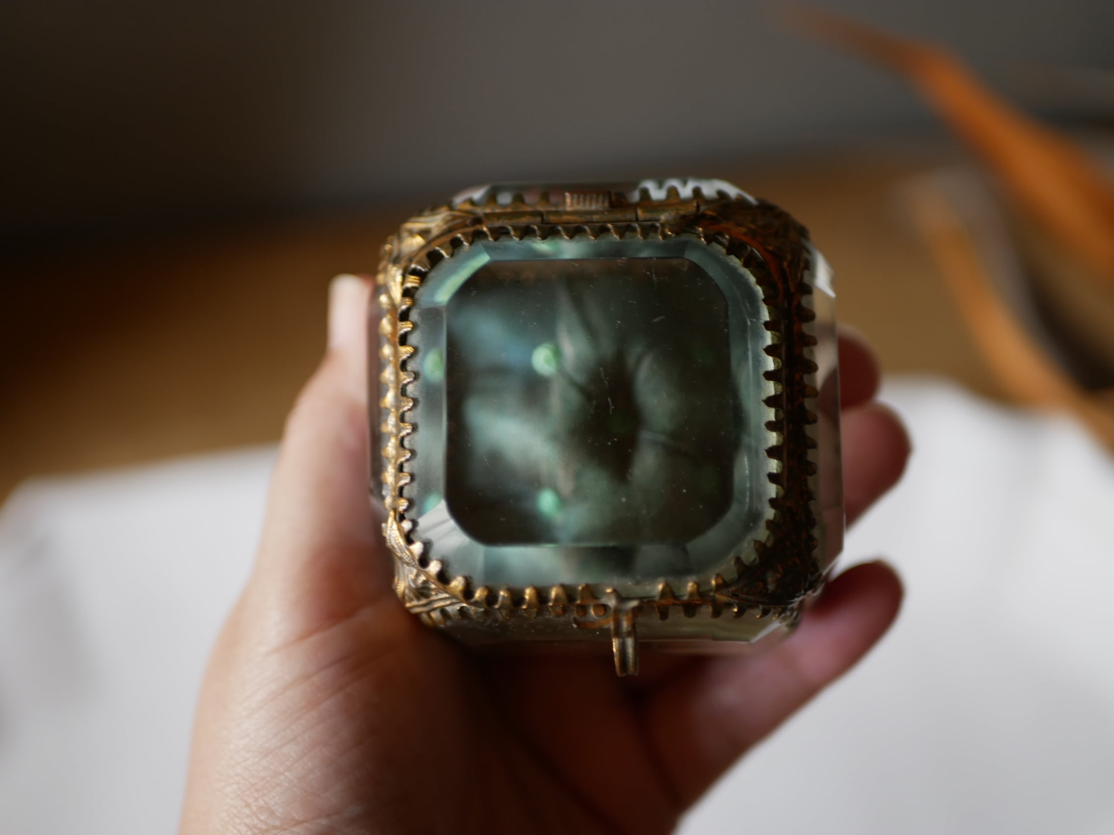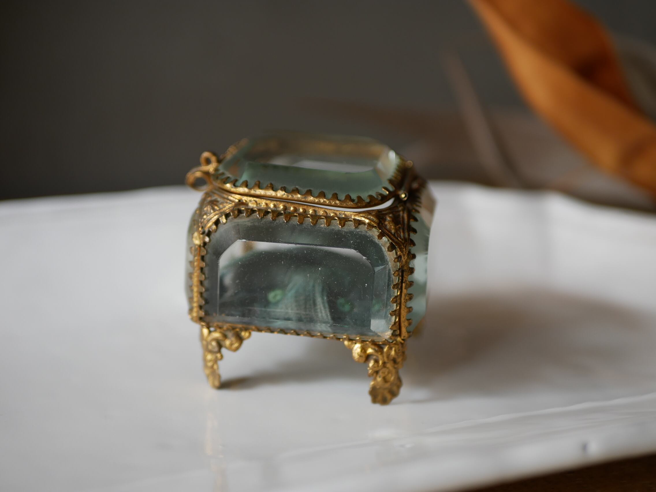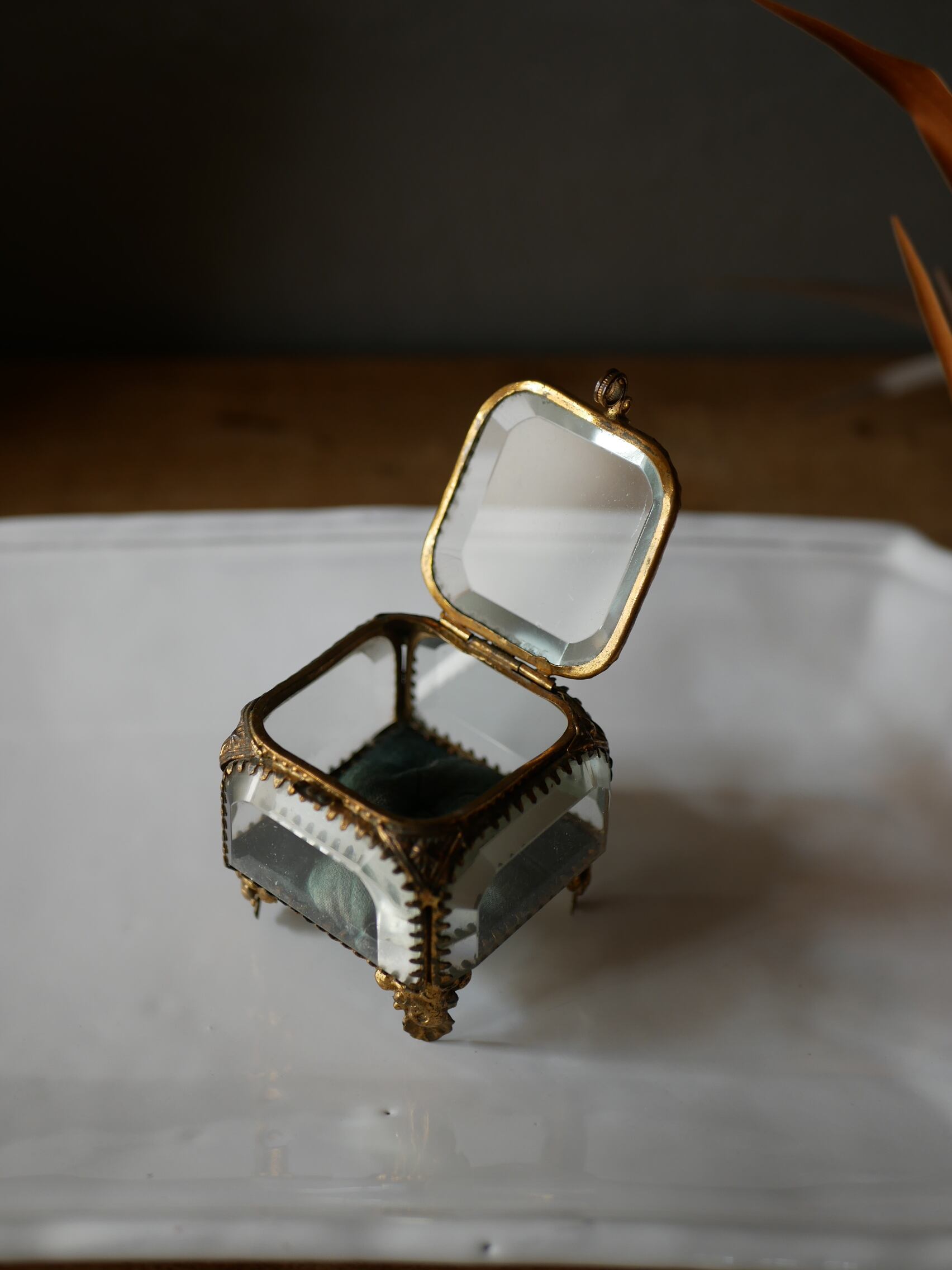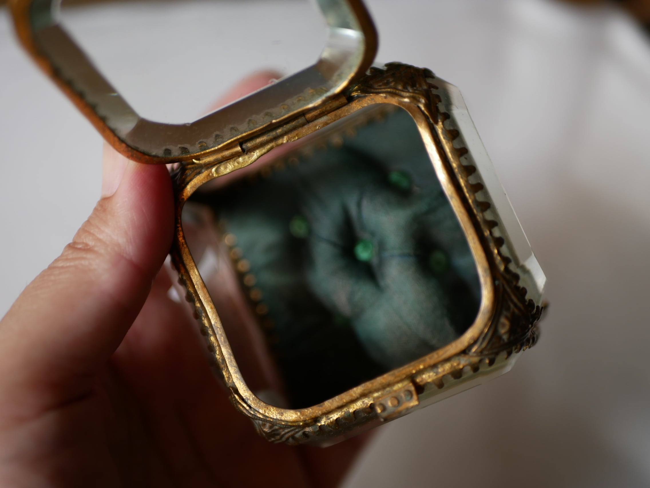 ガラスのジュエリーケース エメラルドグリーンのクッション フランスアンティーク
