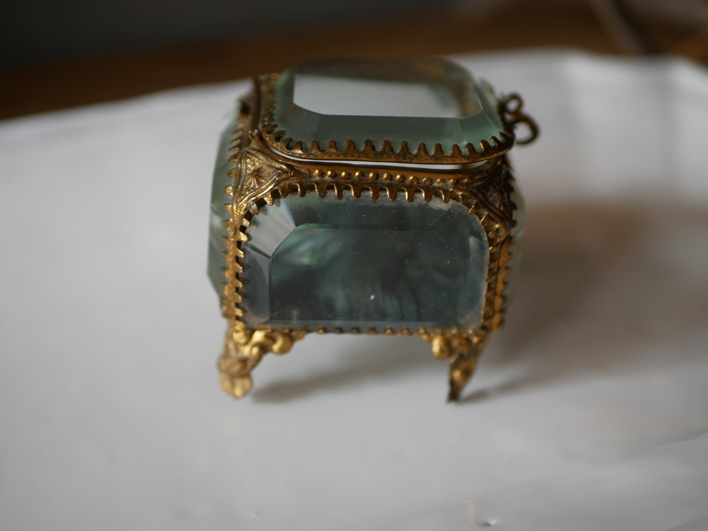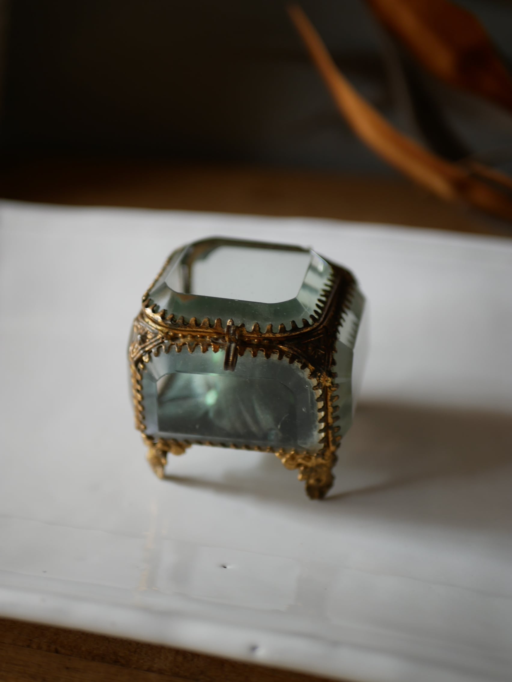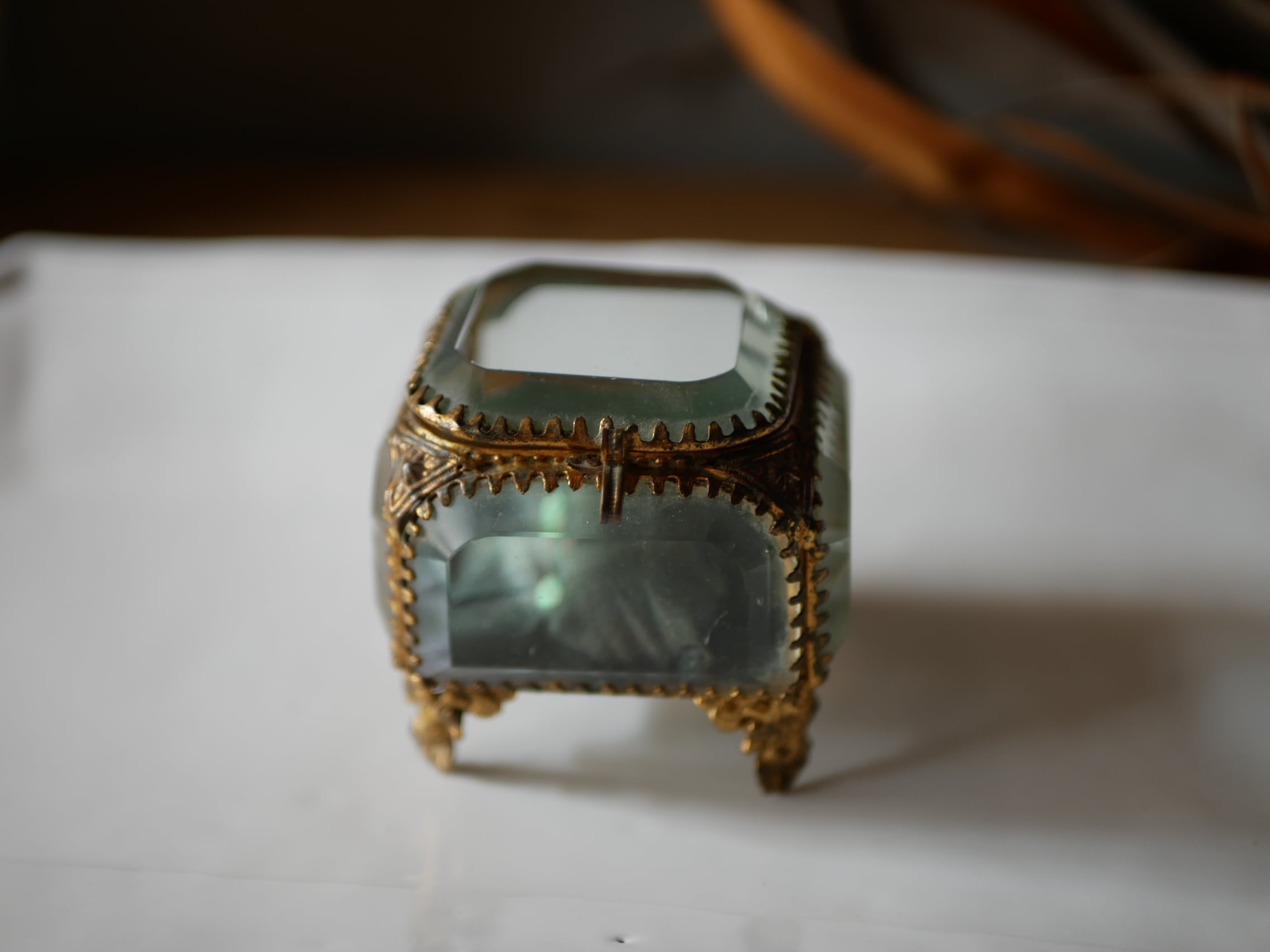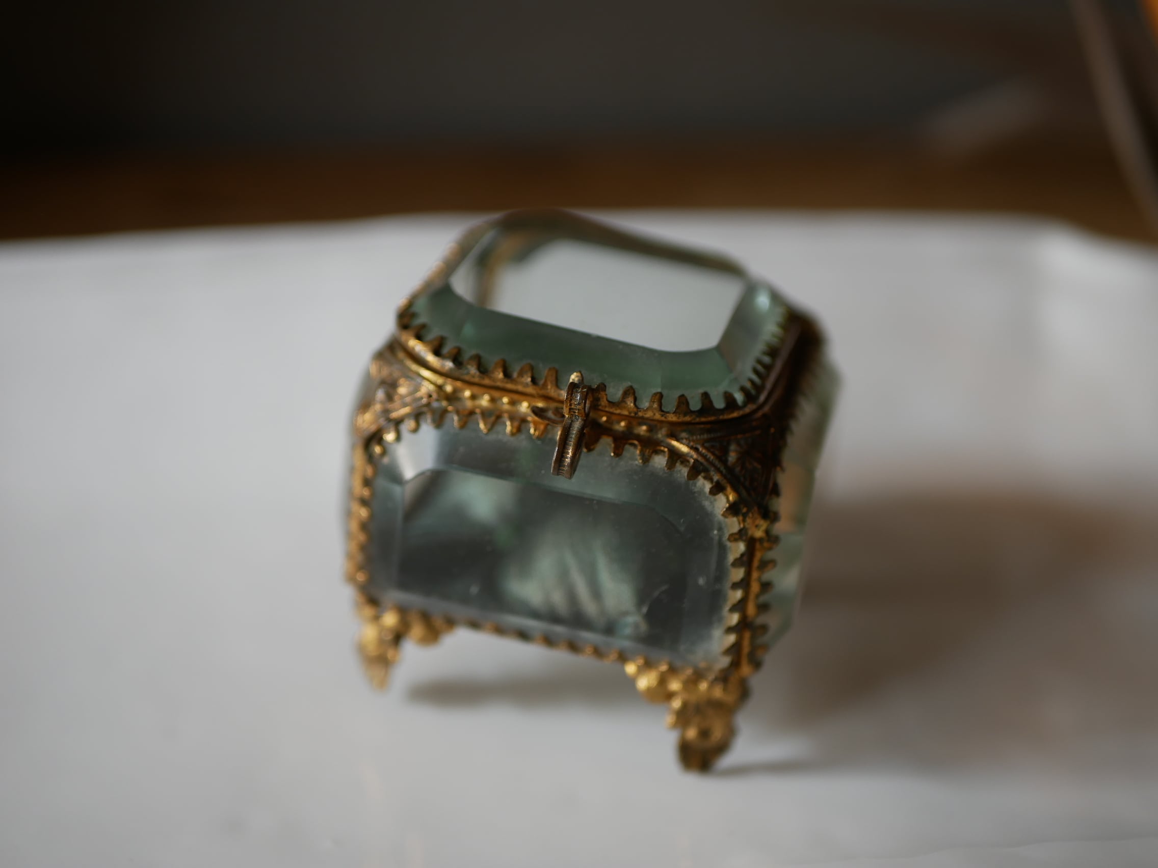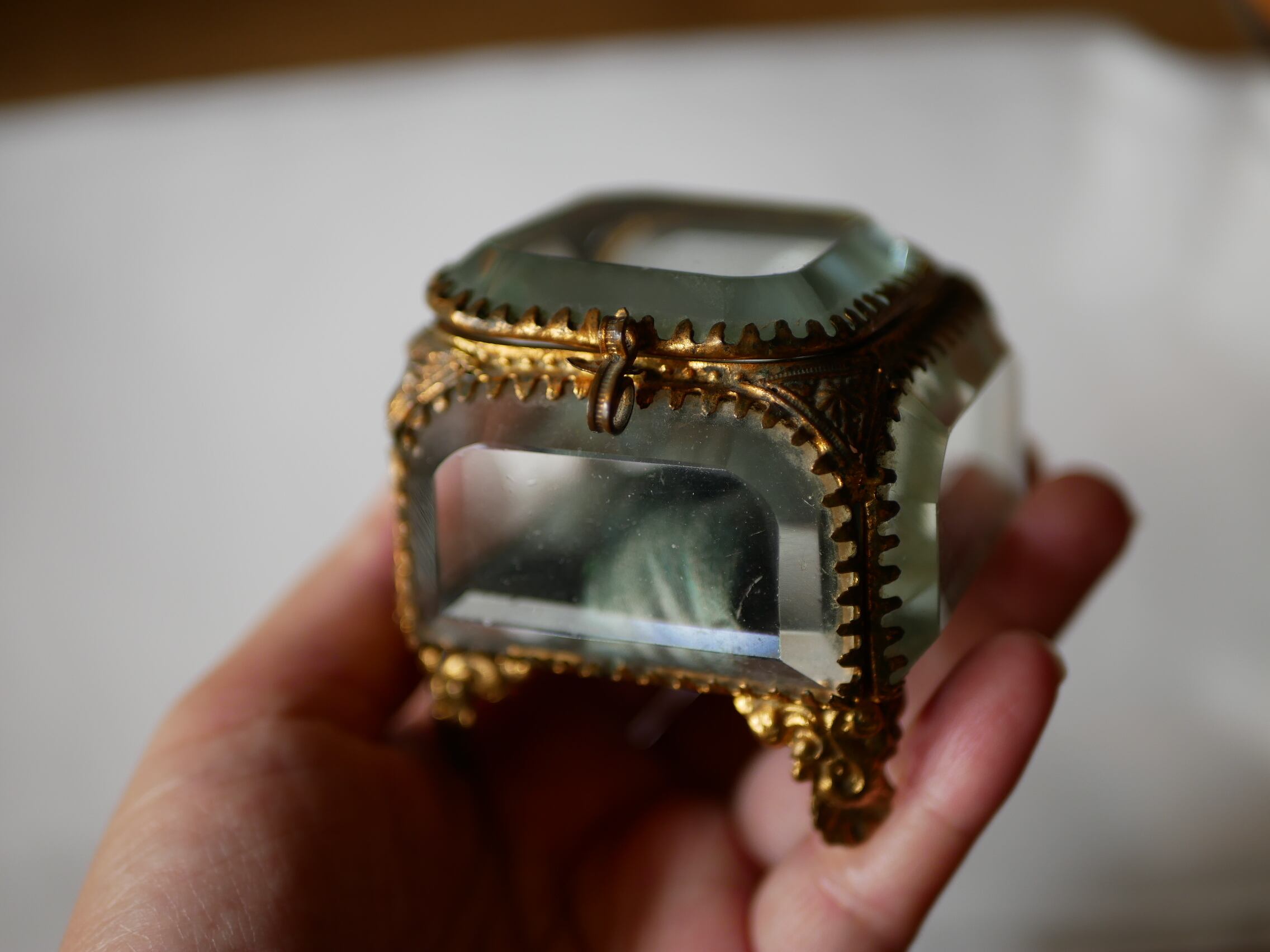 ガラスのジュエリーケース エメラルドグリーンのクッション フランスアンティーク